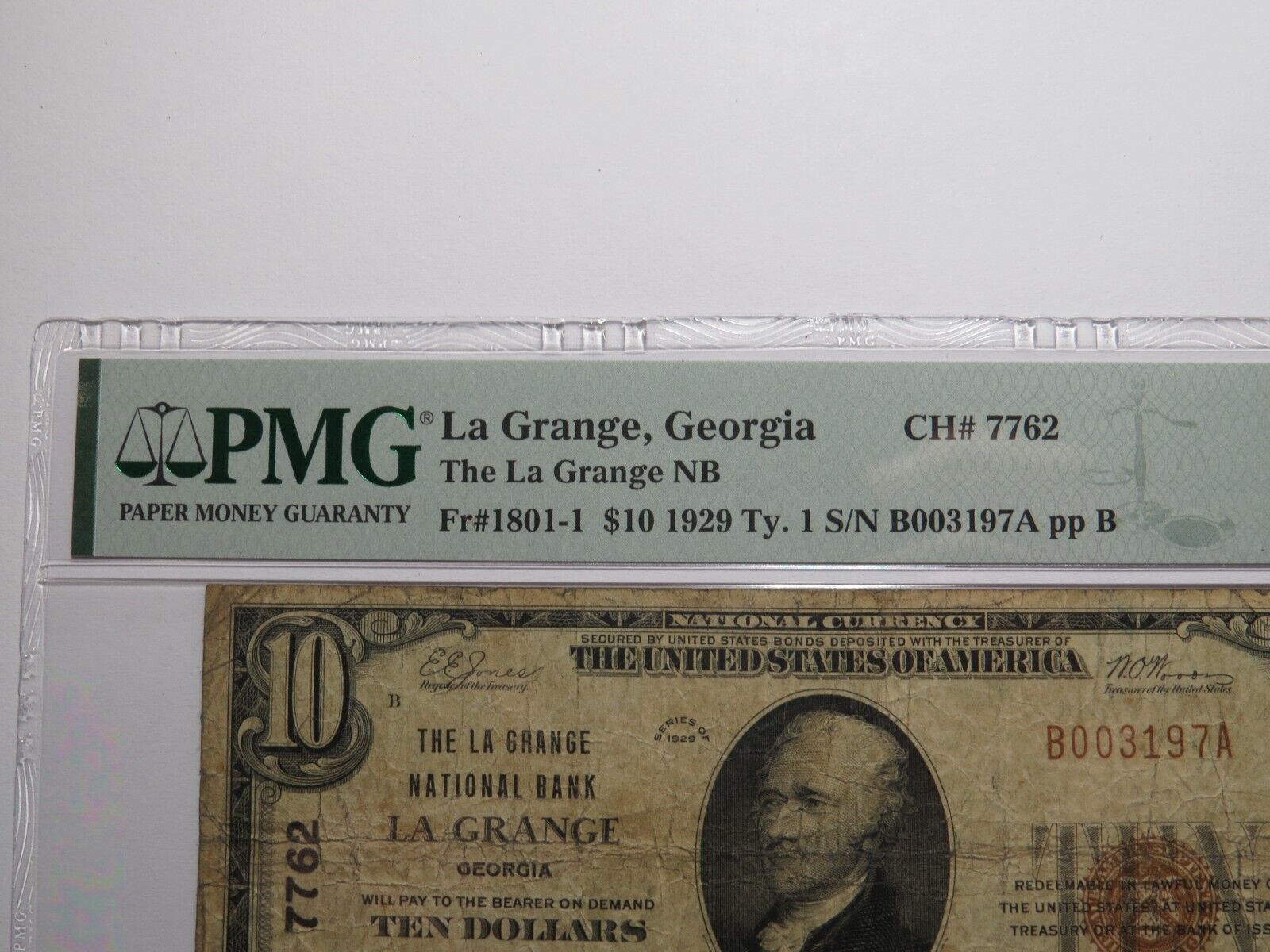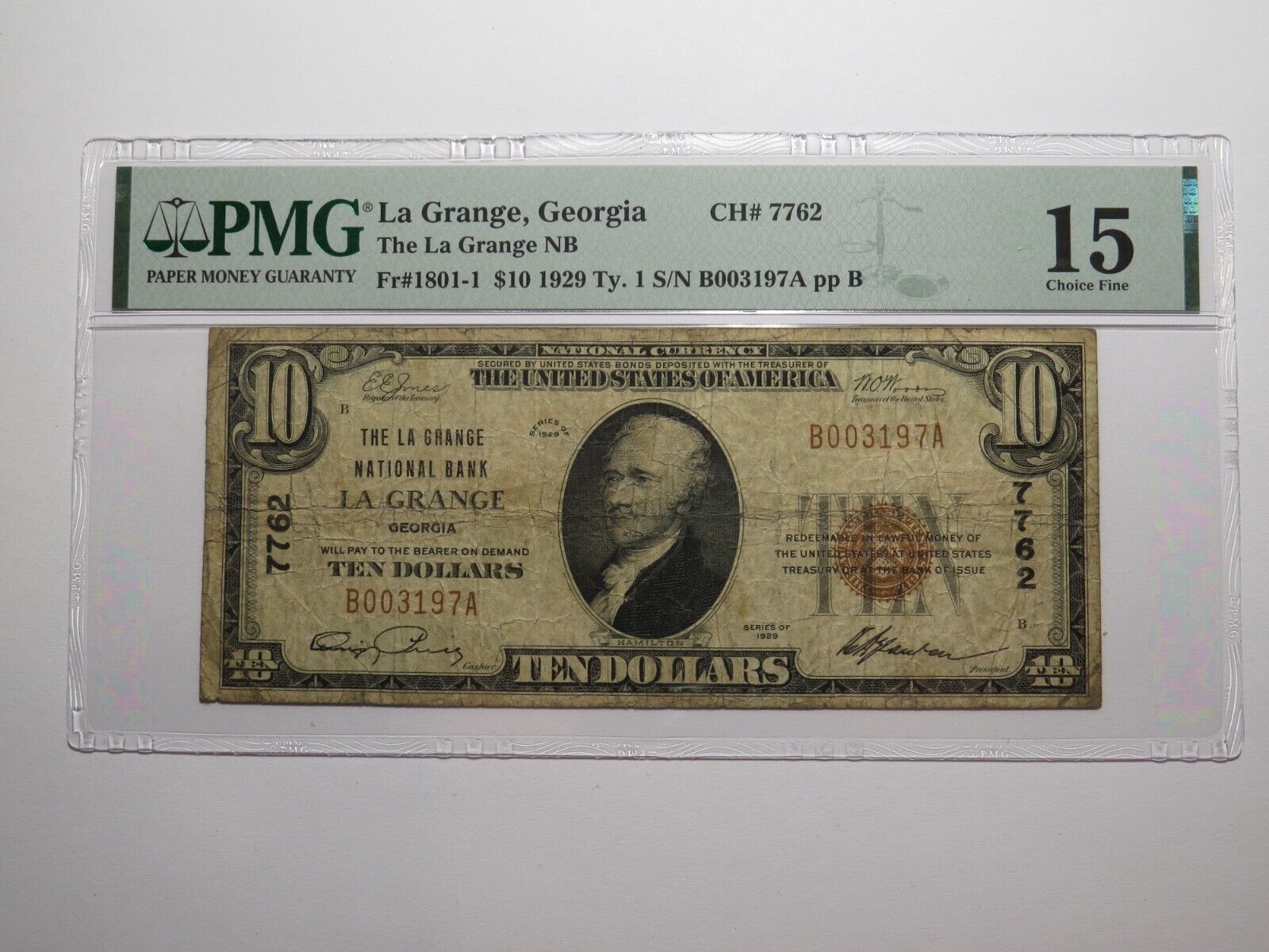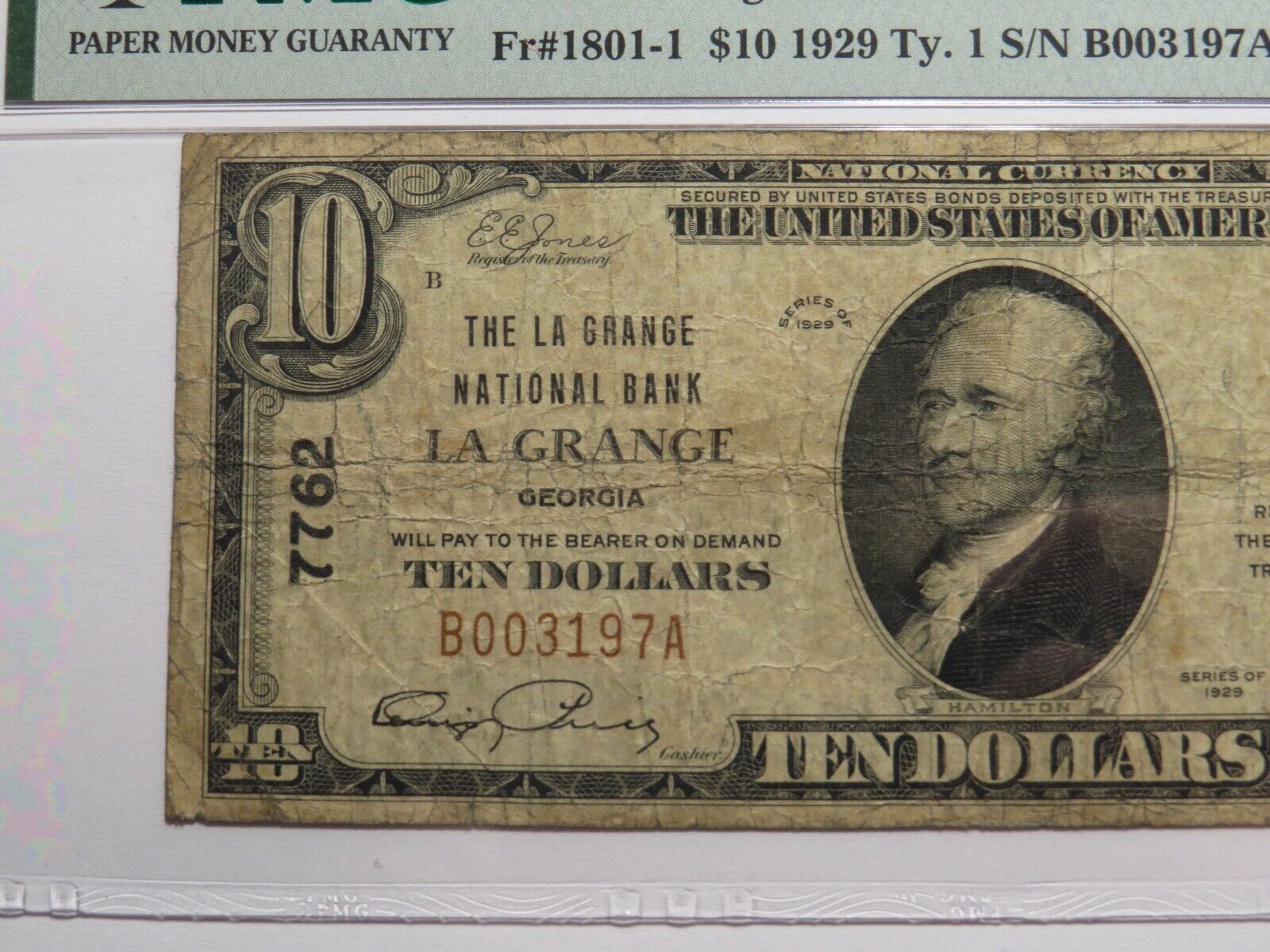 Up for auction is a $10 1929 La Grange Georgia Type 1 National Currency Note. This note was issued by The La Grange National Bank. It is Charter #7762. La Grange is a tough to find Georgia town! This note has been graded Choice Fine 15 by PMG. This is a problem free note. This bill is a must have for any collector of National Currency!