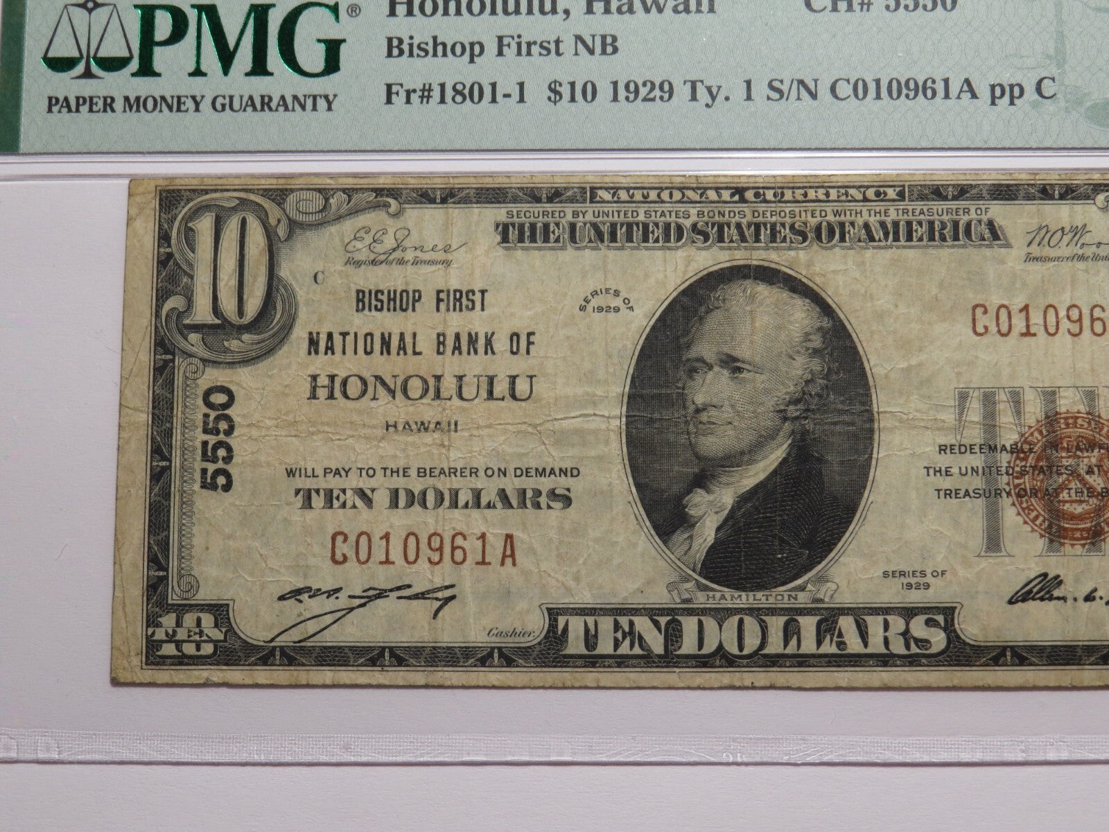 Up for auction is a $10 1929 Honolulu Hawaii National Currency Note. This note was issued by The Bishop National Bank of Honolulu. It is Charter #5550. This is the only issuing bank from Honolulu! This note has been graded Very Fine 25 by PMG. This is a problem free note! This bill is a must have for any collector of National Currency!