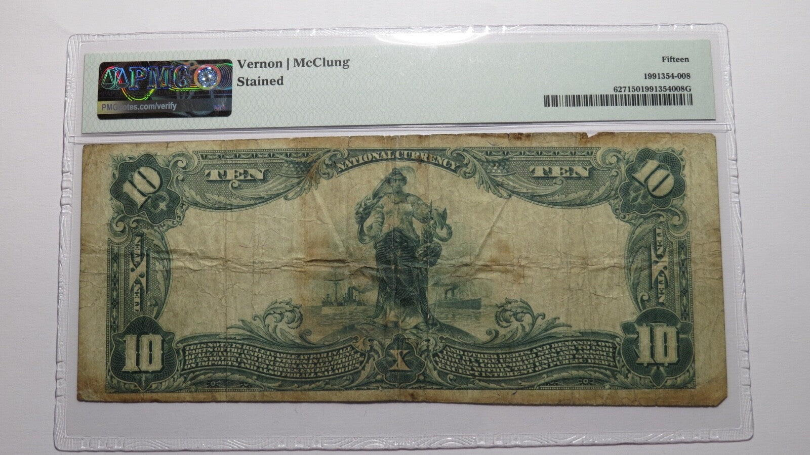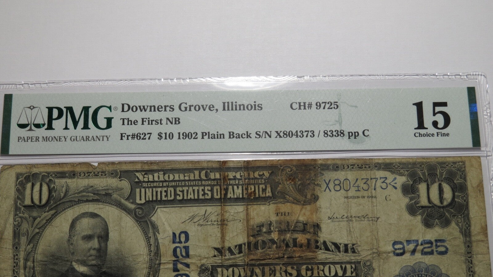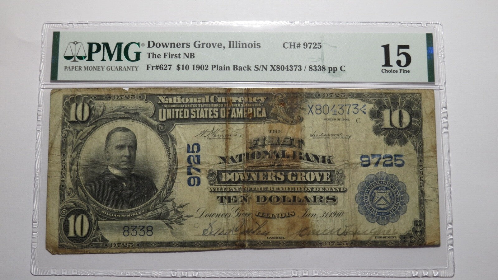 Up for auction is a $10 1902 Downers Grove Illinois National Currency Note. It is issued from The First National Bank Of Downers Grove. It is Charter #9725. This is a ONE BANK TOWN you will not find anywhere else. There are only 6 known large size notes in existence from this bank! This bill is graded Fine 15 by PMG. It is noted that this bill has staining. This bill is a must have for any collector of National Currency!