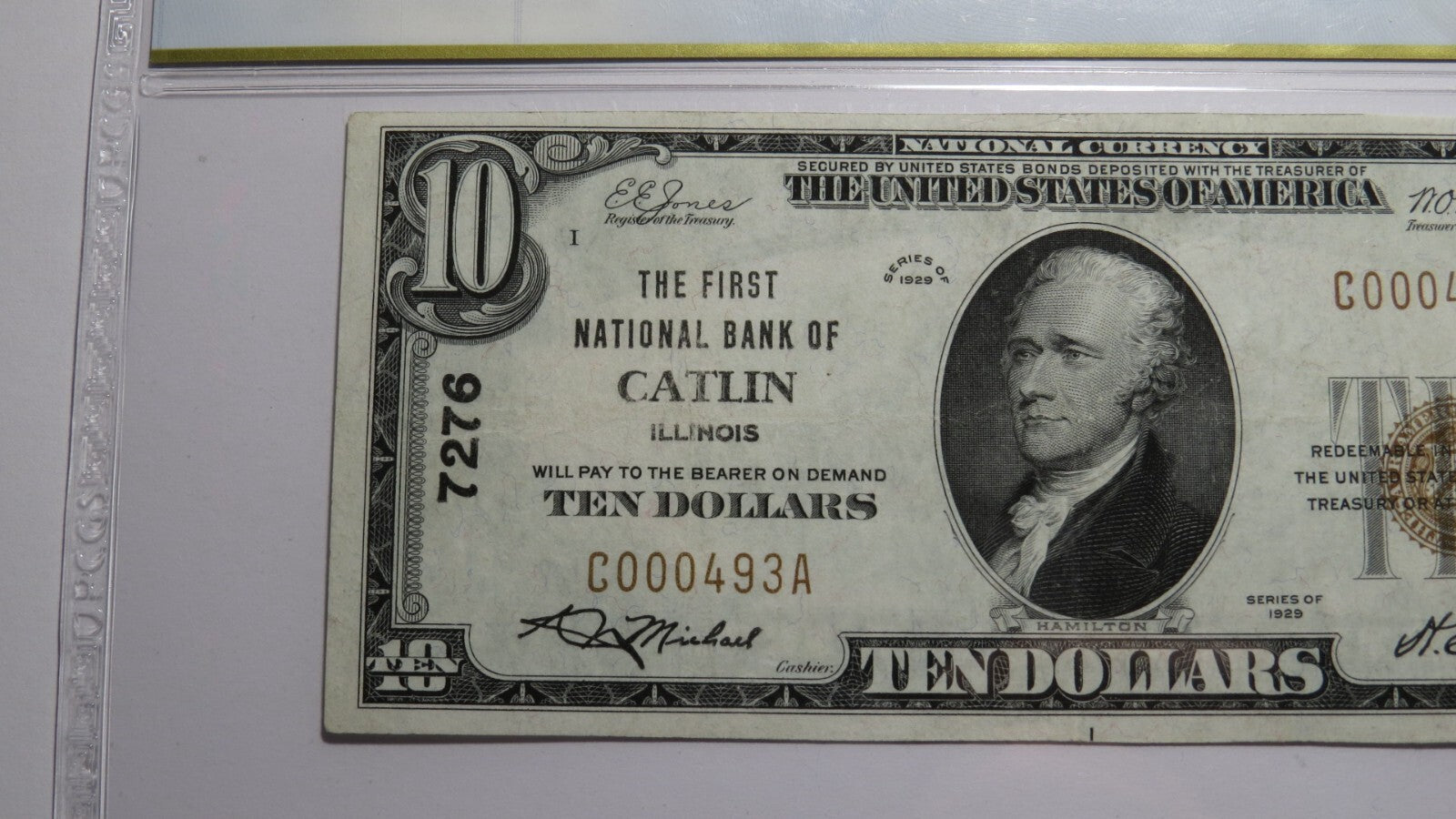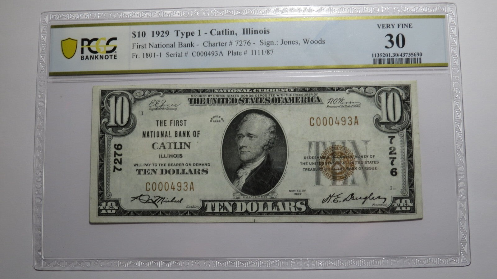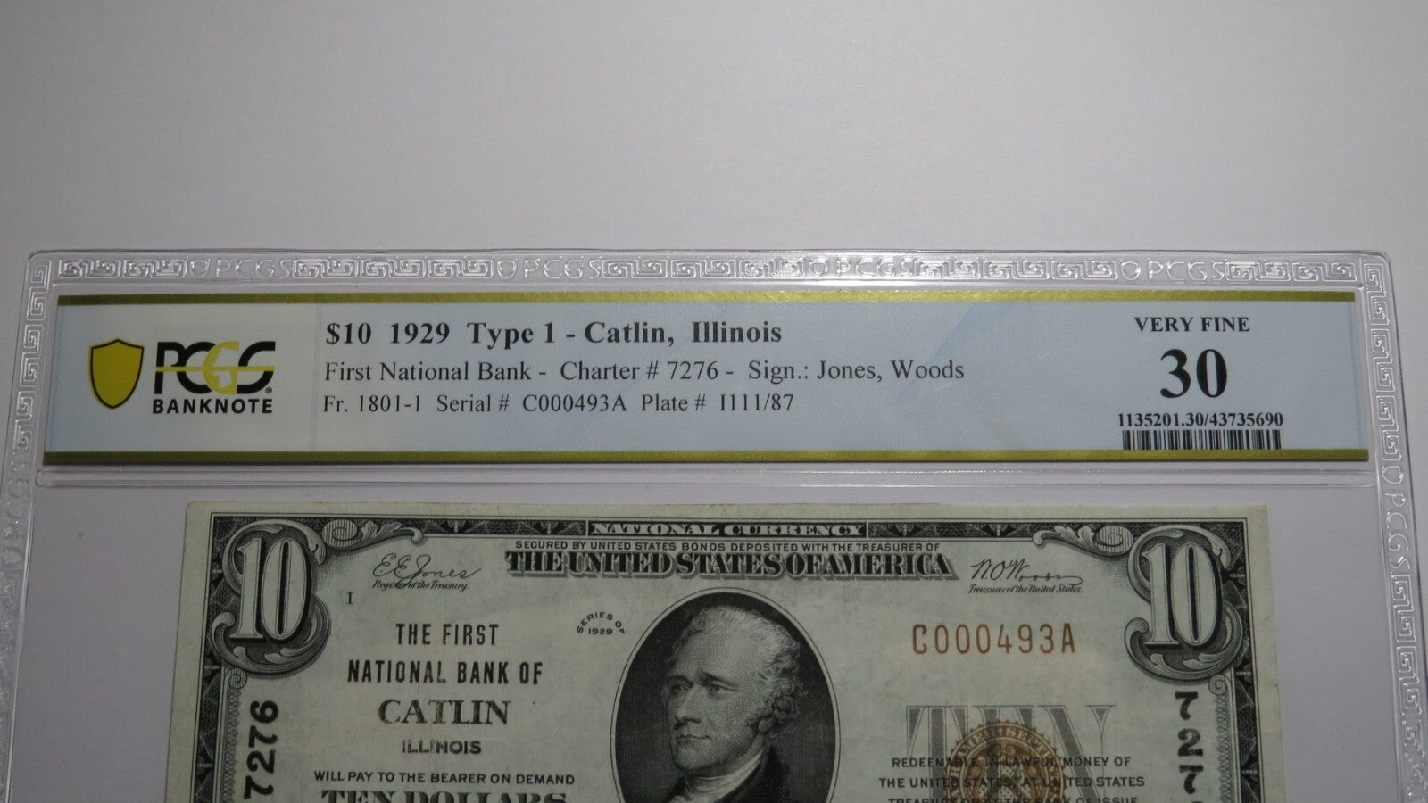 Up for auction is a $10 1929 Catlin Illinois Type 1 National Currency Note. It was issued from The First National Bank of Catlin. It is Charter #7276. This is a ONE BANK TOWN with only 9 small size notes known! This note has been graded Very Fine 30 by PCGS. There is nothing wrong with this note. This bill is a must have for any collector of National Currency!