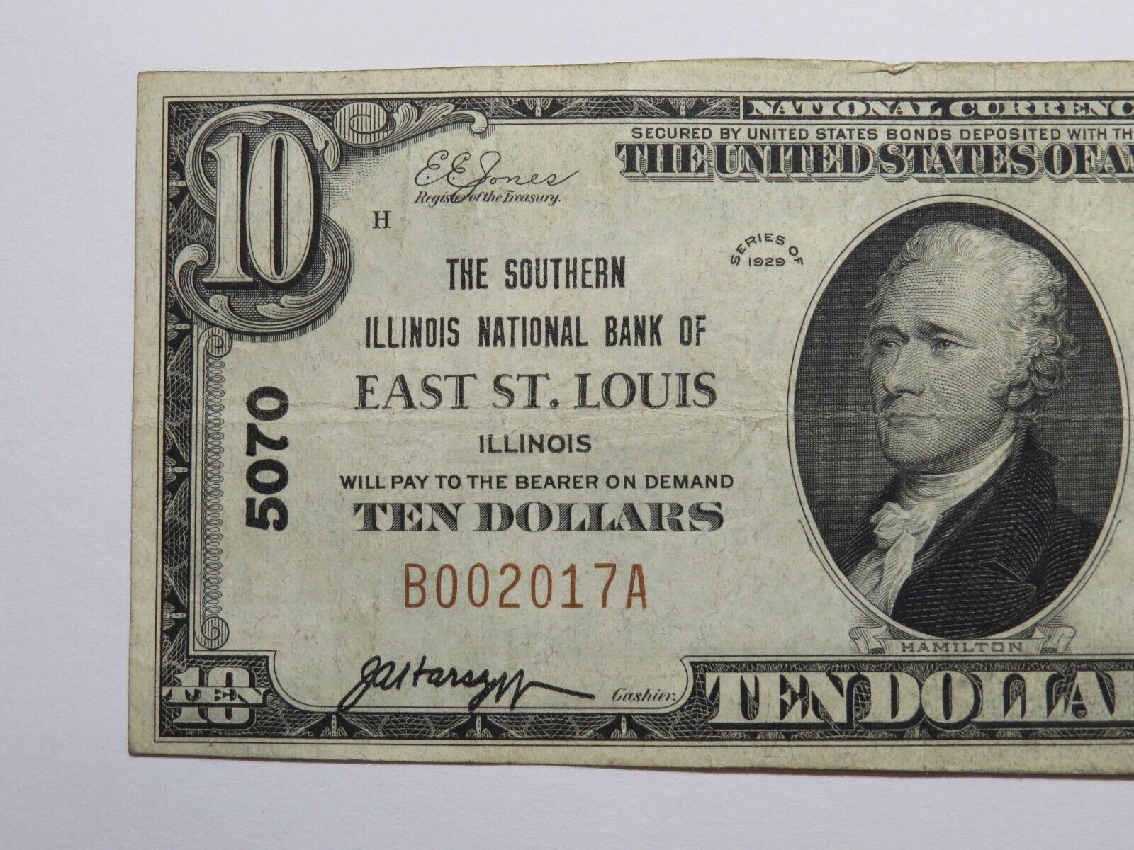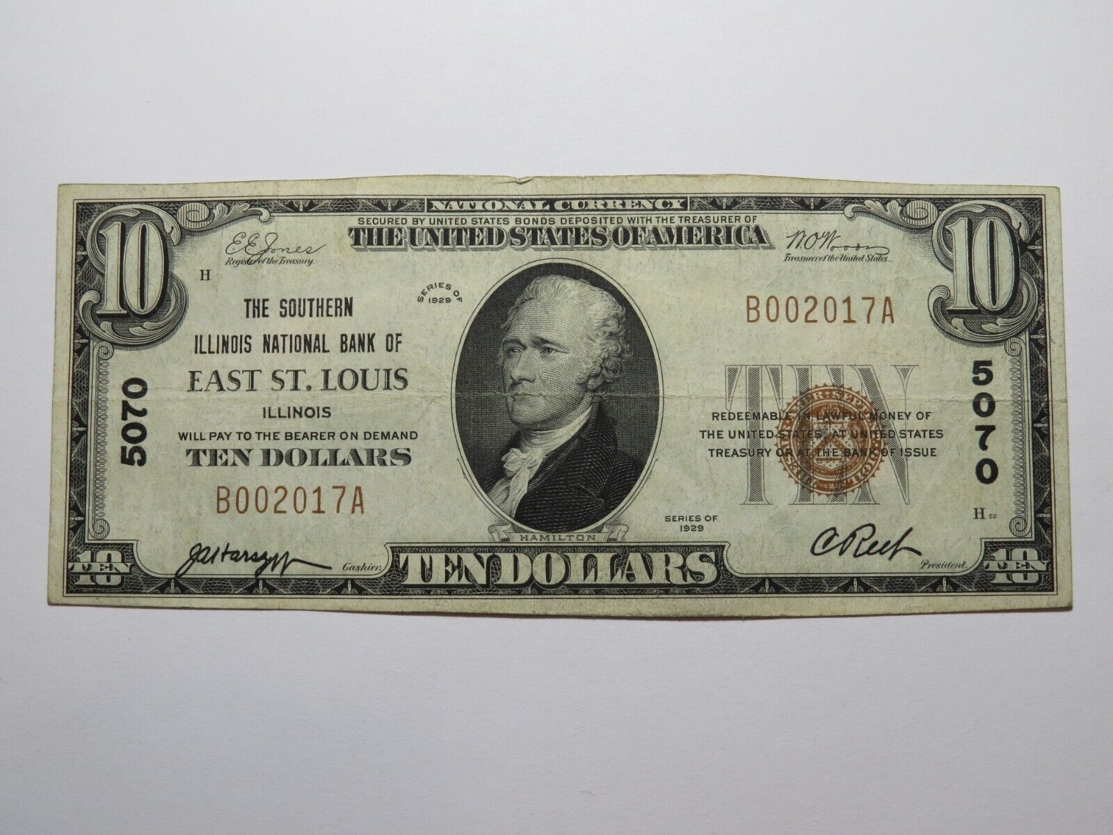 Up for auction is a $10 1929 East St. Louis Illinois Type 1 National Currency Note. This note was issued by The Southern Illinois National Bank of East St. Louis. It is Charter #5070. This is an always in demand East St. Louis Charter! This note still has a good amount of crisp left to it and is in great shape with no issues. This bill is a must have for any collector of National Currency!