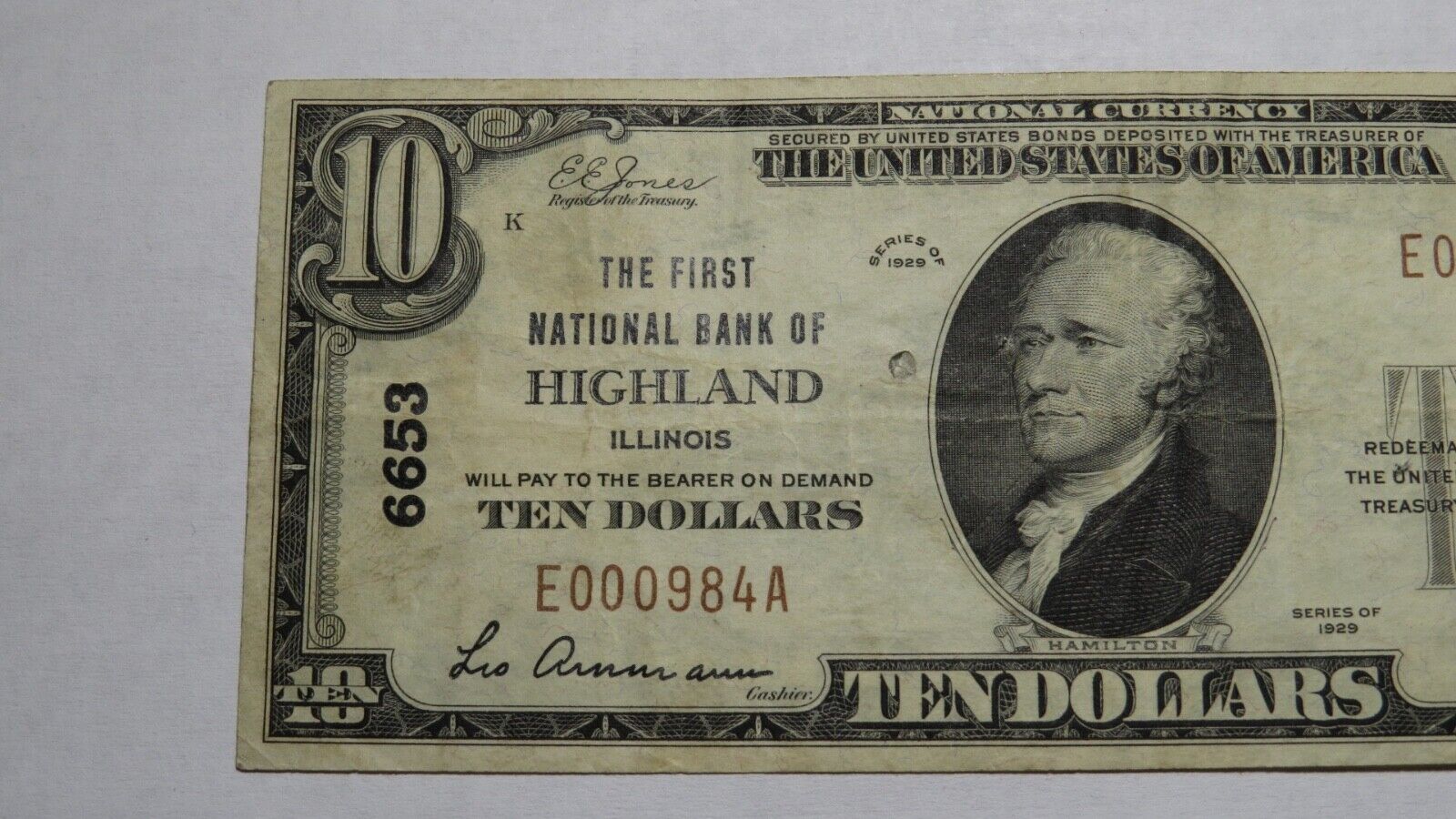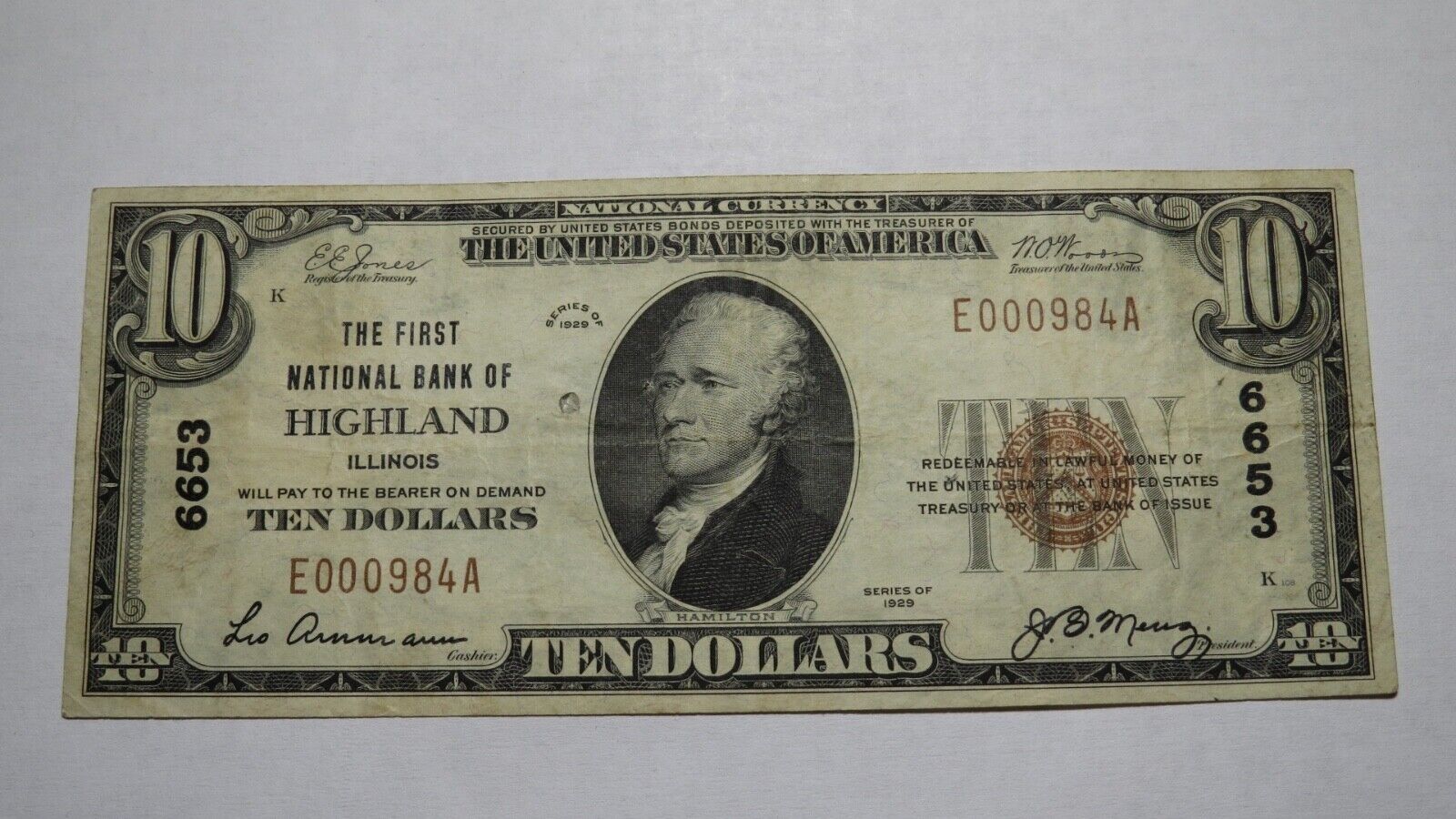 $10 1929 Type 1 Highland Illinois National Currency Note!