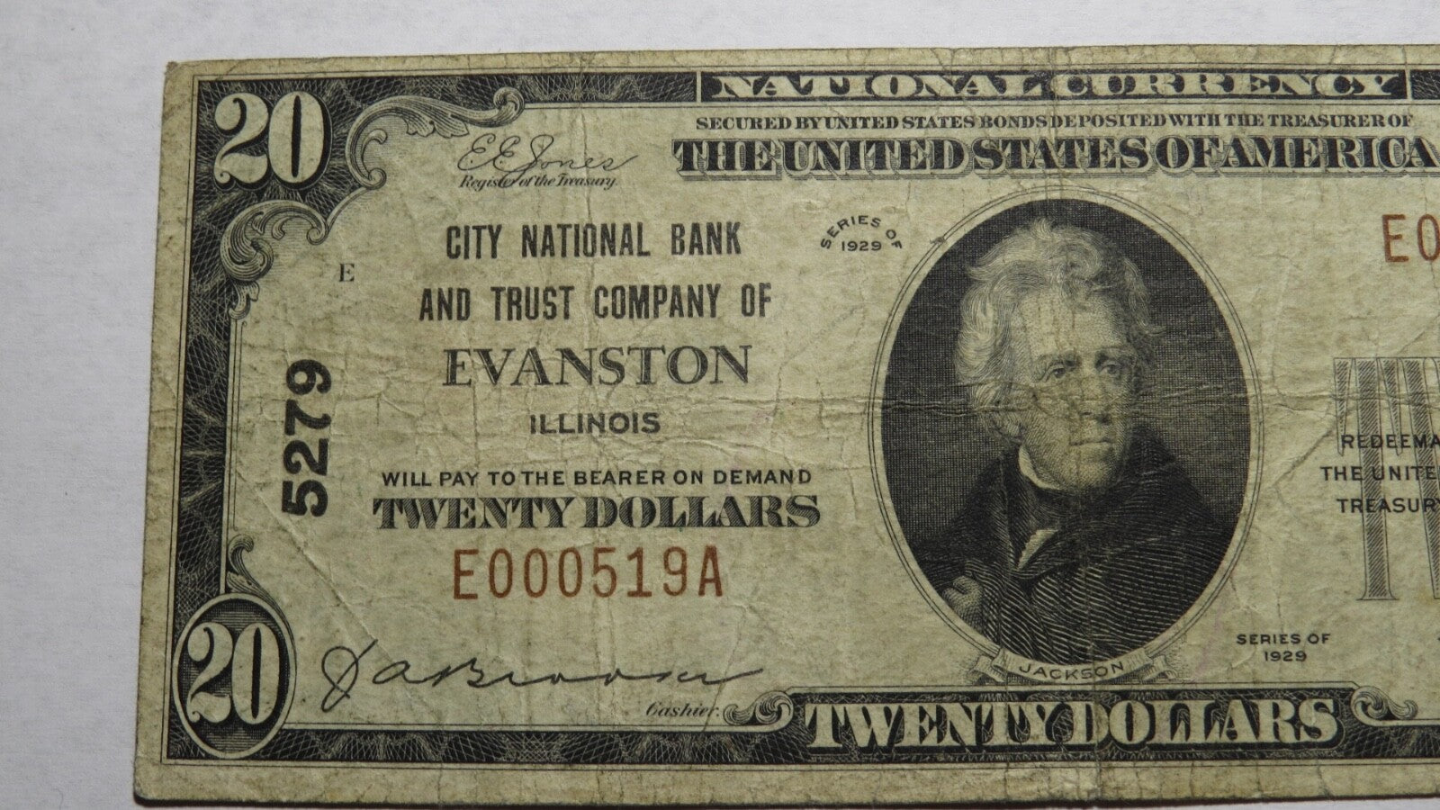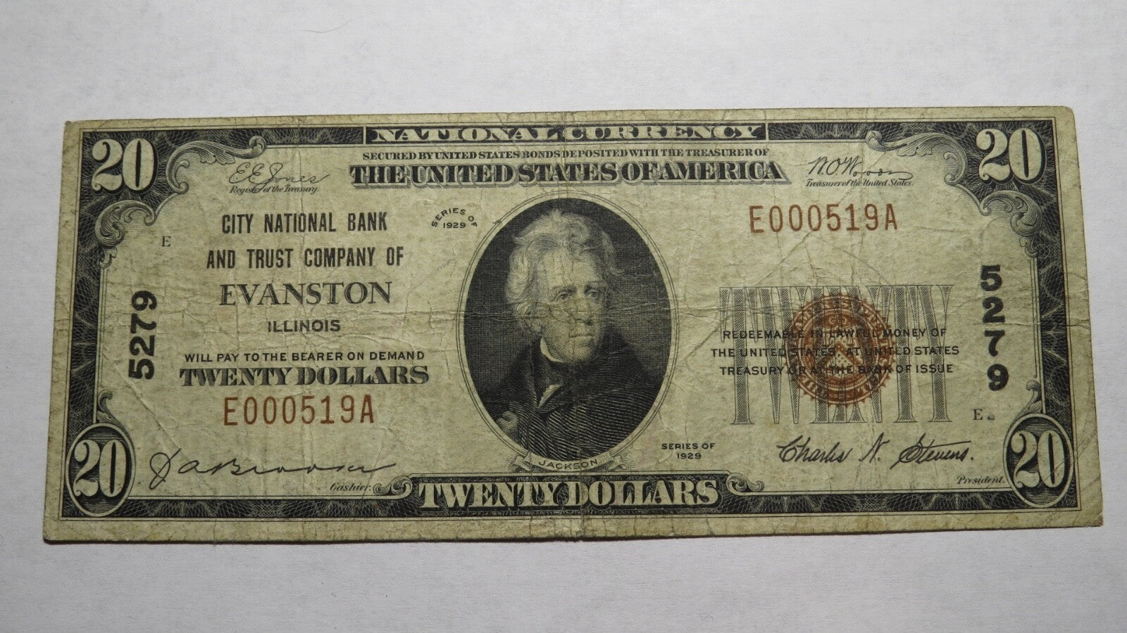 Up for auction is a $20 1929 Evanston Illinois Type 1 National Currency Note.  It is issued from The City National Bank And Trust Company Of Evanston.  It is Charter #5279.  Evanston is a very hard to find Illinois Town that you will not see for sale anywhere else!  This note has a good amount of crisp left to it and is in good shape but it does have two minor pinholes (only visible under a light source).  This bill is a must have for any collector of National Currency!