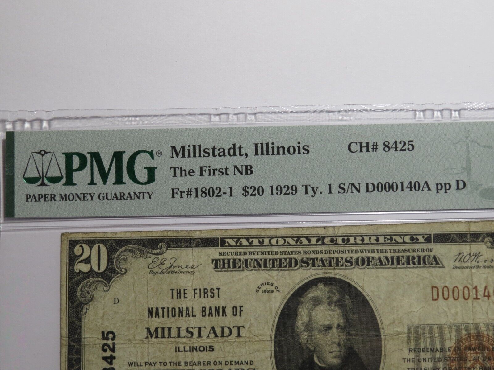 Up for auction is a $20 1929 Millstadt Illinois Type 1 National Currency Note. This note was issued by The First National Bank of Millstadt. It is Charter #8425. This is a ONE BANK TOWN! This bill has been graded Very Fine 20 by PMG. This is a problem free note. This bill is a must have for any collector of National Currency!