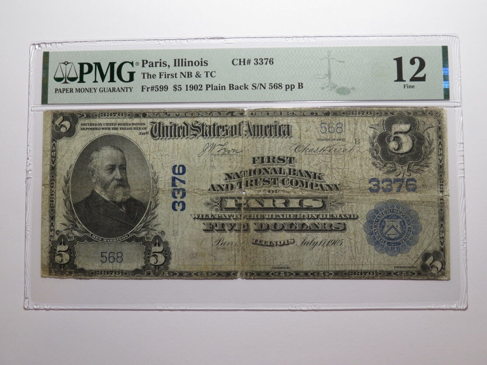 Up for auction is a $5 1902 Paris Illinois Plain Back National Currency Note. This note was issued by The First National Bank and Trust Company of Paris. It is Charter #3376. This is a tough to find Paris Charter. This is the only known Large Size note with the 2nd Title from this Charter! This bill has been graded Fine 12 by PMG. It is a problem free note. This bill is a must have for any collector of National Currency!