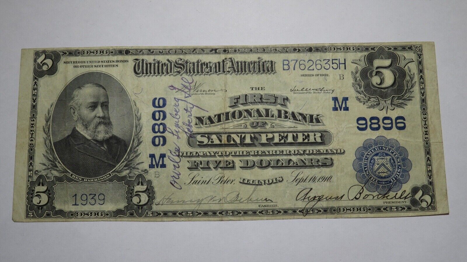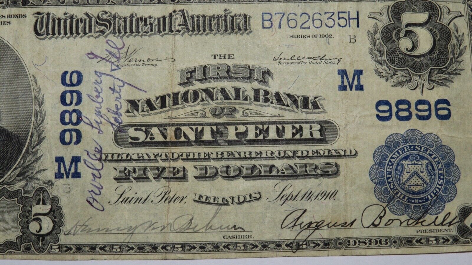 Up for auction is a $5 1902 Saint Peter Plain Back National Currency Note. It is issued from The First National Bank of Saint Peter. It is Charter #9896. This is a ONE BANK TOWN you will not find anywhere else! This note has a ton of crisp left to it and is in great shape. There is a courtesy signature on the front of this bill. This bill is a must have for any collector of National Currency!