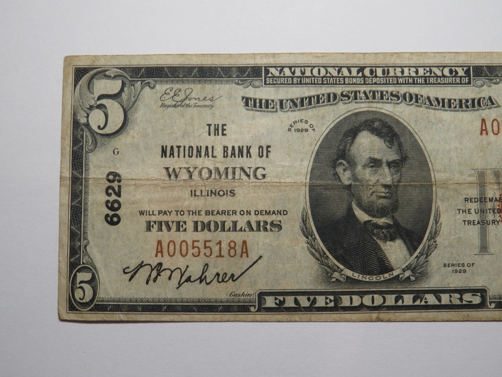 Up for auction is a $5 1929 Wyoming Illinois Type 1 National Currency Note. This note was issued by The National Bank of Wyoming. It is Charter #6629. This is a ONE BANK TOWN for small size notes! This note has some crisp left to it and is in great condition with no issues. This bill is a must have for any collector of National Currency!