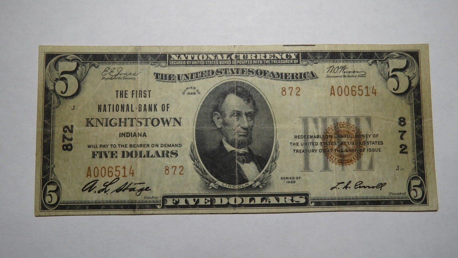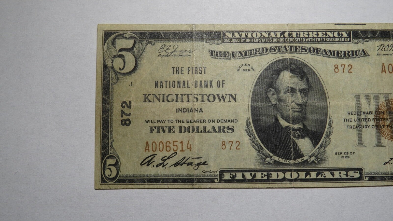 $5 1929 Knightstown Indiana IN National Currency Bank Note Bill! Ch. #872 FINE+
