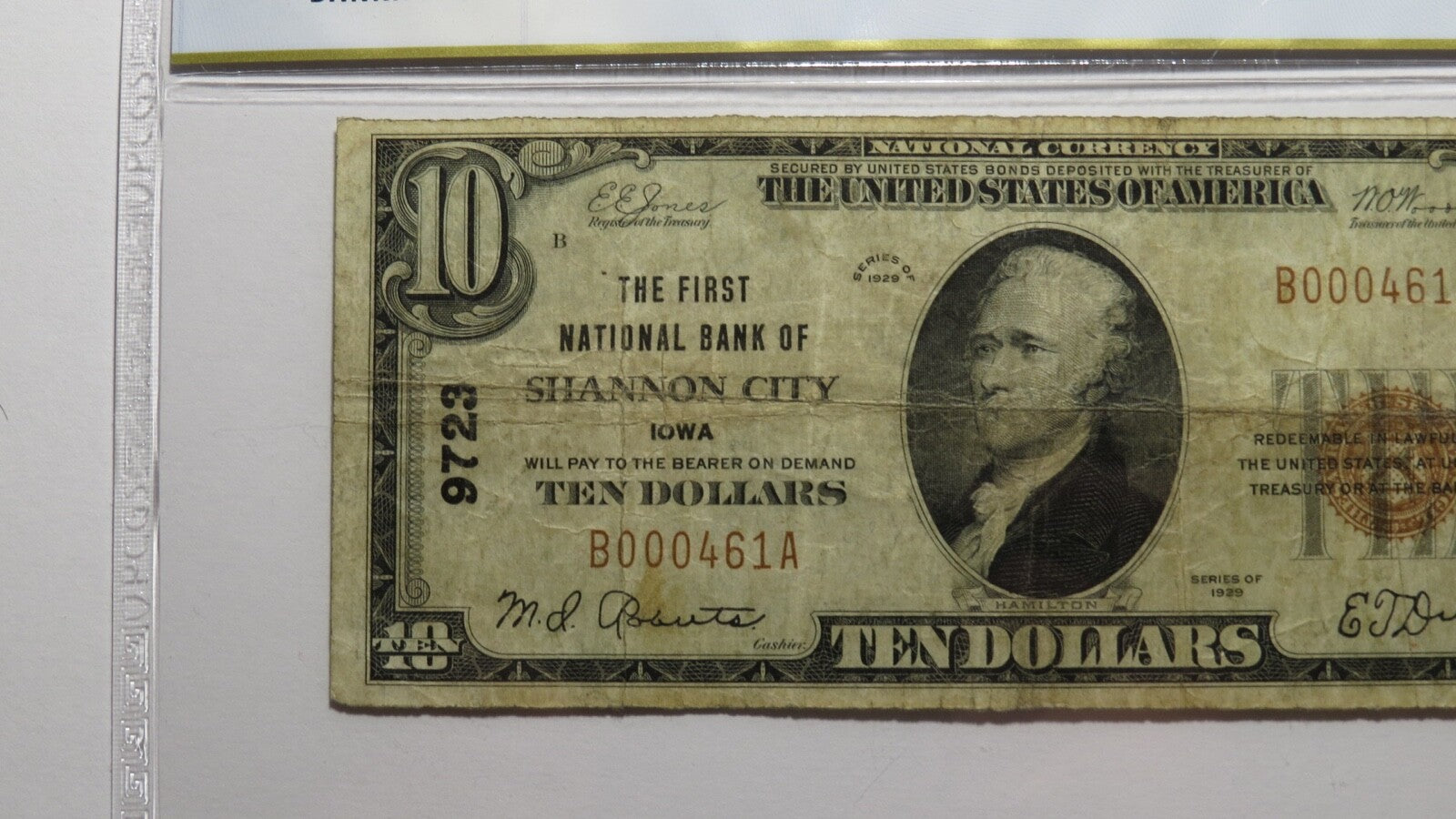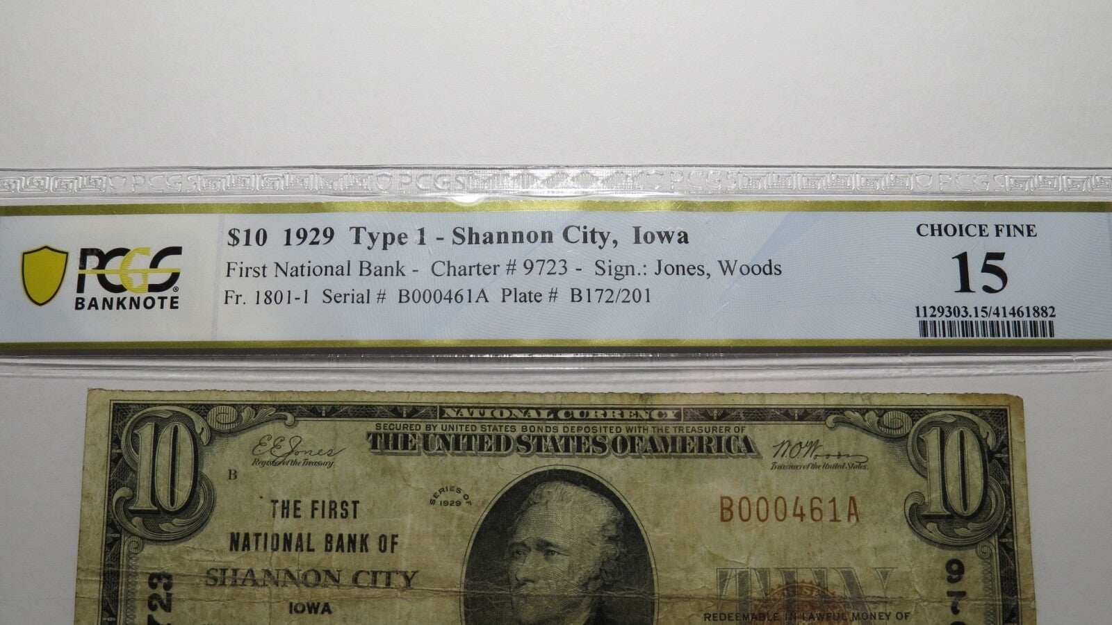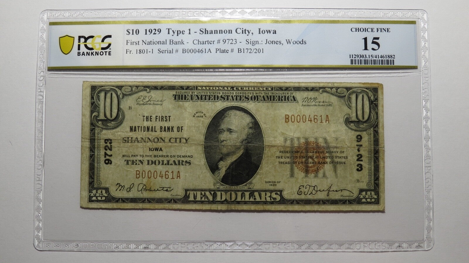 Up for auction is a $10 1929 Shannon City Iowa Type 1 National Currency Note. It is issued from The First National Bank of Shannon City. It is Charter #9723. This is a ONE BANK TOWN! This note is graded Choice Fine 15 by PCGS. There is nothing wrong with this note! This bill is a must have for any collector of National Currency!