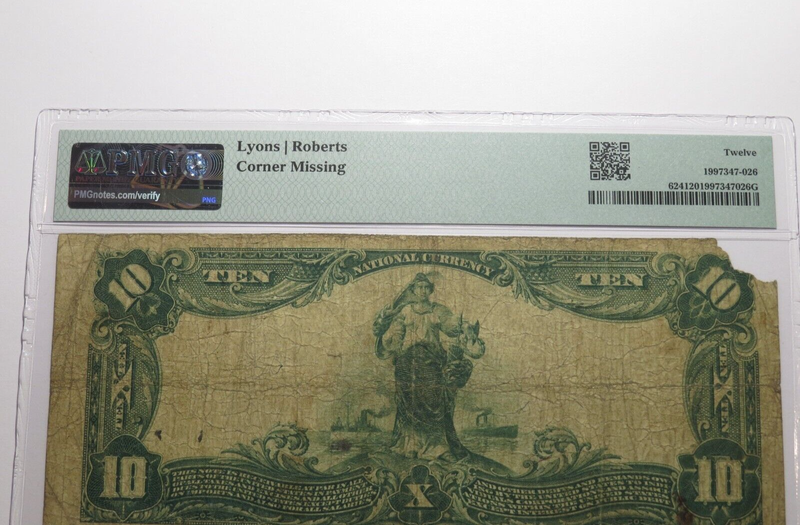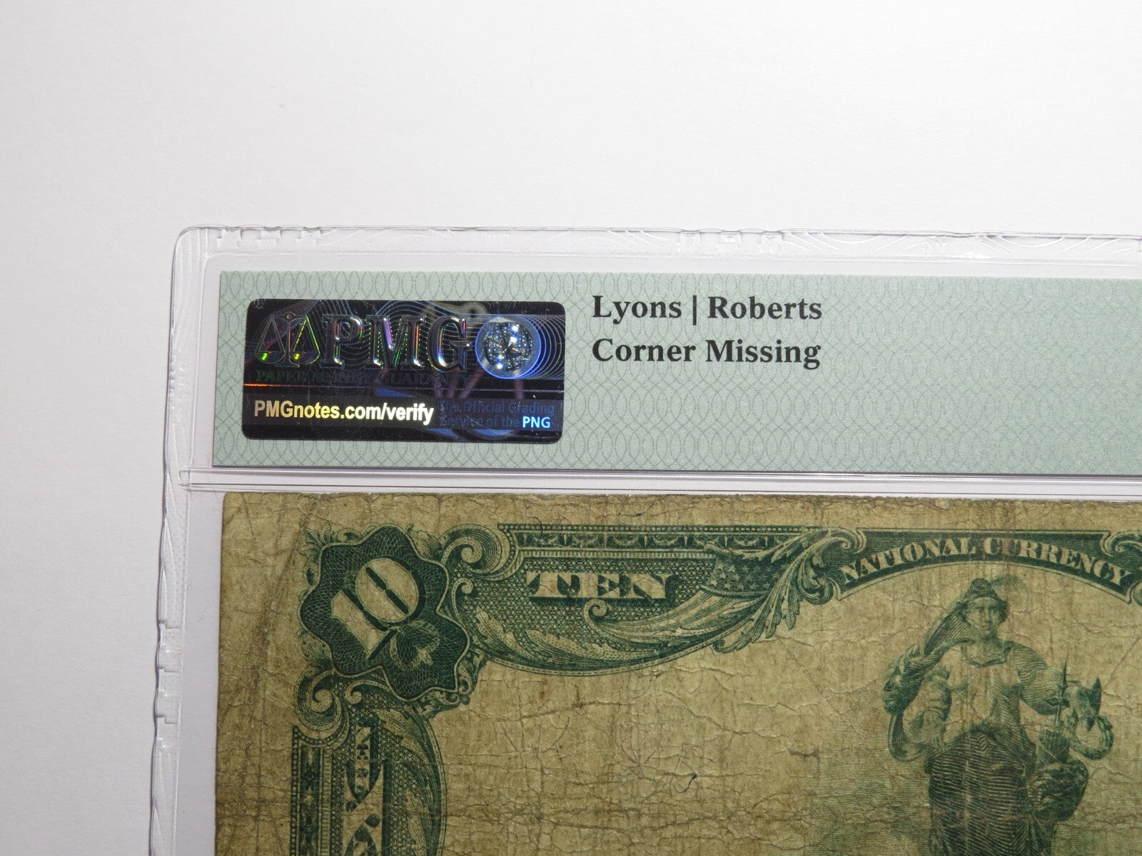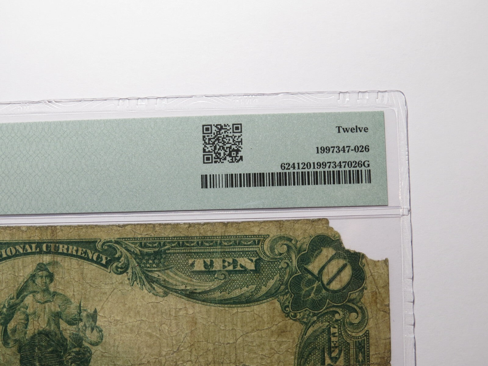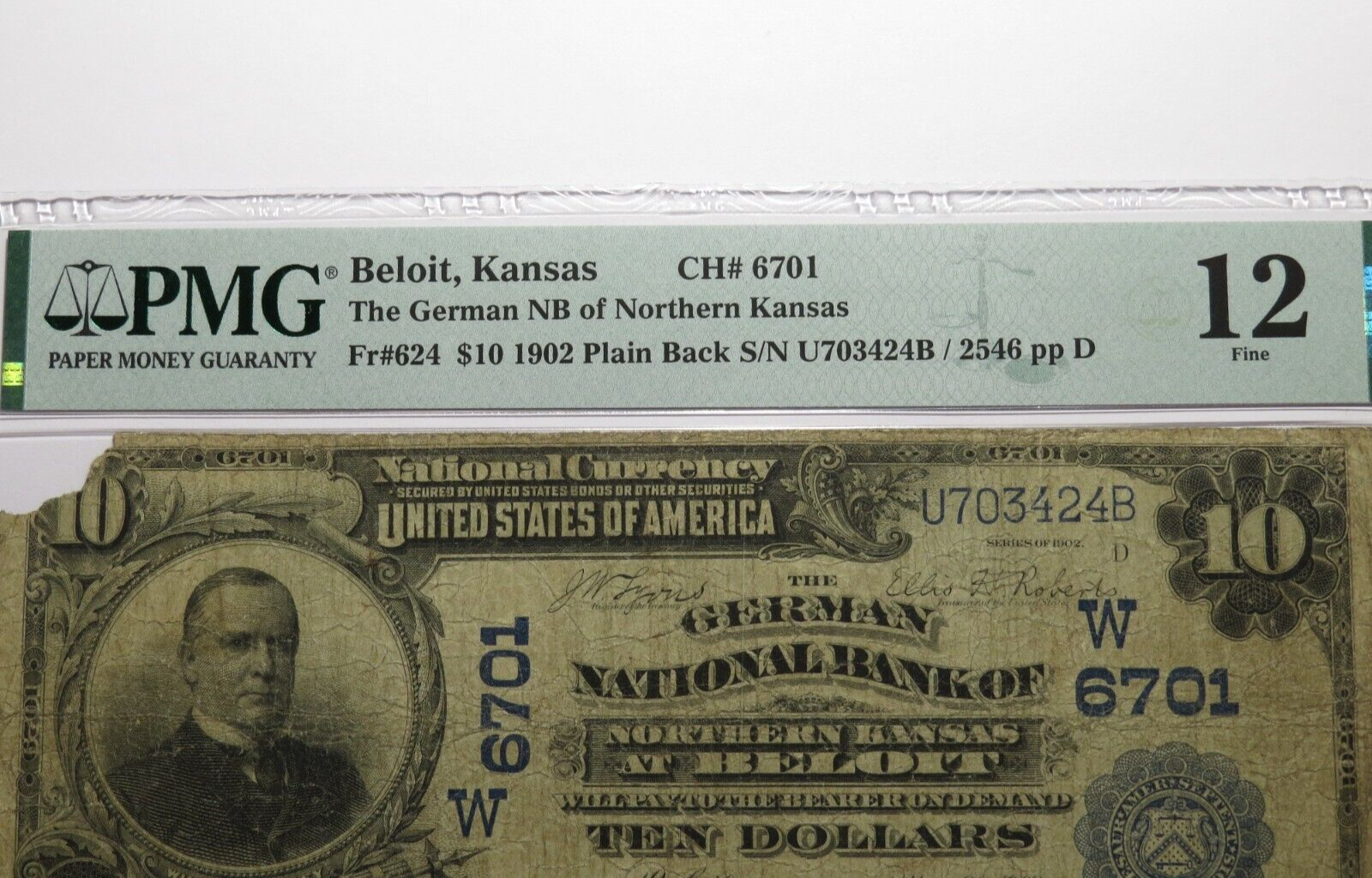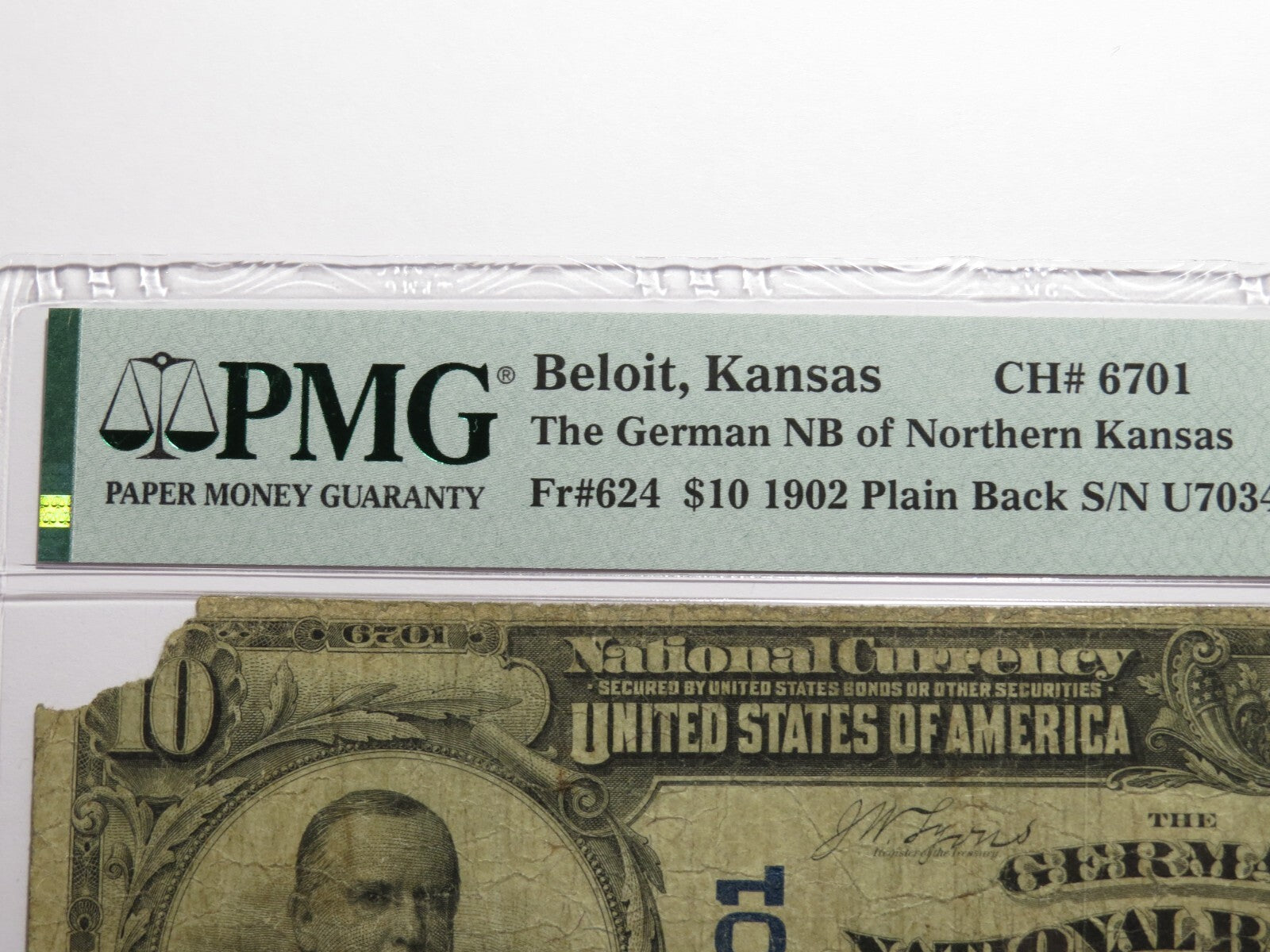 Up for auction is a $10 1902 Beloit Kansas Plain Back National Currency Note.  This note was issued by The German National Bank of Northern Kansas At Beloit.  It is Charter #6701.  This is an extremely difficult Beloit Charter to find!  This note has been graded Fine 12 by PMG.  The upper left corner of the note is missing.  This bill is a must have for any collector of National Currency!