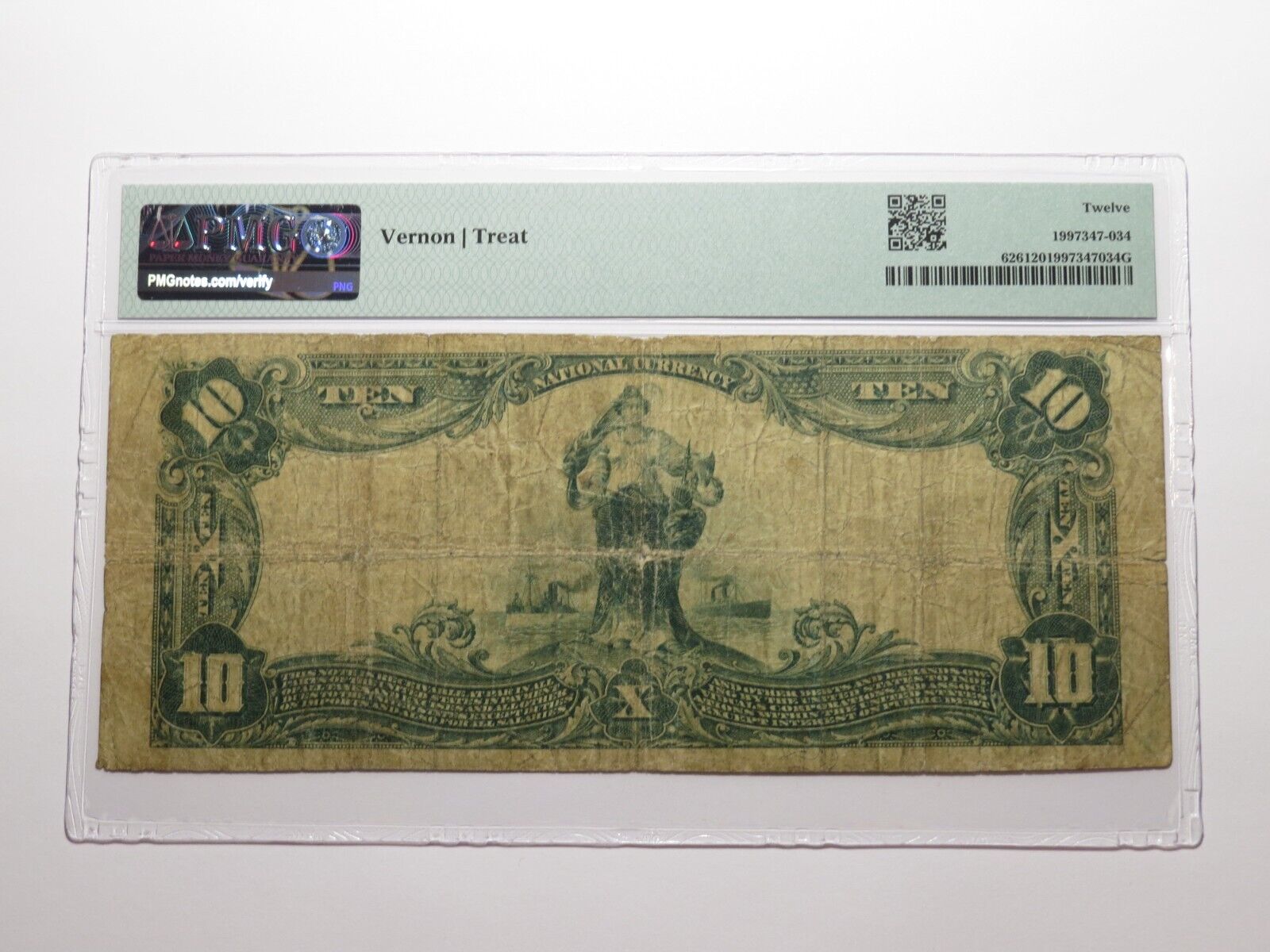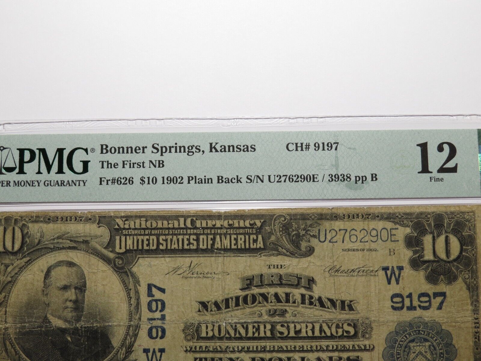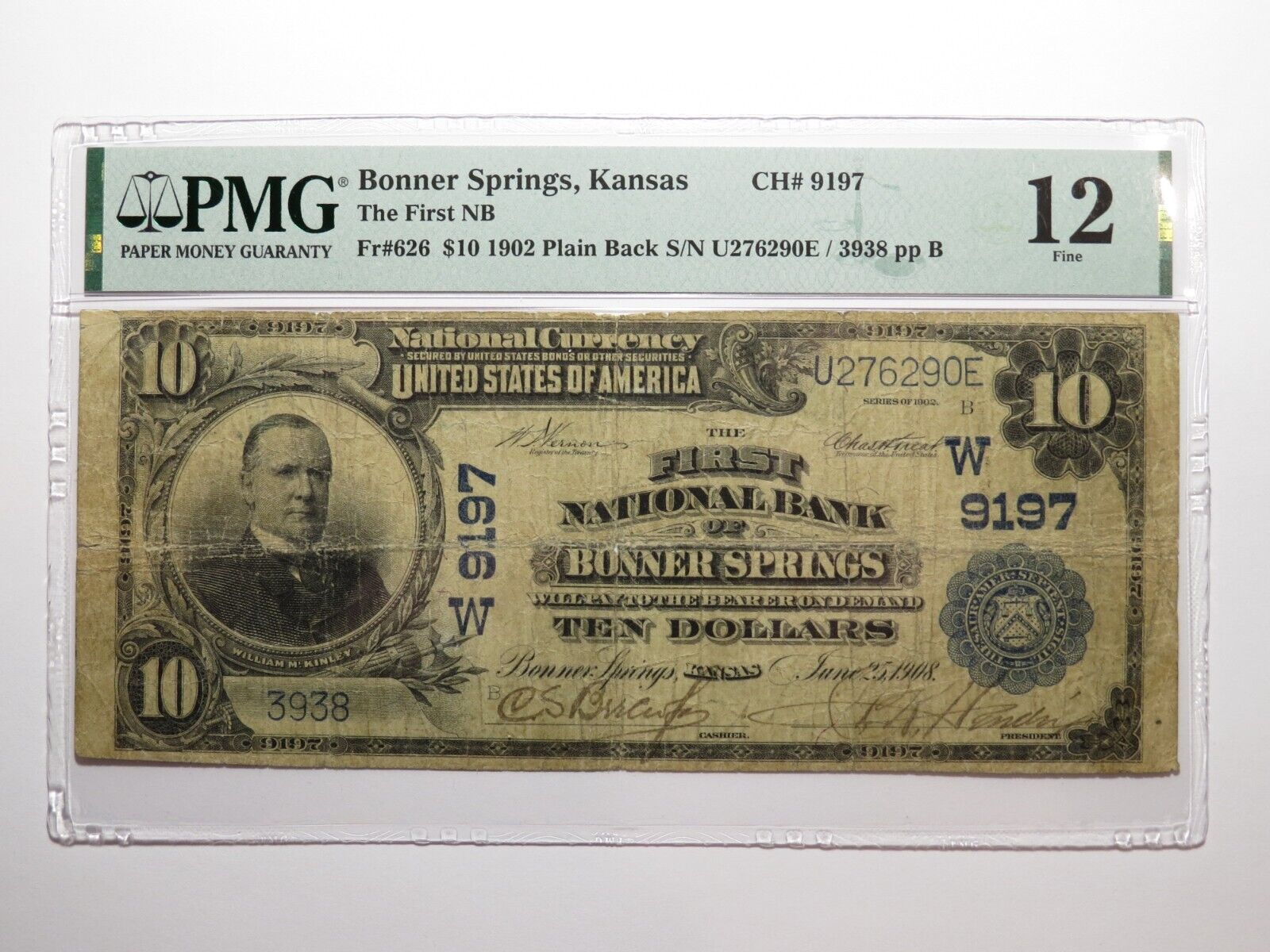 Up for auction is a $10 1902 Bonner Springs Kansas National Currency Note. This note was issued by The First National Bank of Bonner Springs. It is Charter #9197. This is a ONE BANK TOWN! This bill has been graded Fine 12 by PMG. This is a problem free note. This bill is a must have for any collector of National Currency!