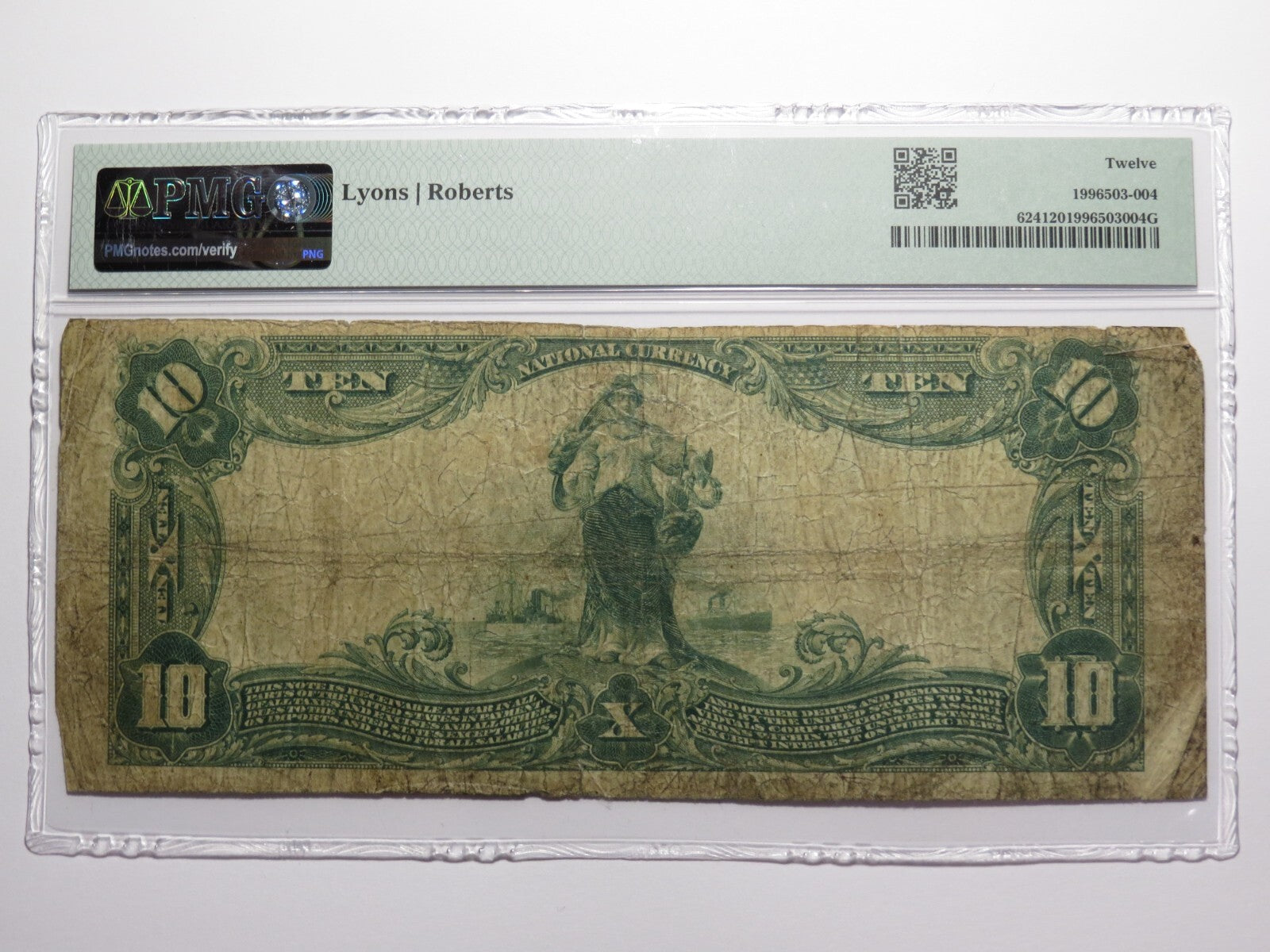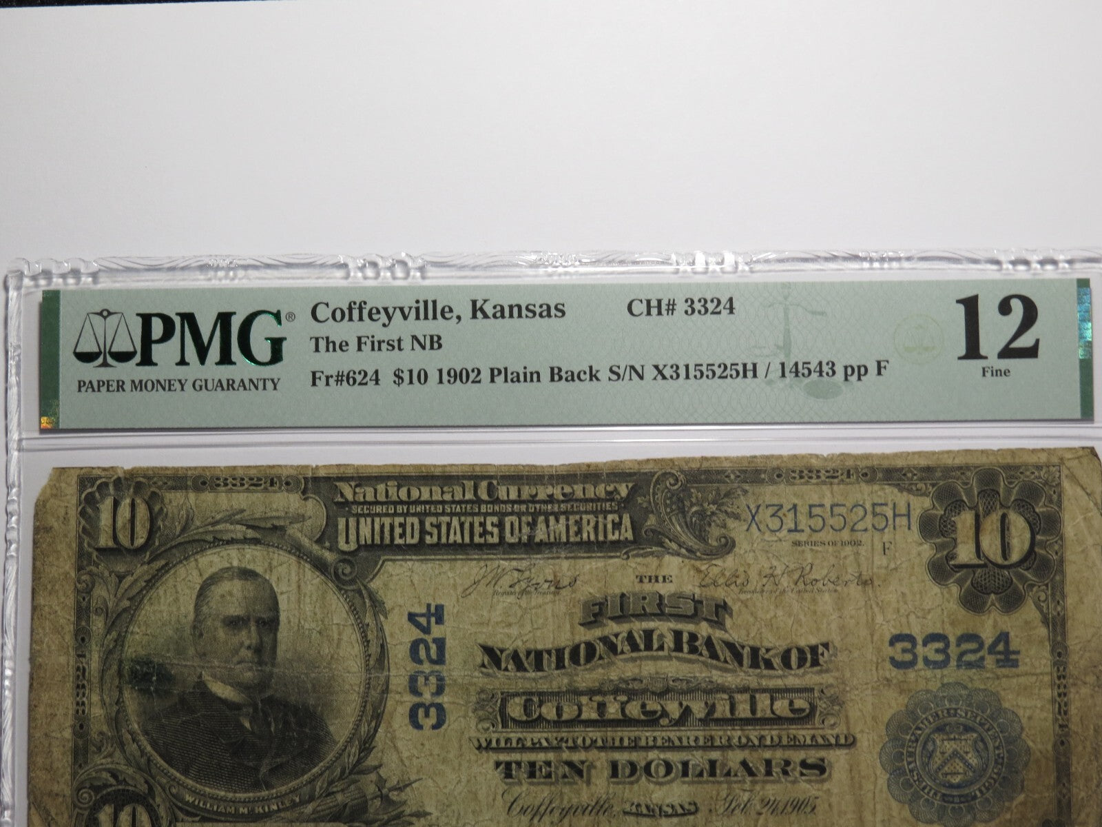 Up for auction is a $10 1902 Coffeyville Kansas Plain Back National Currency Note. This note was issued by The First National Bank of Coffeyville. It is Charter #3324. Coffeyville is an always in demand Kansas town! This note has been graded Fine 12 by PMG. This is a problem free note. This bill is a must have for any collector of National Currency!