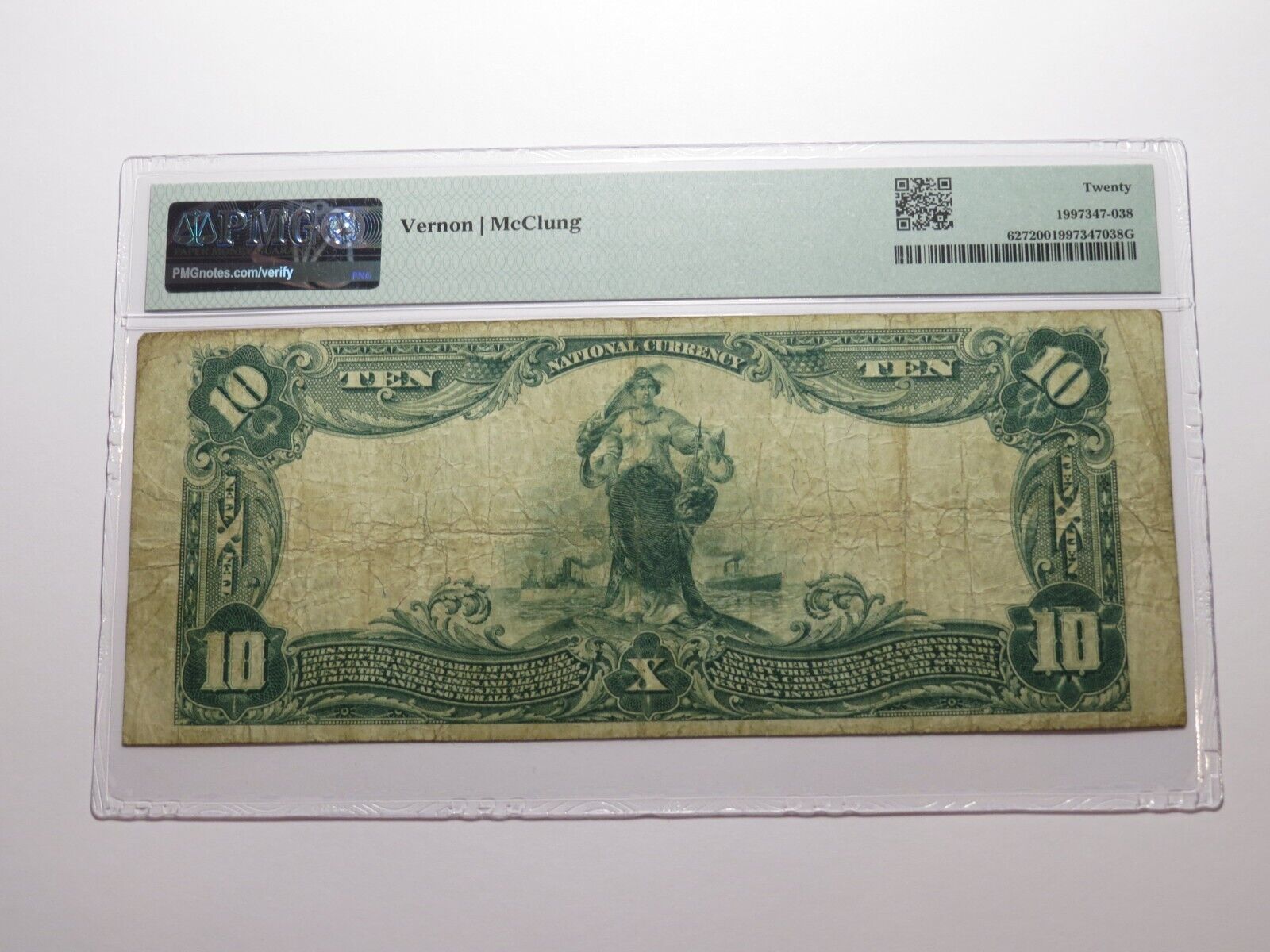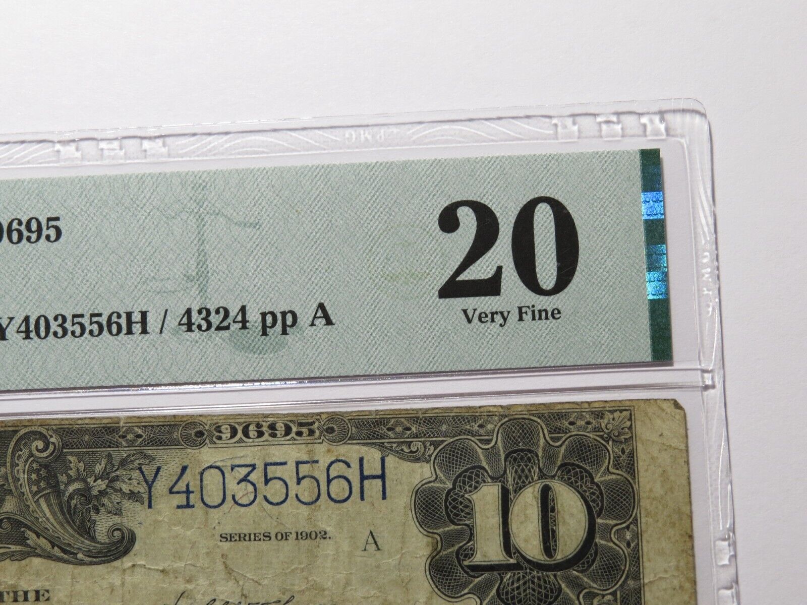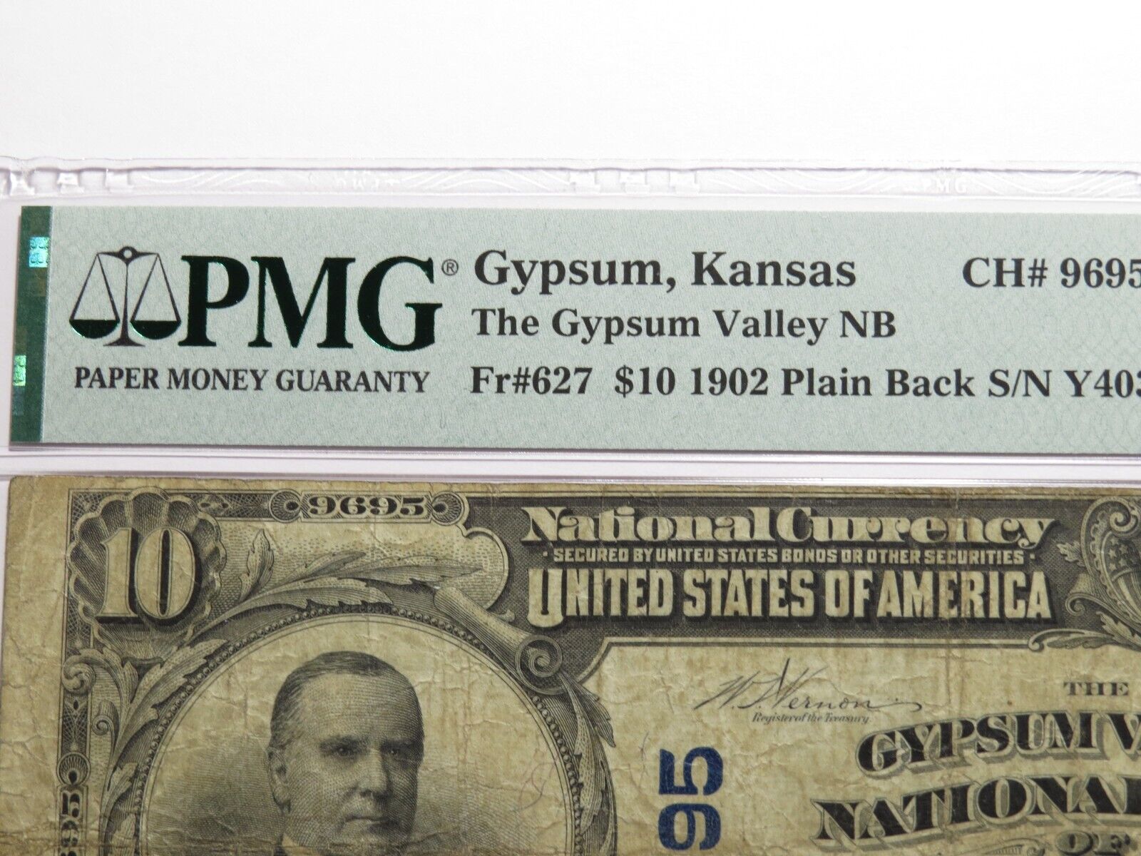 Up for auction is a $10 1902 Gypsum Kansas Plain Back National Currency Note. This note was issued by The Gypsum Valley National Bank. It is Charter #9695. This is a ONE BANK TOWN! This note has been graded Very Fine 20 by PMG. This is a problem free note. This bill is a must have for any collector of National Currency!
