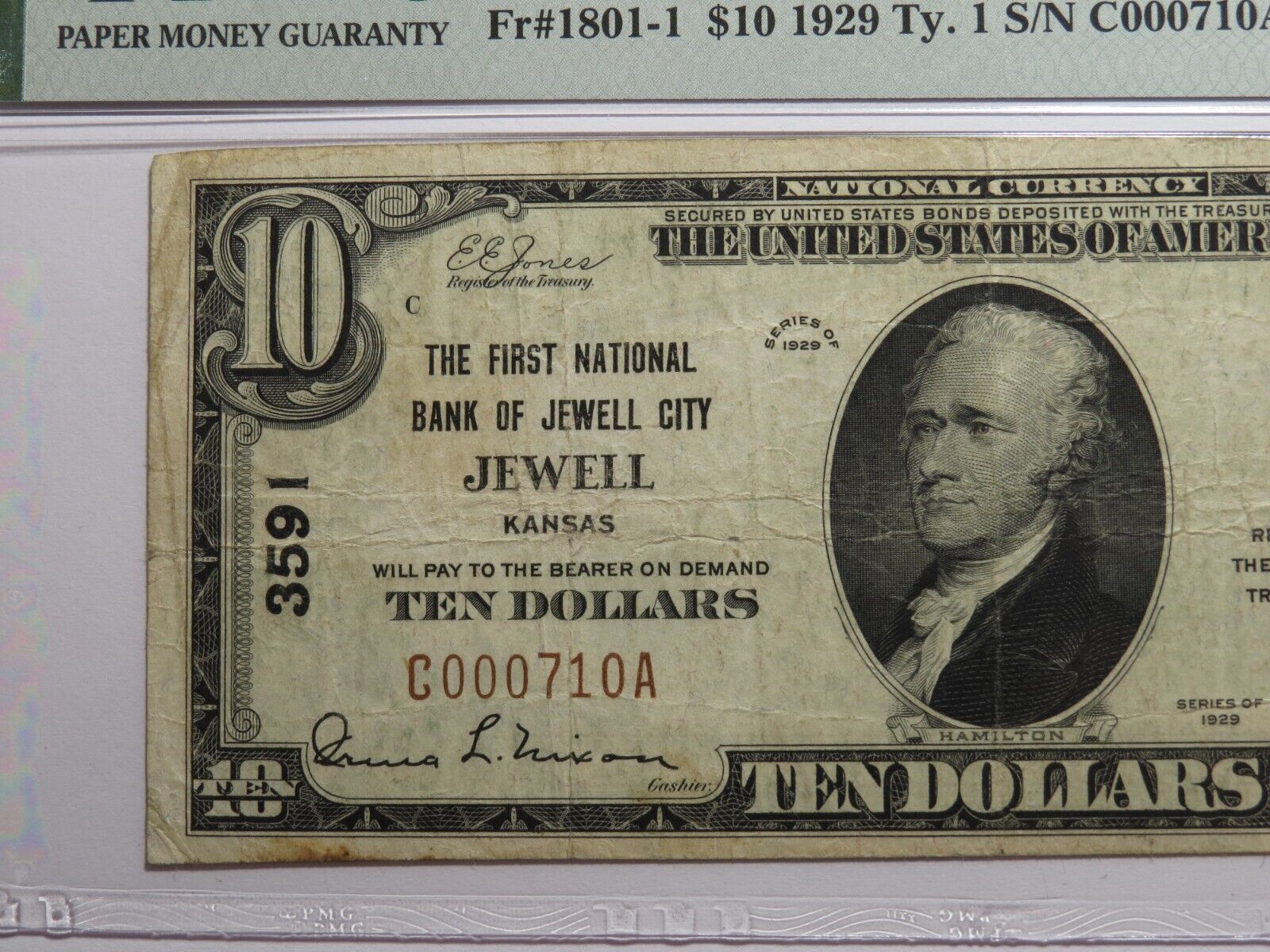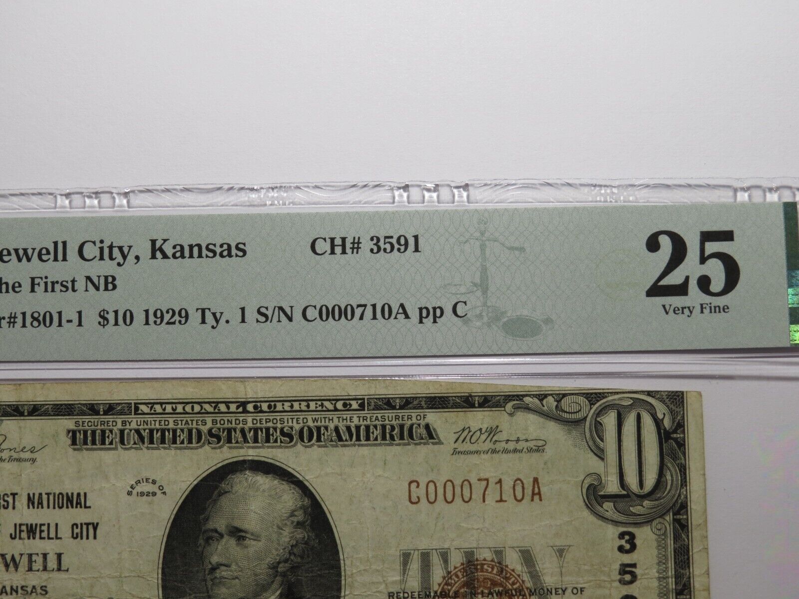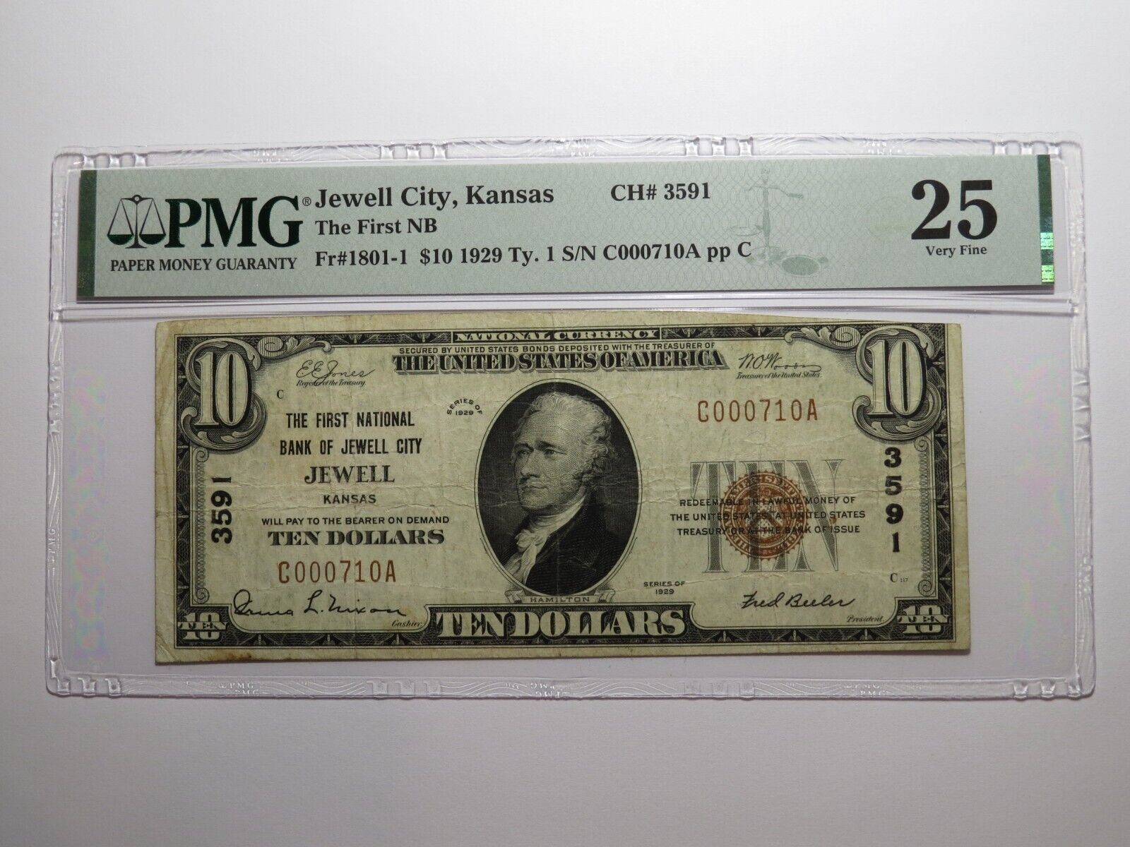 Up for auction is a $10 1929 Jewell City Kansas Type 1 National Currency Note. This note was issued by The First National Bank of Jewell City. It is Charter #3591. This is a ONE BANK TOWN! This note has been graded Very Fine 25 by PMG. This is a problem free note. This bill is a must have for any collector of National Currency!
