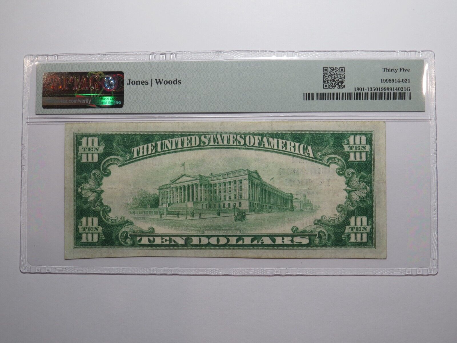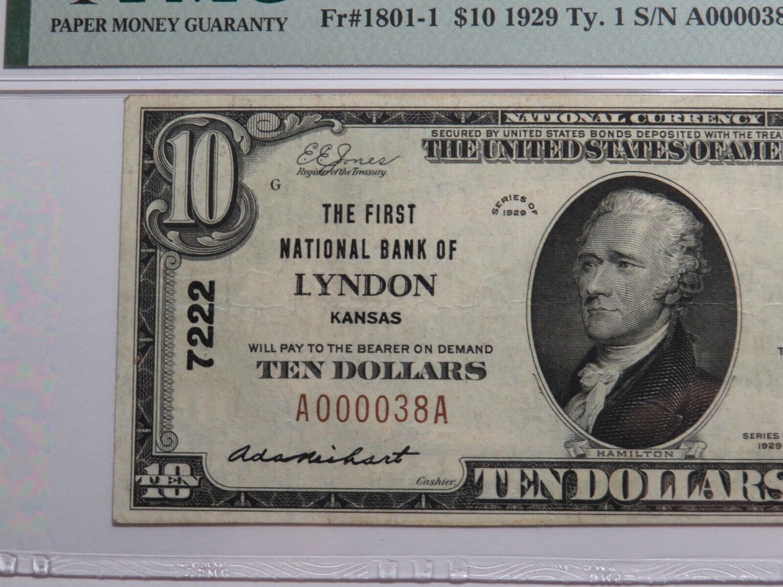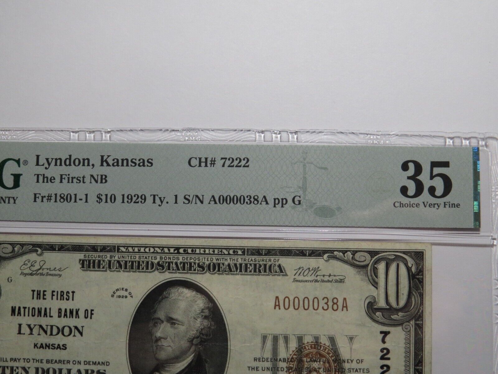 Up for auction is a $10 1929 Lyndon Kansas National Currency Note. This note was issued by The First National Bank of Lyndon. It is Charter #7222. This is a ONE BANK TOWN! This note has been graded Choice Very Fine 35 by PMG. This is a problem free note. This bill is a must have for any collector of National Currency!