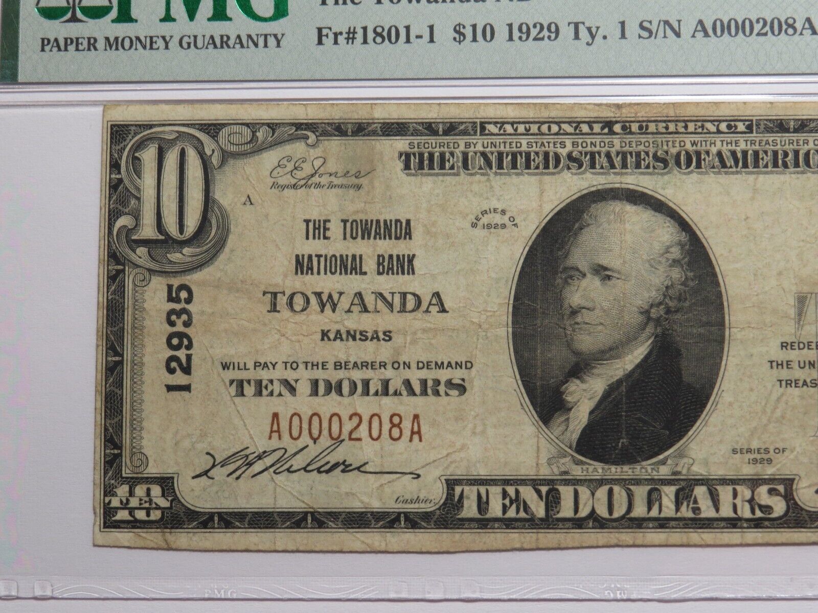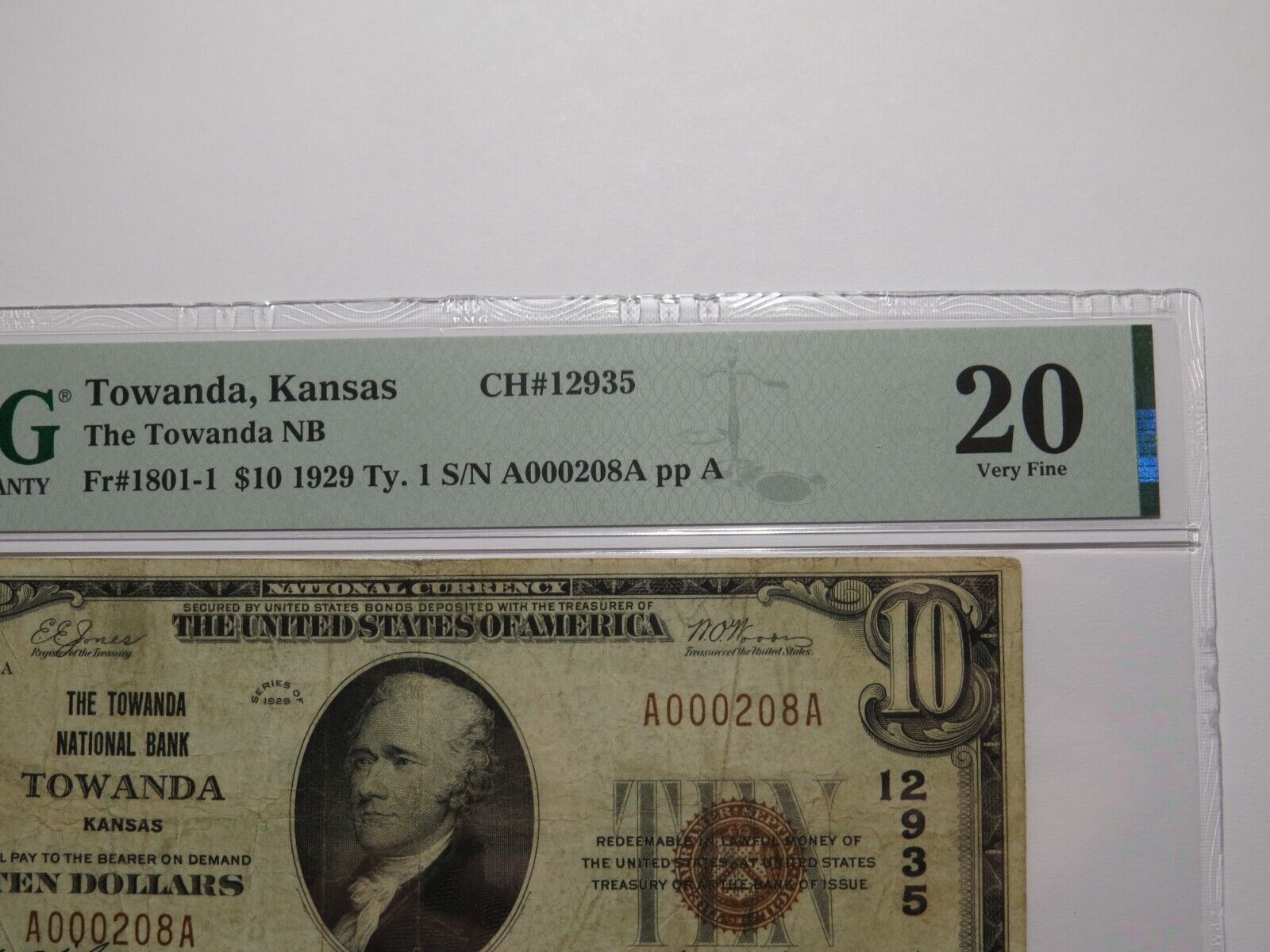 Up for auction is a $10 1929 Towanda Kansas Type 1 National Currency Note.  This note was issued by The Towanda National Bank.  It is Charter #12935.  Towanda is an always in demand Kansas town!  This note has been graded Very Fine 20 by PMG.  This is a problem free note.  This bill is a must have for any collector of National Currency!