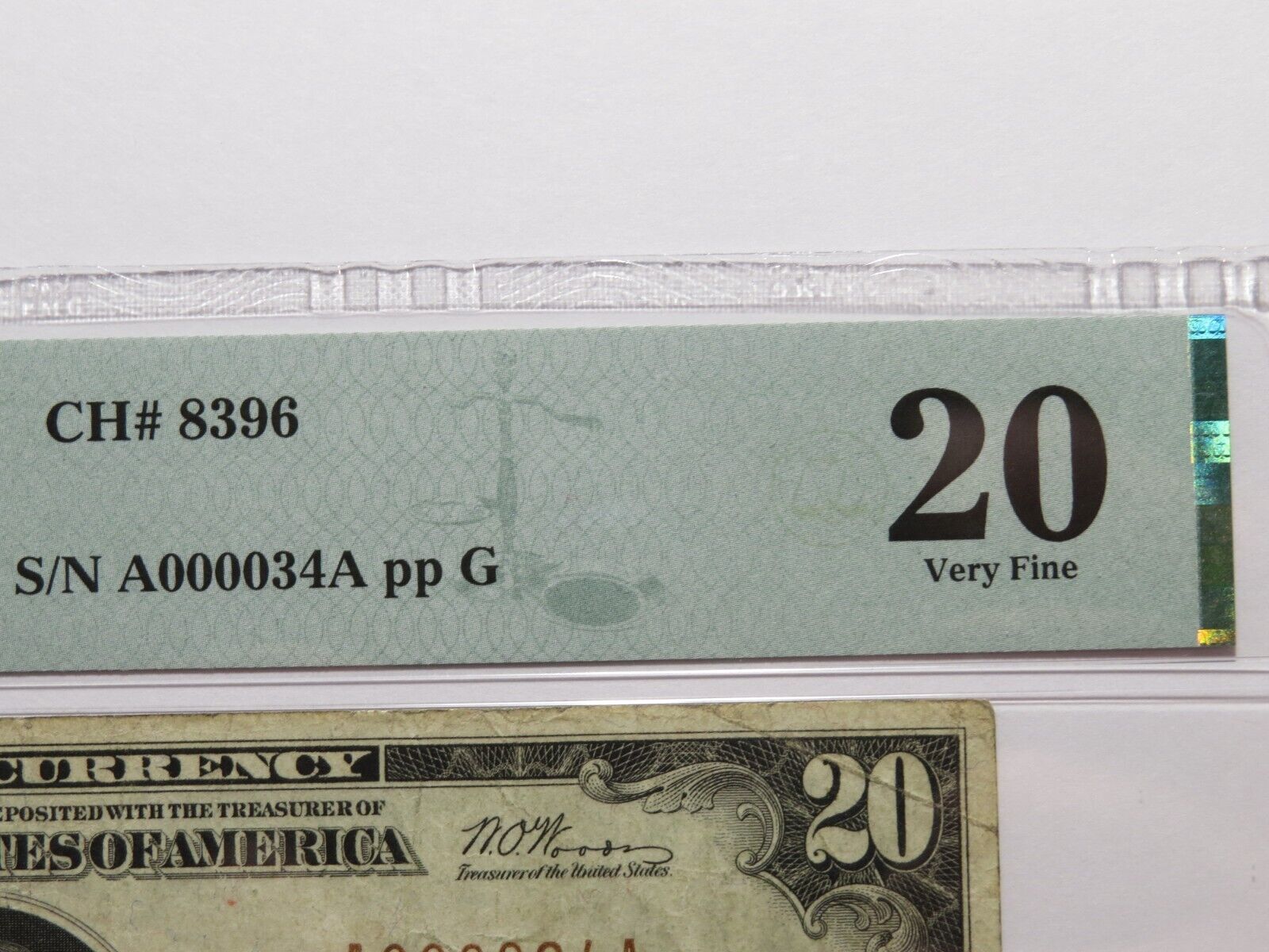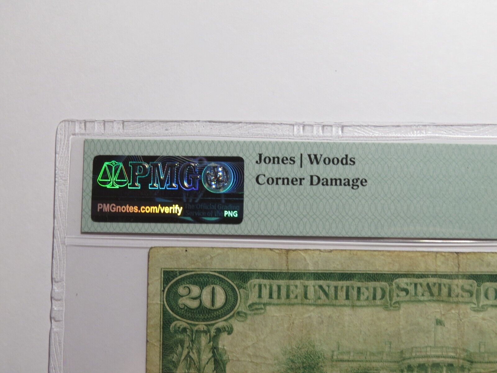 .  This note was issued by The First National Bank of Barnard.  It is Charter #8396.  This is a ONE BANK TOWN!  This note has been graded Very Fine 20 by PMG.  It is noted that the top left corner is damaged.  This bill is a must have for any collector of National Currency!