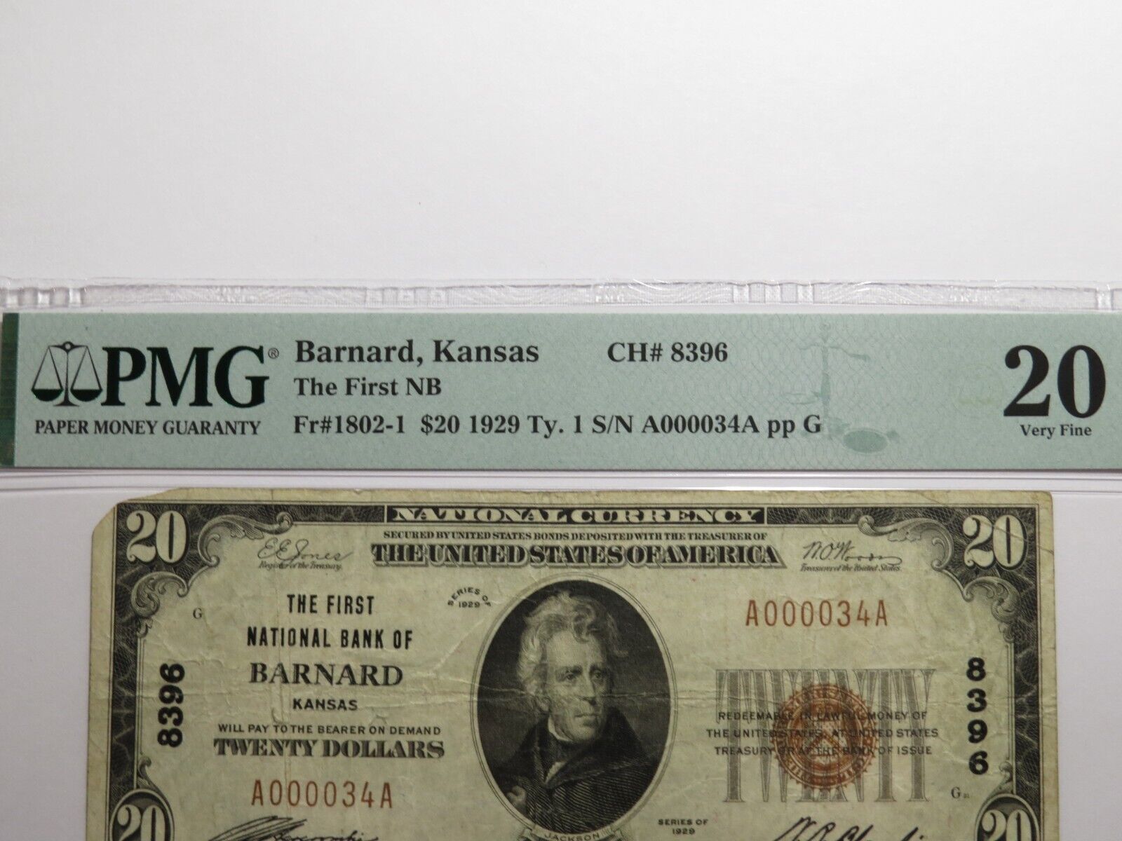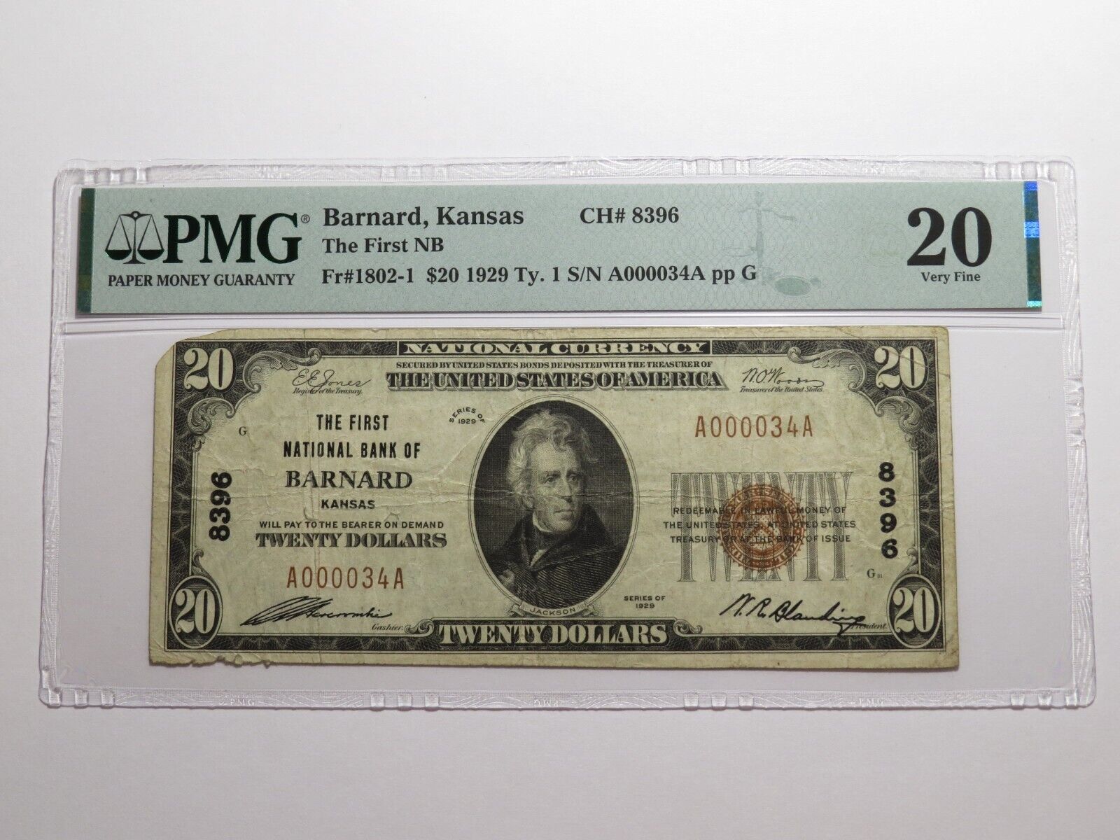 $20 1929 Barnard Kansas KS National Currency Bank Note Bill Ch #8396 VF20 PMG
