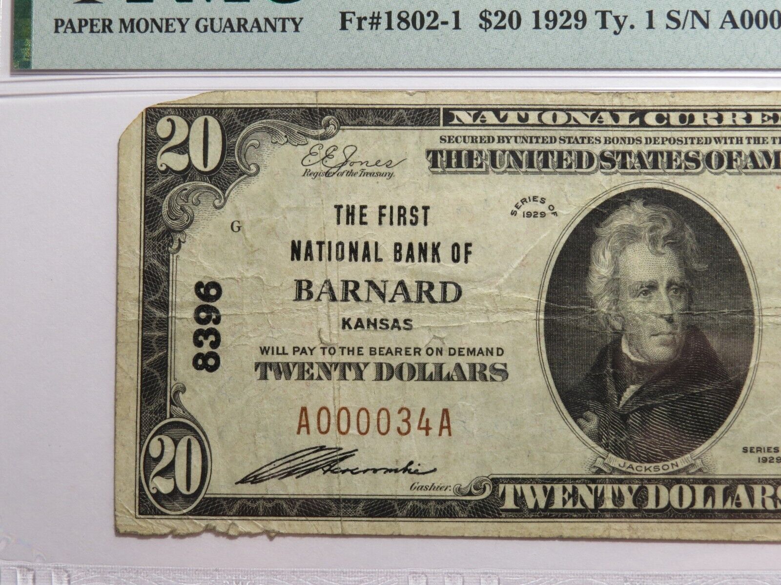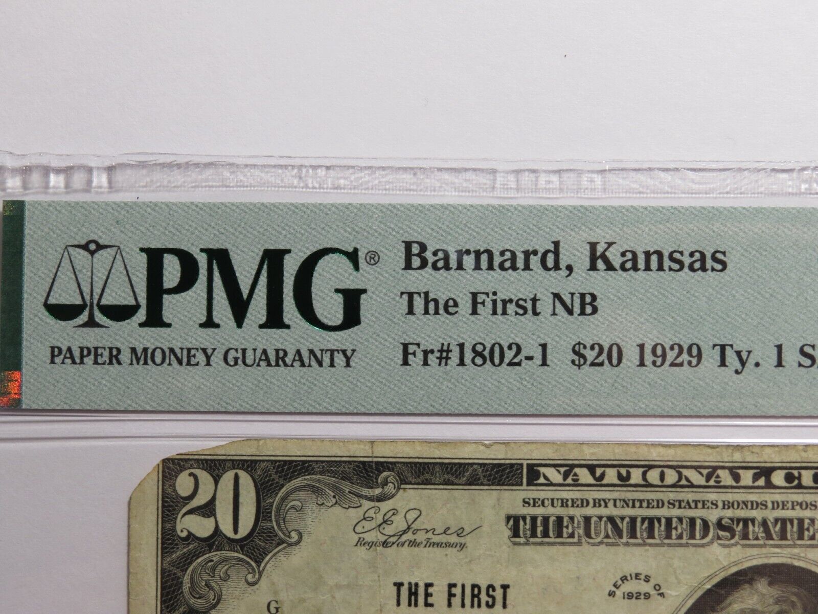 Up for auction is a $20 1929 Barnard Kansas Type 1 National Currency Note