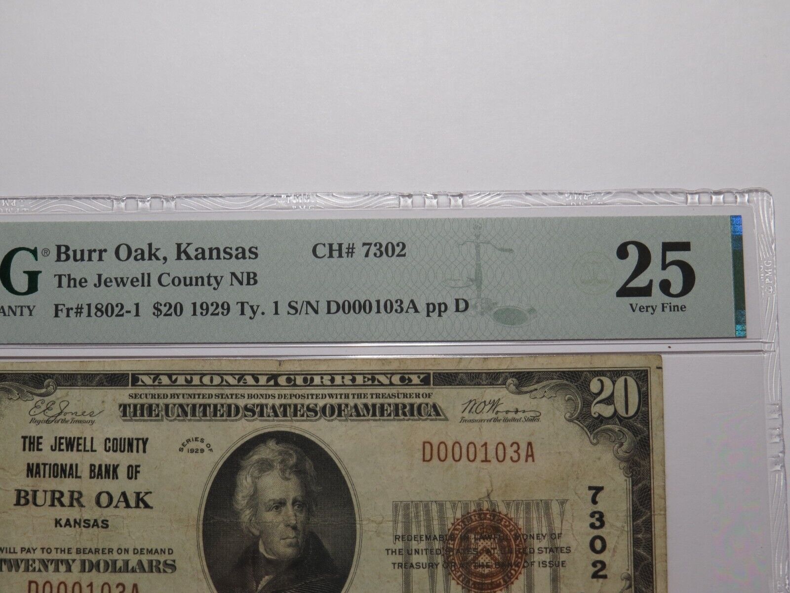 Up for auction is a $20 1929 Burr Oak Kansas Type 1 National Currency Note. This note was issued by The Jewell County National Bank of Burr Oak. It is Charter #7302. Burr Oak is an always in demand Kansas town! This bill has been graded Very Fine 25 by PMG. This is a problem free note. This bill is a must have for any collector of National Currency!