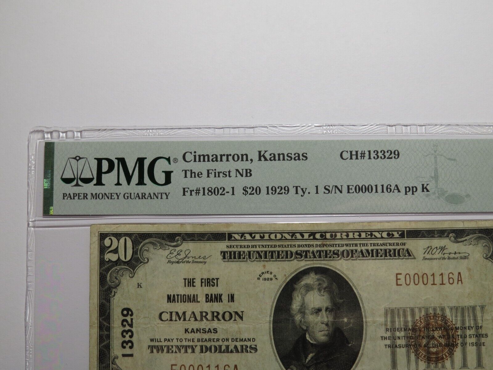 Up for auction is a $20 1929 Cimarron Kansas Type 1 National Currency Note. This note was issued by The First National Bank in Cimarron. It is Charter #13329. This is a tough to find Kansas town! This note has been graded Very Fine 25 by PMG. This is a problem free note. This bill is a must have for any collector of National Currency!
