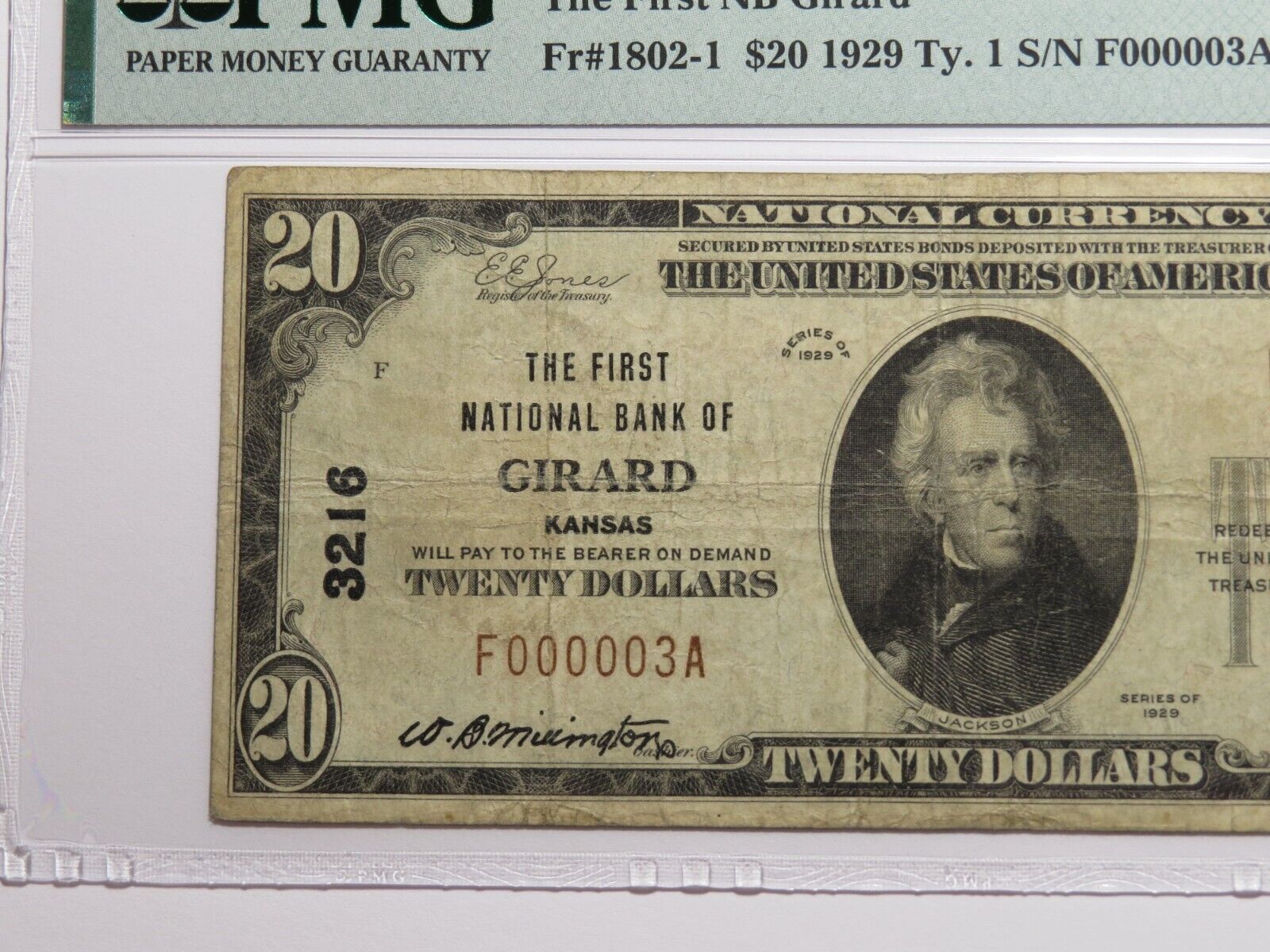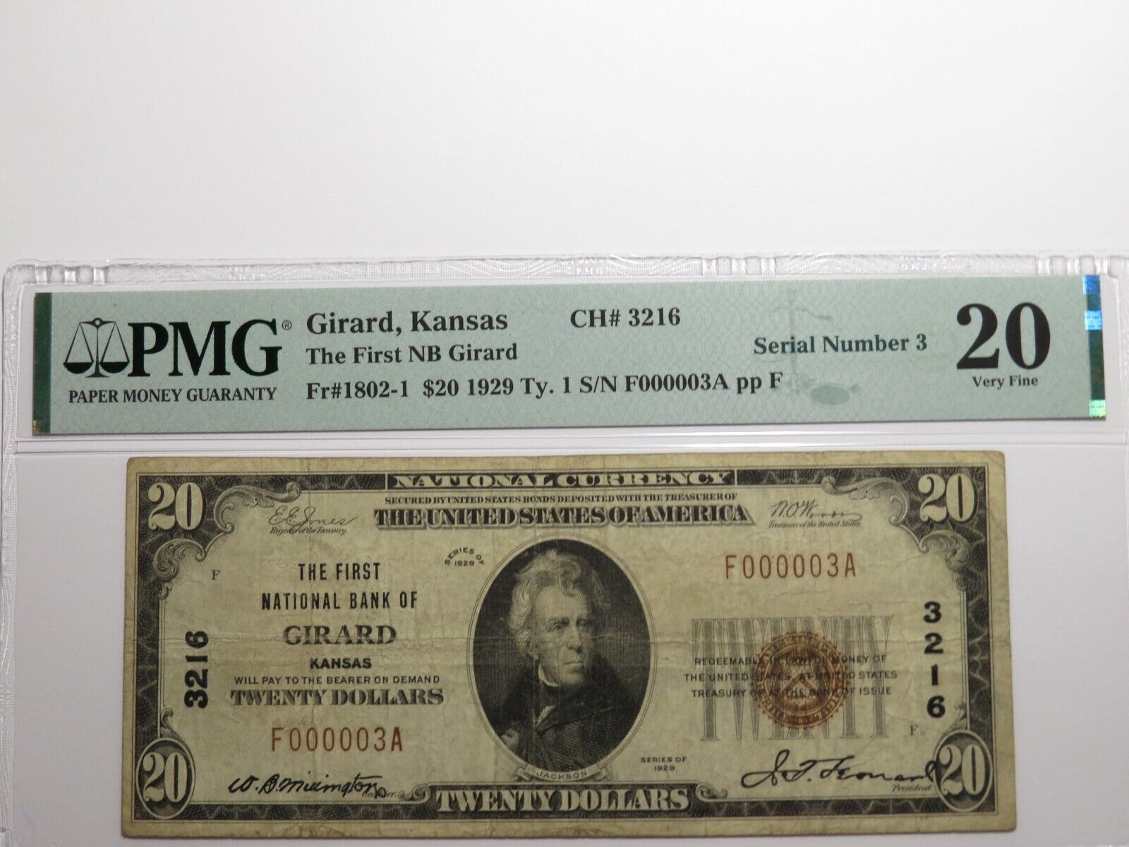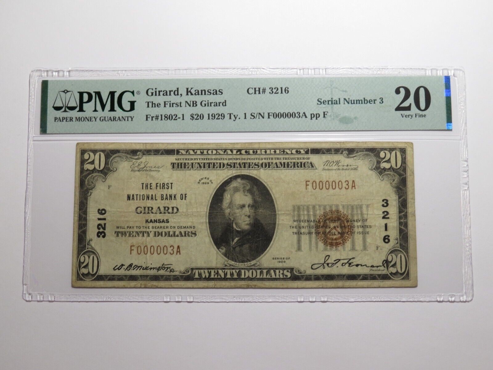 $20 1929 Girard Kansas National Currency Bank Note Bill #3216 PMG VF20 Serial #3