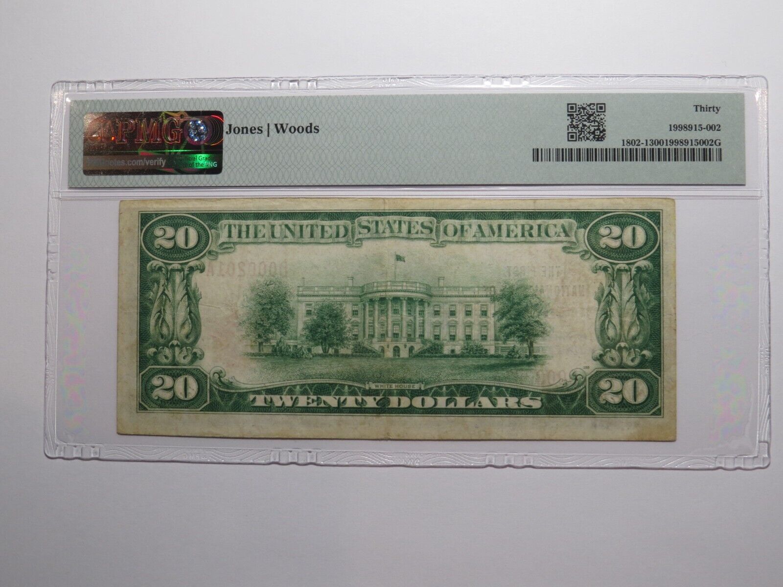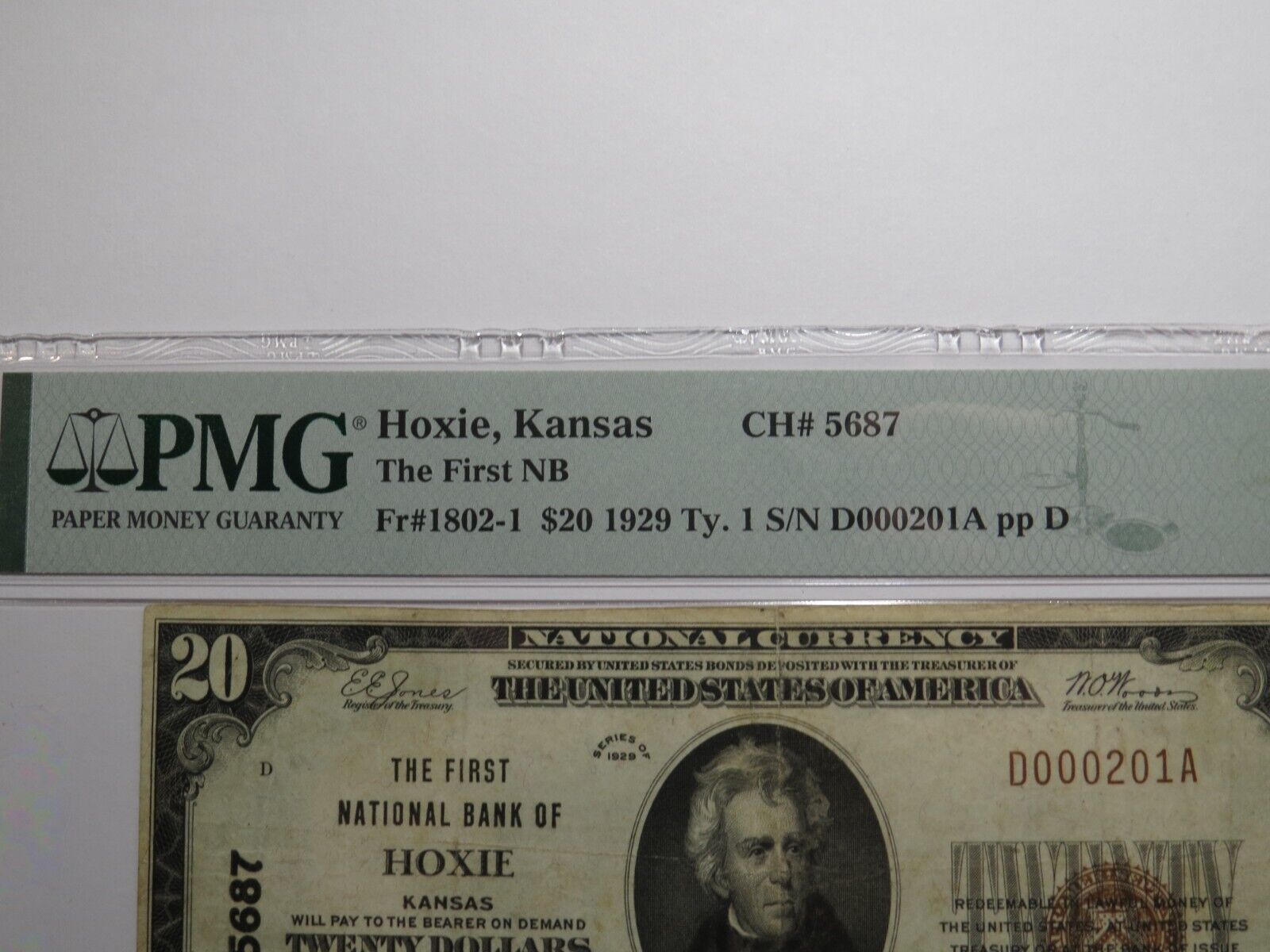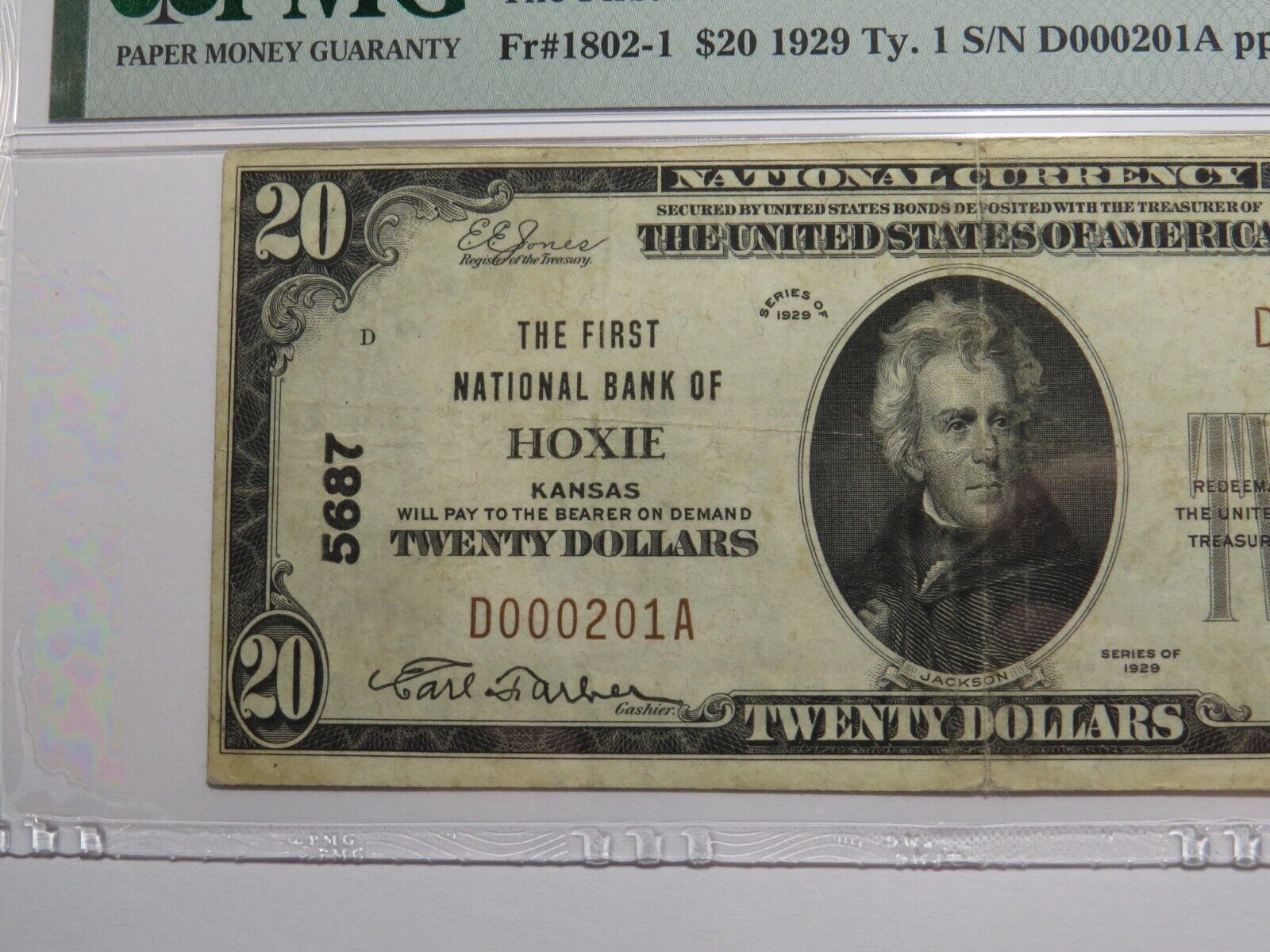Up for auction is a $20 1929 Hoxie Kansas National Currency Note. This note was issued by The First National Bank of Hoxie. It is Charter #5687. This is a ONE BANK TOWN! This note has been graded Very Fine 30 by PMG. This is a problem free note. This bill is a must have for any collector of National Currency!