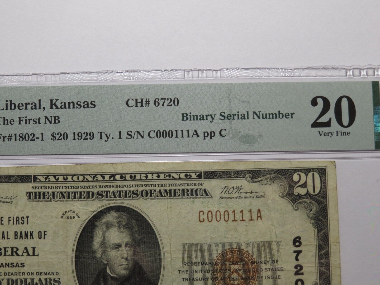 Up for auction is a $20 1929 Liberal Kansas Type 1 National Currency Note. This note was issued by The First National Bank of Liberal. It is Charter #6720. Liberal is an always in demand Kansas town! This note has a binary serial number. This note has been graded Very Fine 20 by PMG. This is a problem free note. This bill is a must have for any collector of National Currency!