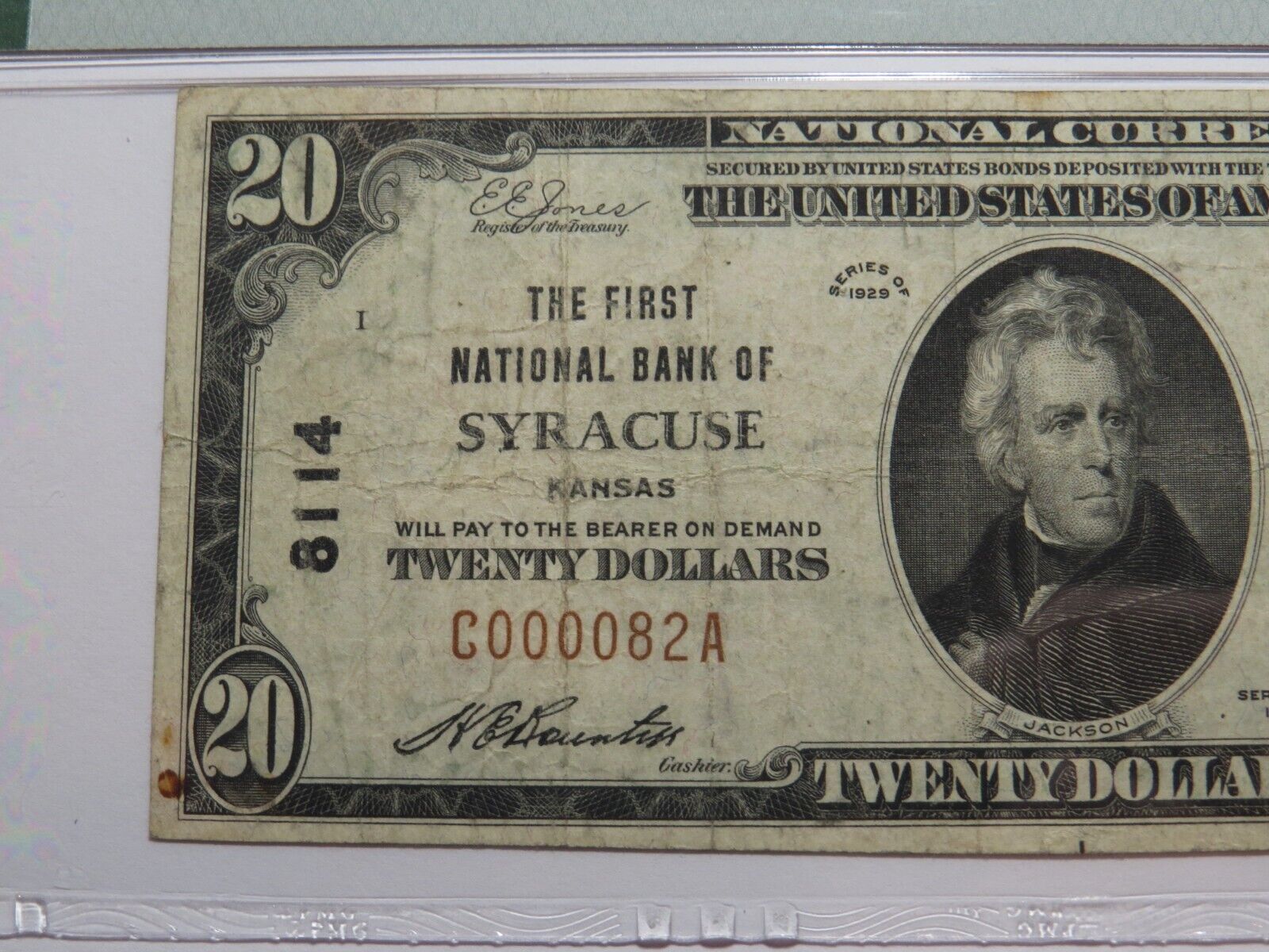 Up for auction is a $20 1929 Syracuse Kansas Type 1 National Currency Note