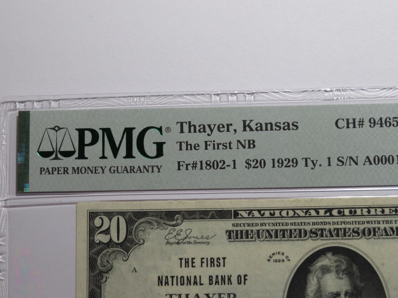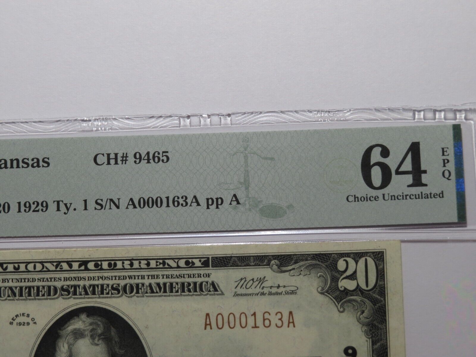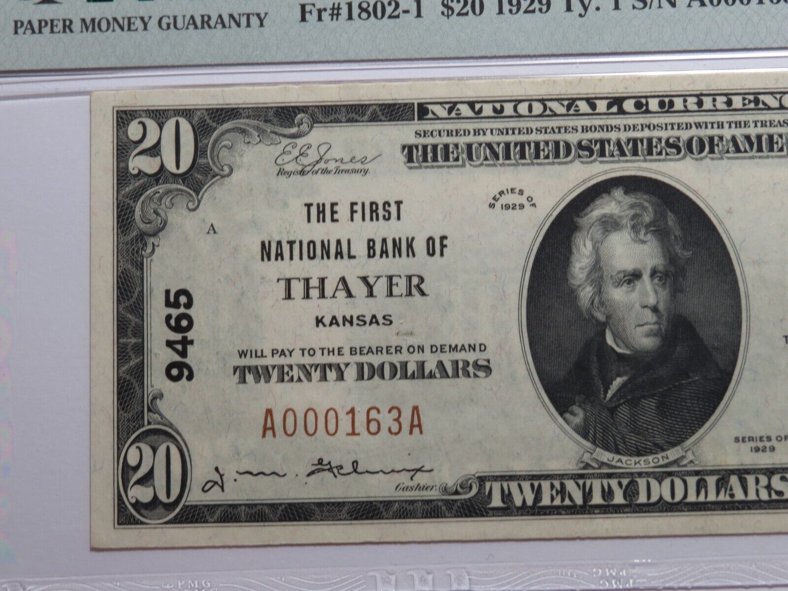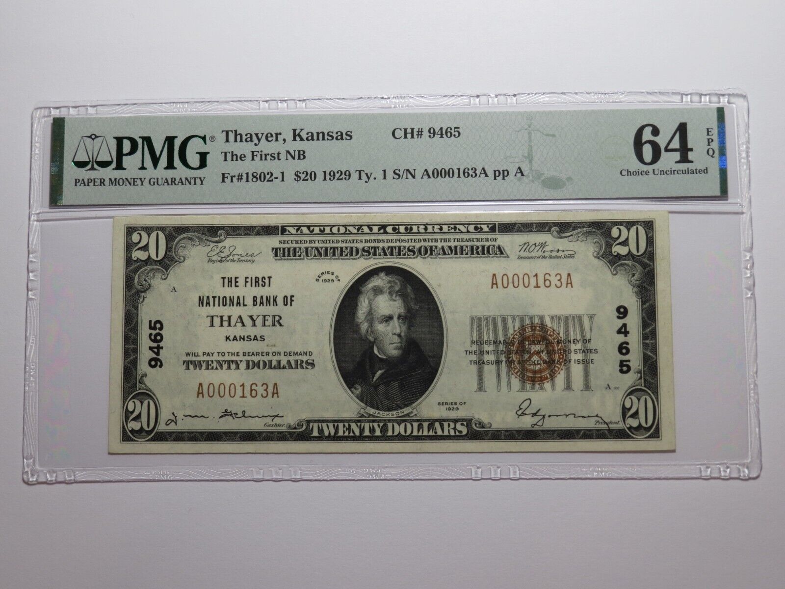 Up for auction is a $20 1929 Thayer Kansas Type 1 National Currency Note. This note was issued by The First National Bank of Thayer. It is Charter #9465. This is a ONE BANK TOWN! This note has been graded Choice Uncirculated 64EPQ by PMG. This is a stunning problem free note. This bill is a must have for any collector of National Currency!