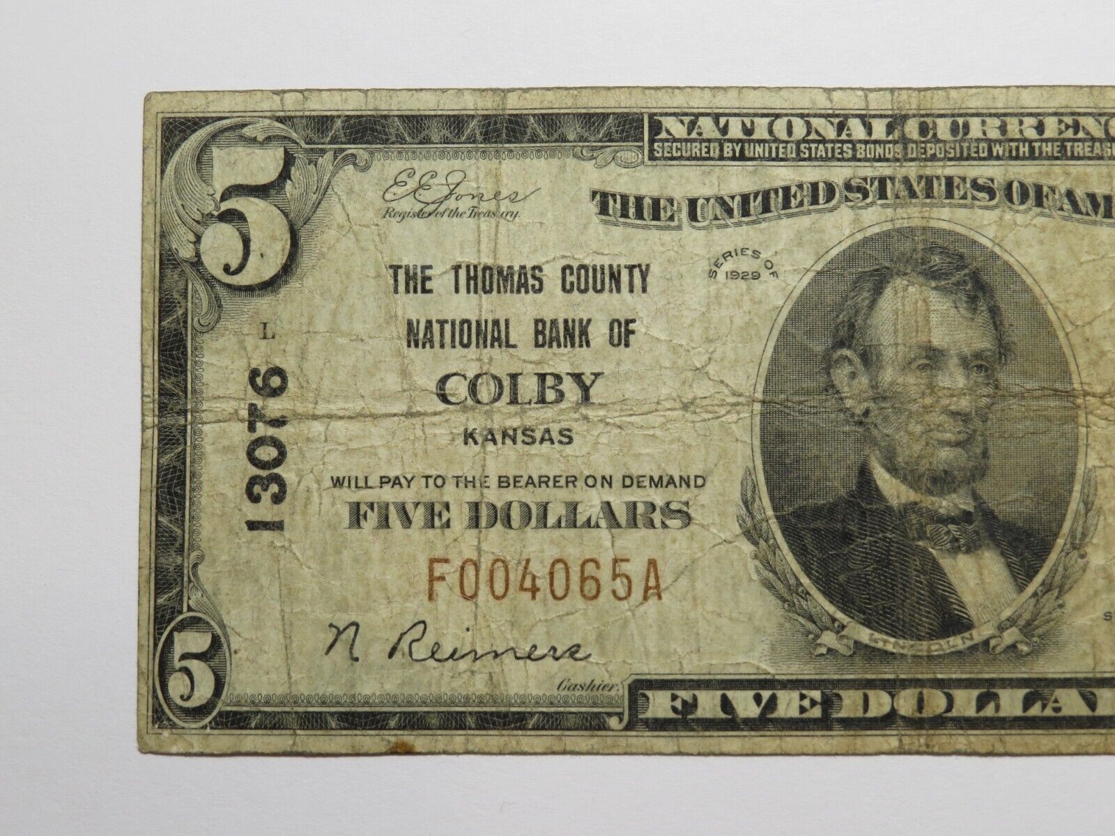 Up for auction is a $5 1929 Colby Kansas Type 1 National Currency Note. This note was issued by The Thomas County National Bank of Colby. It is Charter #13076. Colby is an always in demand Kansas town! This note still has some crisp left to it and is in good shape with no major issues. This bill is a must have for any collector of National Currency!