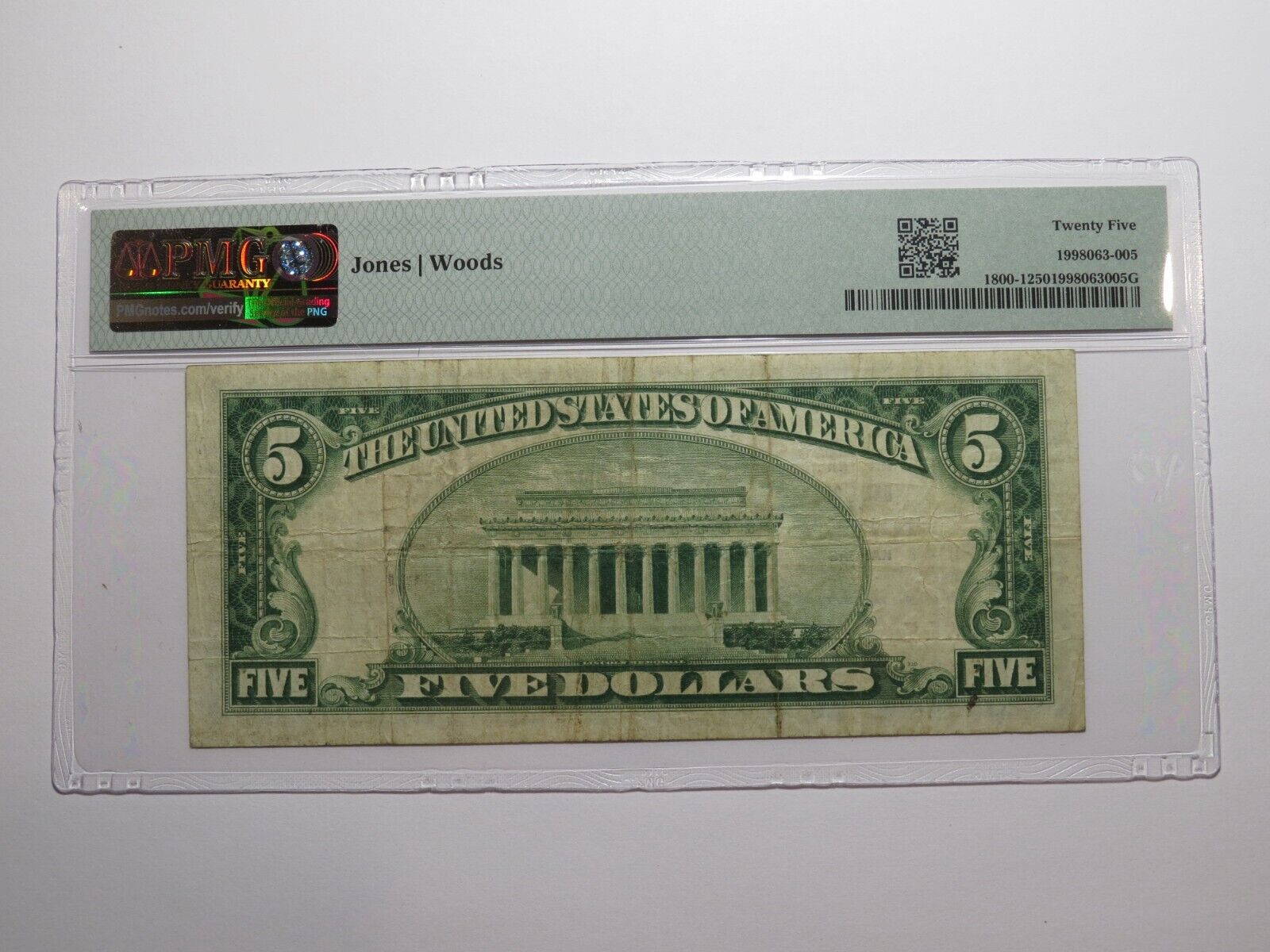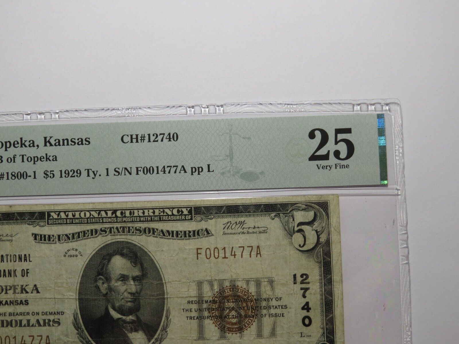 Up for auction is a $5 1929 Topeka Kansas Type 1 National Currency Note. This note was issued by The National Bank of Topeka. It is Charter #12740. This is an always in demand Topeka Charter! This note has been graded Very Fine 25 by PMG. This is a problem free note. This bill is a must have for any collector of National Currency!