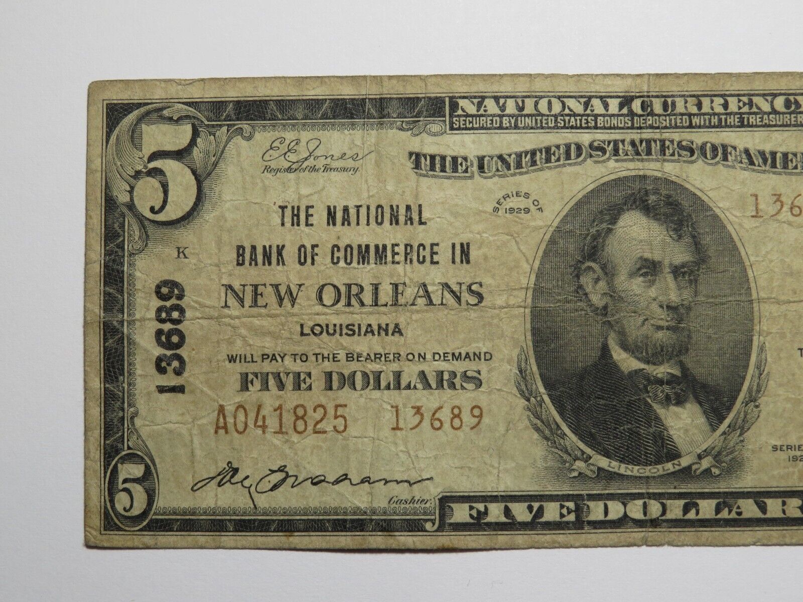 Up for auction is a $5 1929 New Orleans Louisiana Type 2 National Currency Note. This note was issued by The National Bank of Commerce in New Orleans. It is Charter #13689. This is an always in demand New Orleans Charter! This note still has a good amount of crisp left to it and is in good overall shape. This bill is a must have for any collector of National Currency. If you have any questions please feel free to ask!