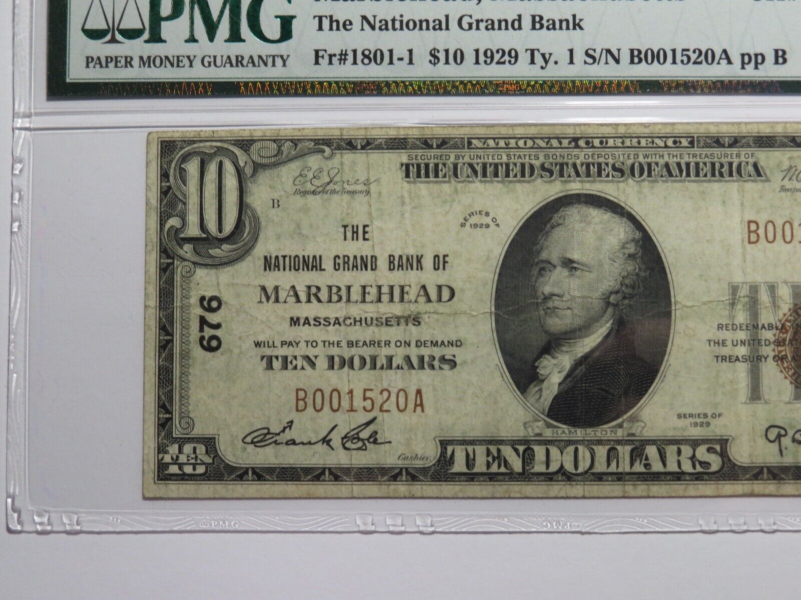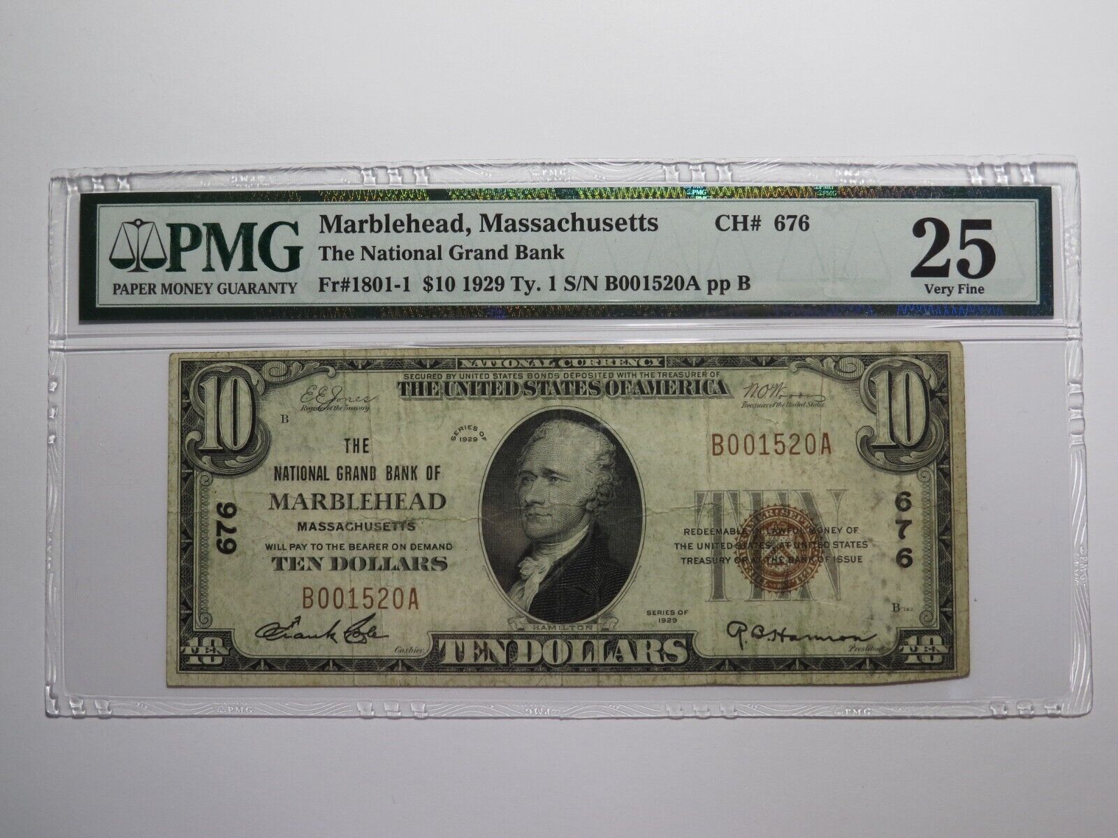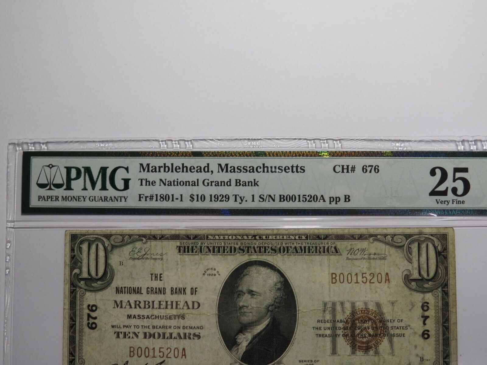Up for auction is a $10 1929 Marblehead Massachusetts National Currency Note. This note was issued by The National Grand Bank of Marblehead. It is Charter #676. Marblehead is an extremely hard to find Massachusetts town! This note has been graded Very Fine 25 by PMG. There is nothing wrong with this note! This is a great looking bill that is a must have for any collector of National Bank Notes!