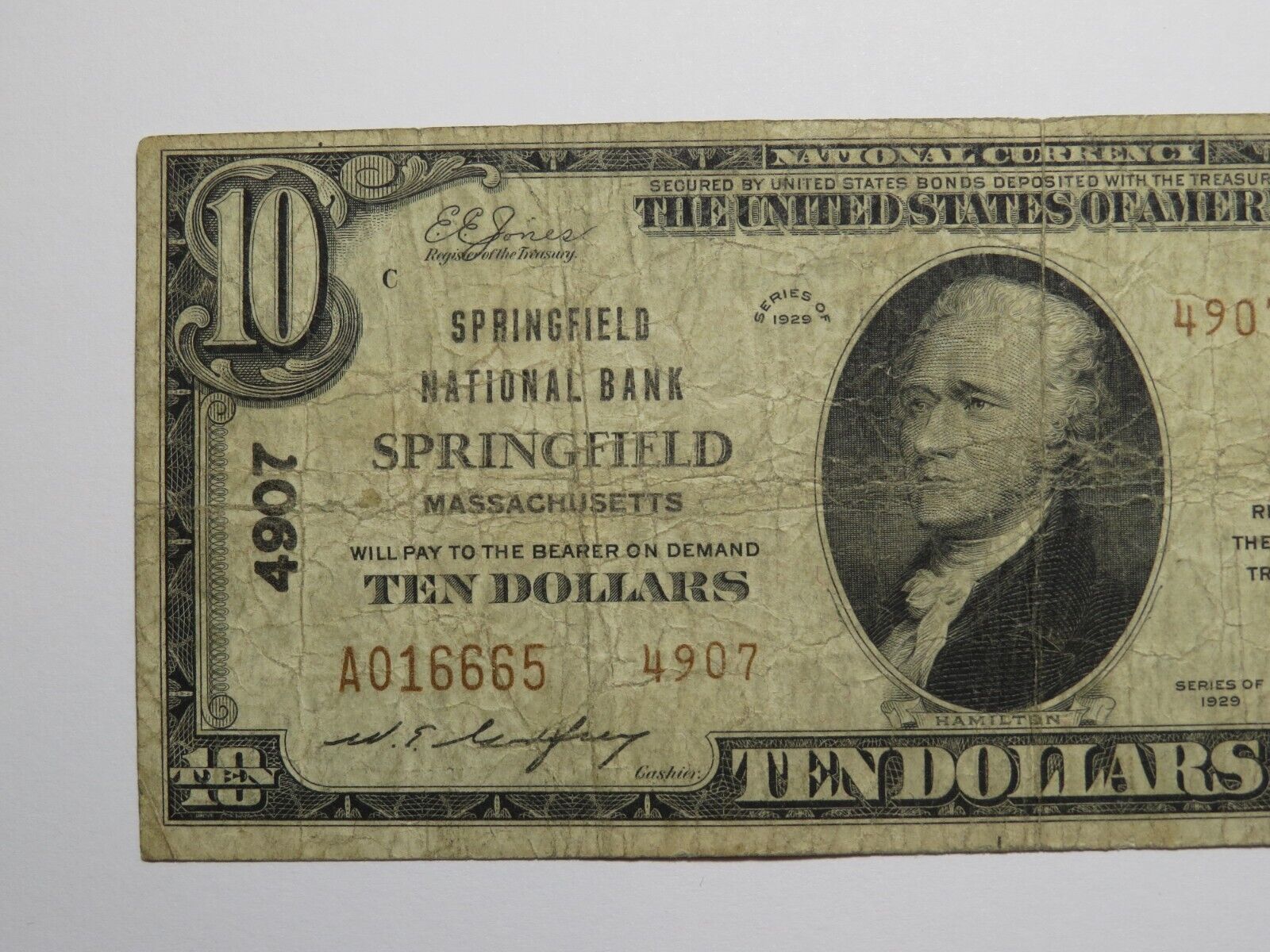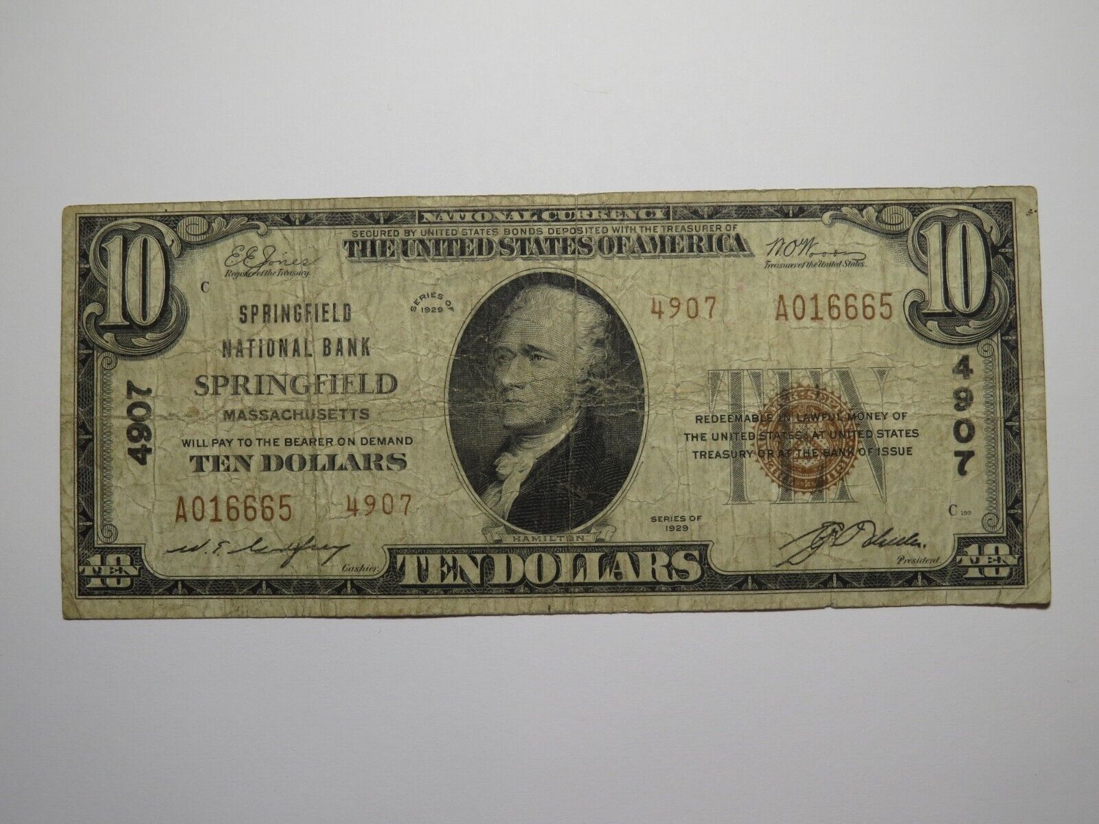 Up for auction is a $10 1929 Springfield Massachusetts National Currency Note. This note was issued by The Springfield National Bank. It is Charter #4907. This is an always in demand Springfield Charter! This note still has a good amount of crisp left to it and is in good overall shape. This bill is a must have for any collector of National Currency. If you have any questions please feel free to ask!