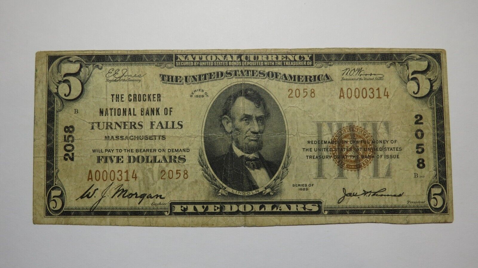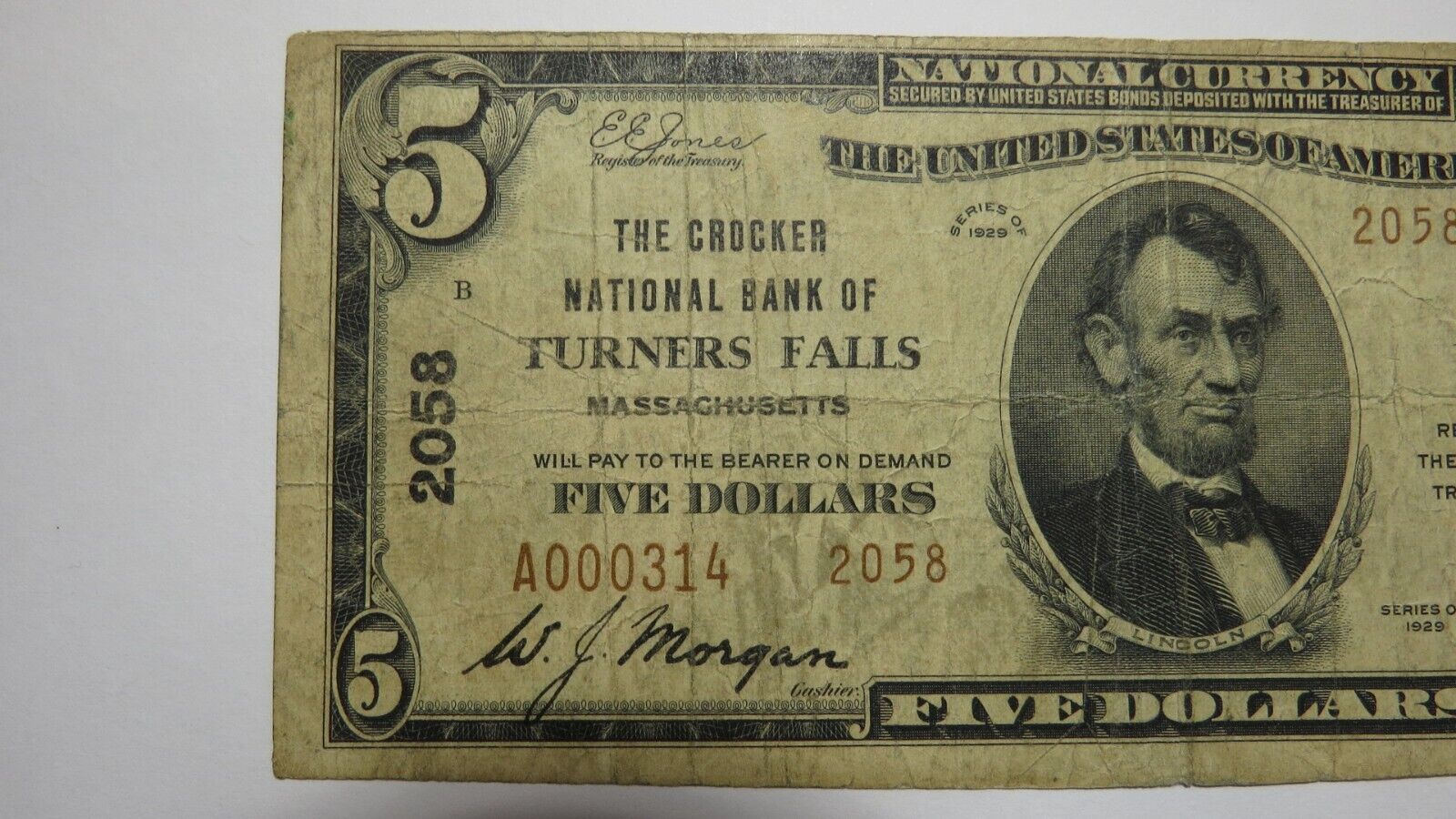 Up for auction is a $5 1929 Turners Falls Massachusetts Type 2 National Currency Note. This note was issued from The Crocker National Bank of Turners Falls. It is Charter #2058. This is a ONE BANK TOWN! This note still has some good crisp to it and is in good shape with no issues. This bill is a must have for any collector of National Currency!