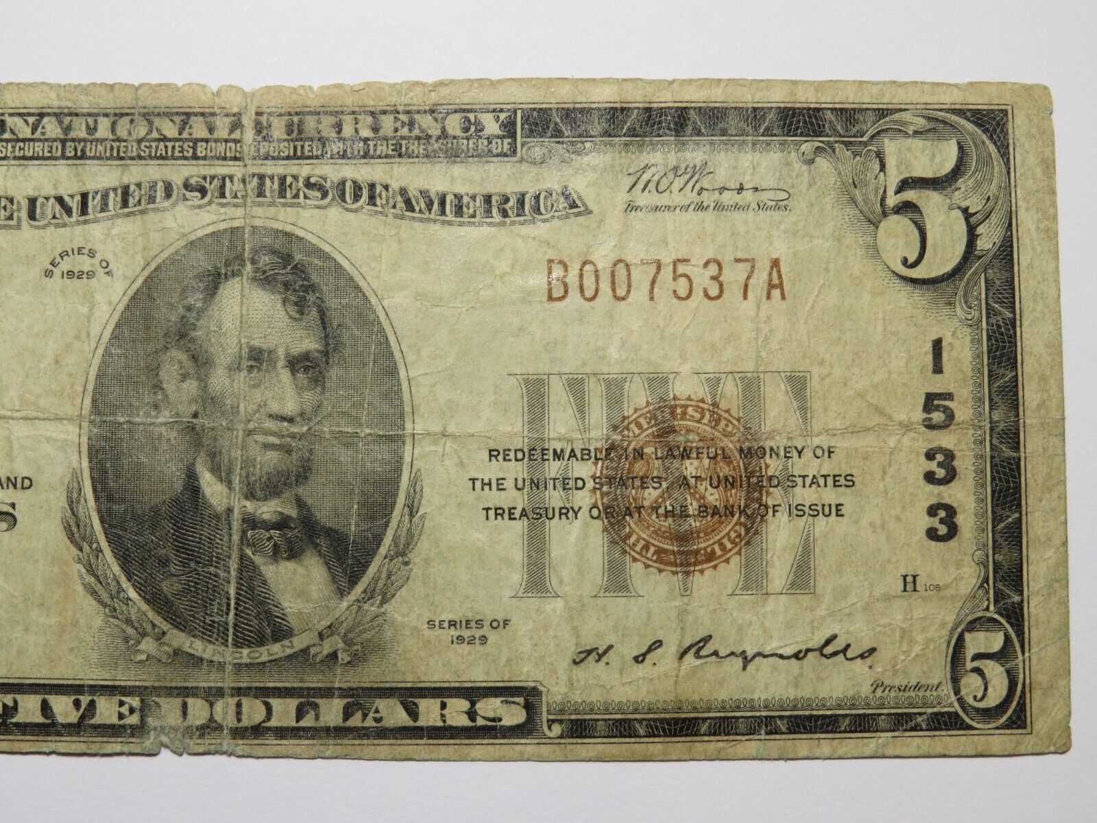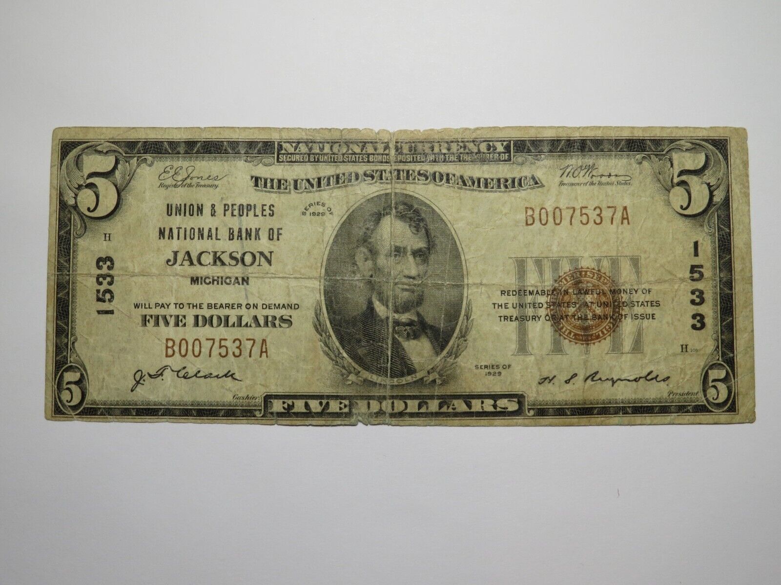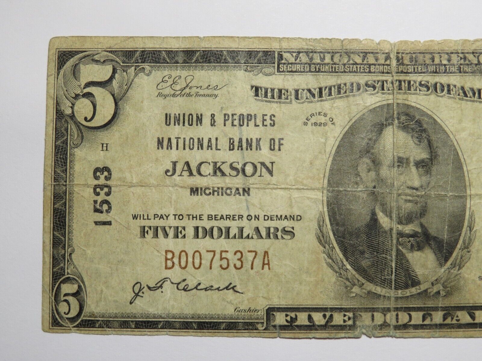 Up for auction is a $5 1929 Jackson Michigan Type 1 National Currency Note. This note was issued by The Union & Peoples National Bank of Jackson. It is Charter #1533. Jackson is an always in demand Michigan town! This note still has some crisp left to it and is in circulated condition with no major issues. This bill is a must have for any collector of National Currency!