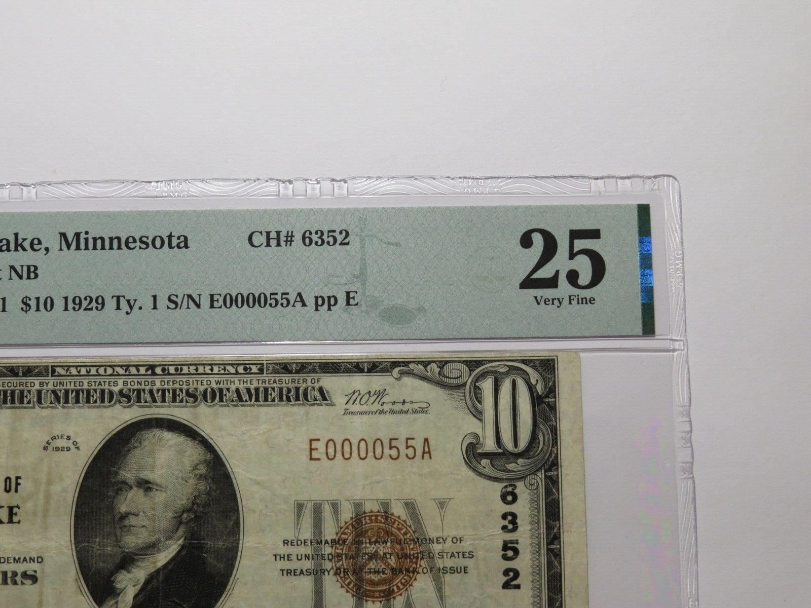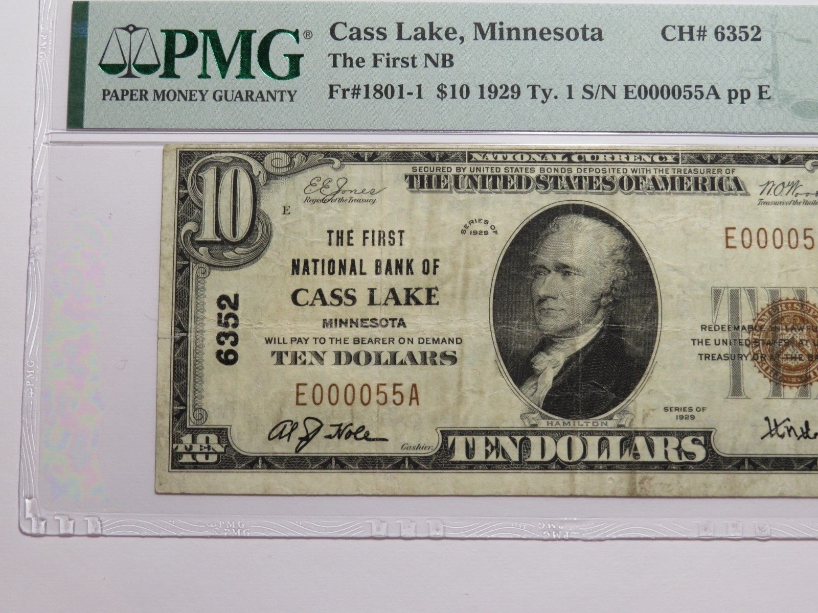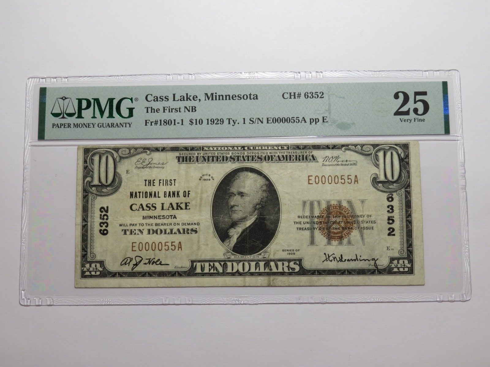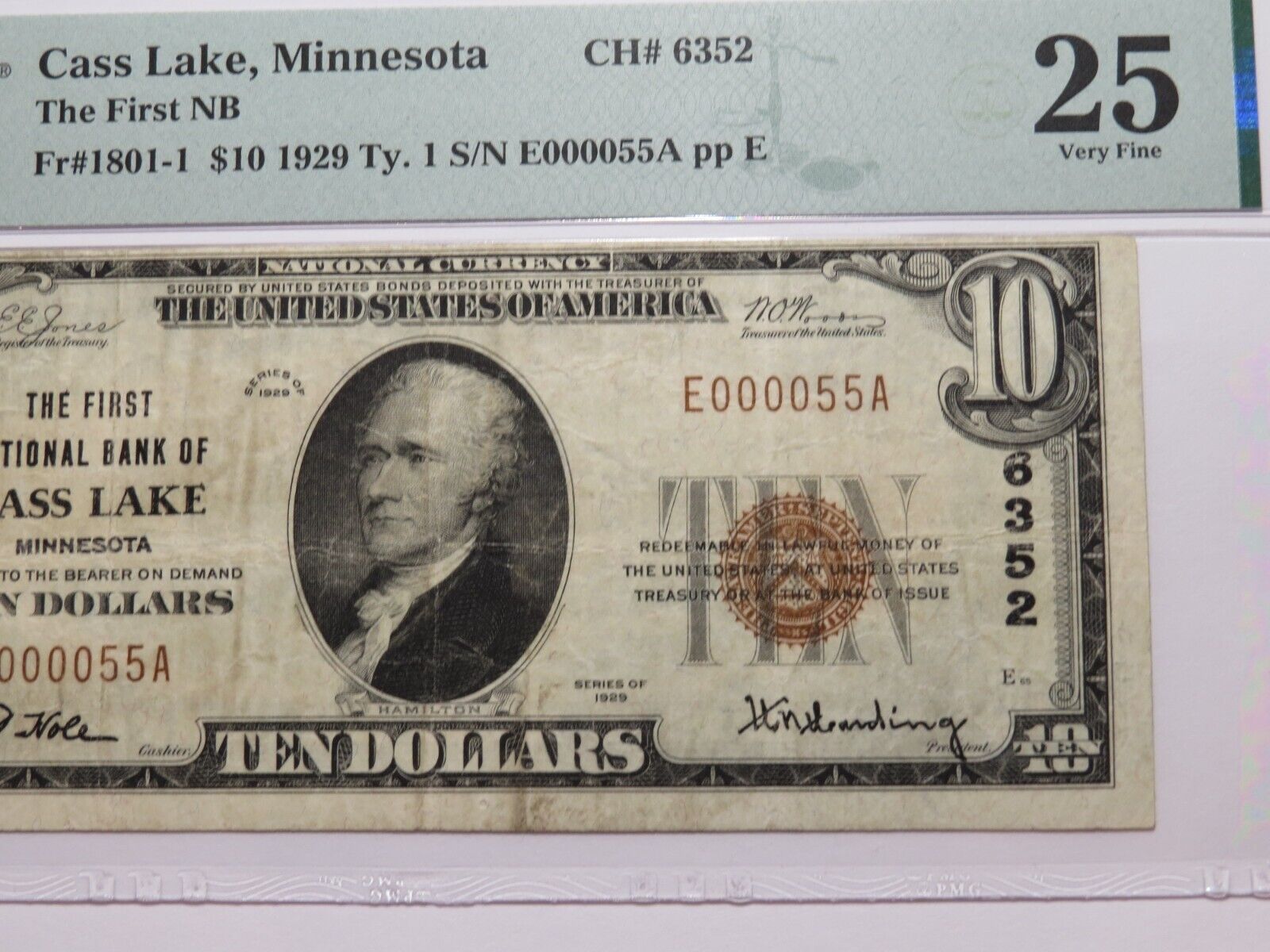 Up for auction is a $10 1929 Cass Lake Minnesota Type 1 National Currency Note. This note was issued by The First National Bank of Cass Lake. It is Charter #6352. This is a ONE BANK TOWN! This note has been graded Very Fine 25 by PMG. This is a problem free note. This bill is a must have for any collector of National Currency!