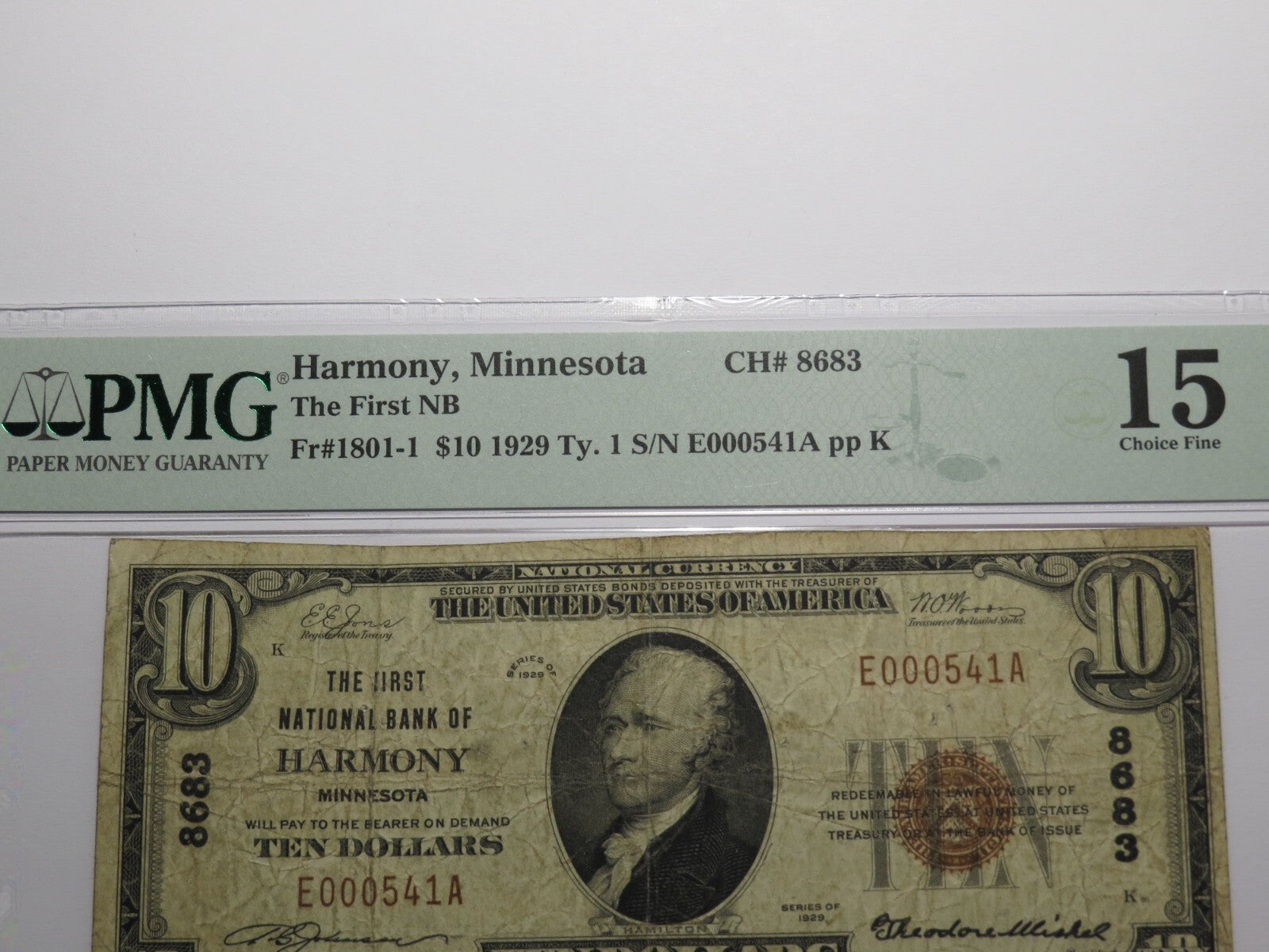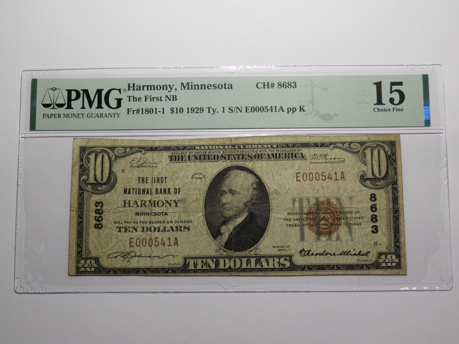 Up for auction is a $10 1929 Harmony Minnesota Type 1 National Currency Note. This note was issued by The First National Bank of Harmony. It is Charter #8683. This is a ONE BANK TOWN you will not see for sale anywhere else! This note has been graded Choice Fine 15 by PMG. This is a problem free note. This bill is a must have for any collector of National Currency!