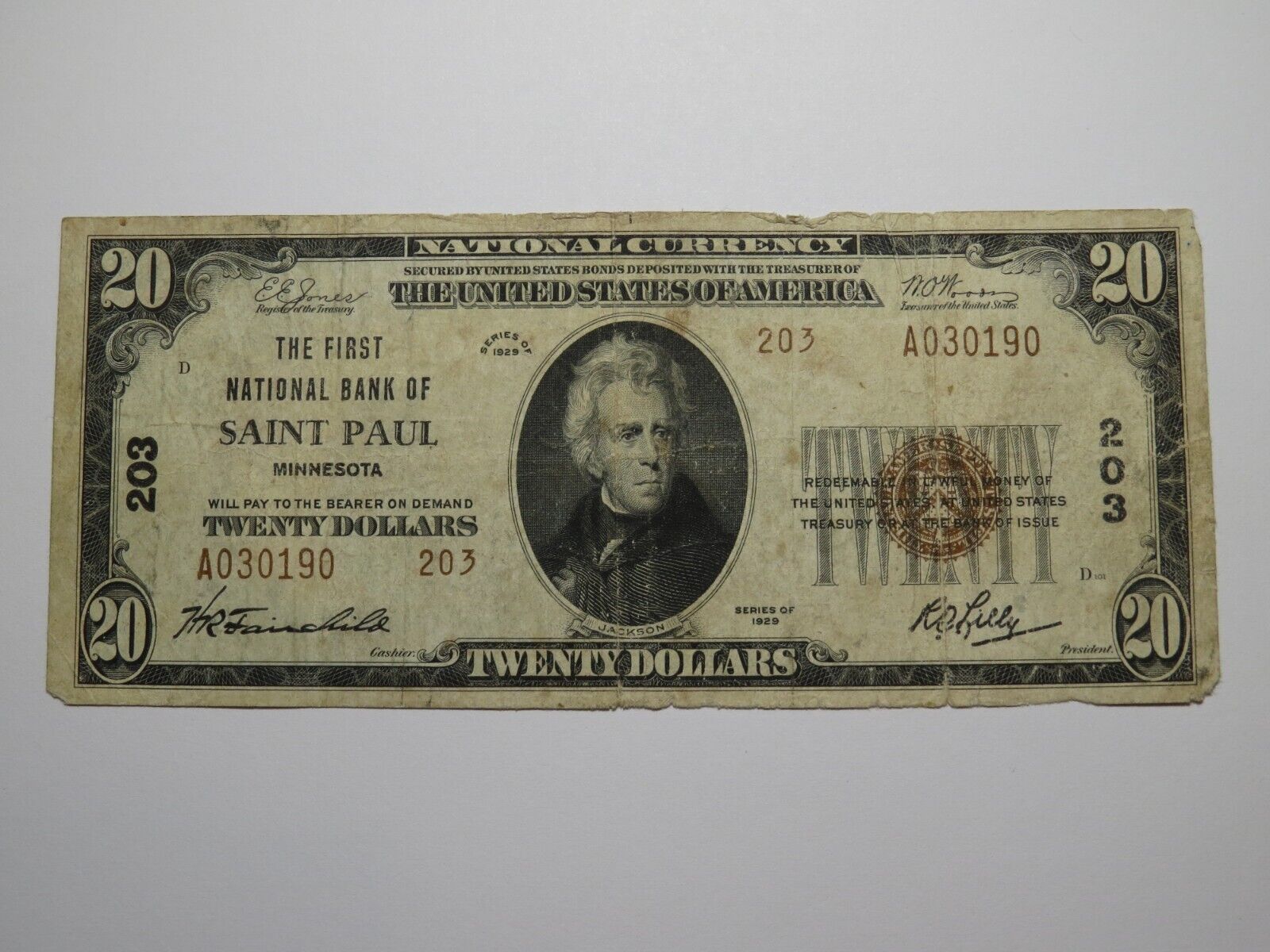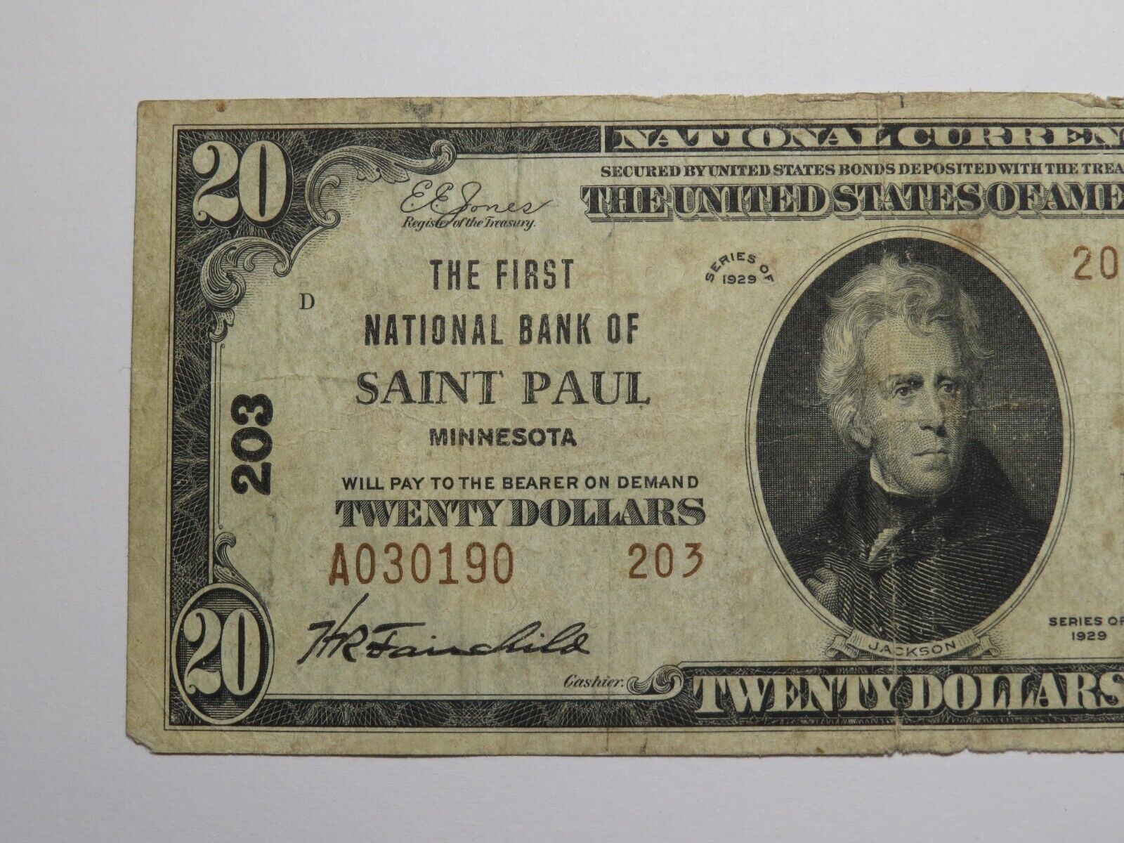 Up for auction is a $20 1929 Saint Paul Minnesota National Currency Note. This note was issued by The First National Bank of Saint Paul. It is Charter #203. This is an always in demand Saint Paul Charter! This note still has a good amount of crisp left to it and is in good overall shape. This note does have a slightly rough upper and lower margin. This bill is a must have for any collector of National Currency. If you have any questions please feel free to ask!