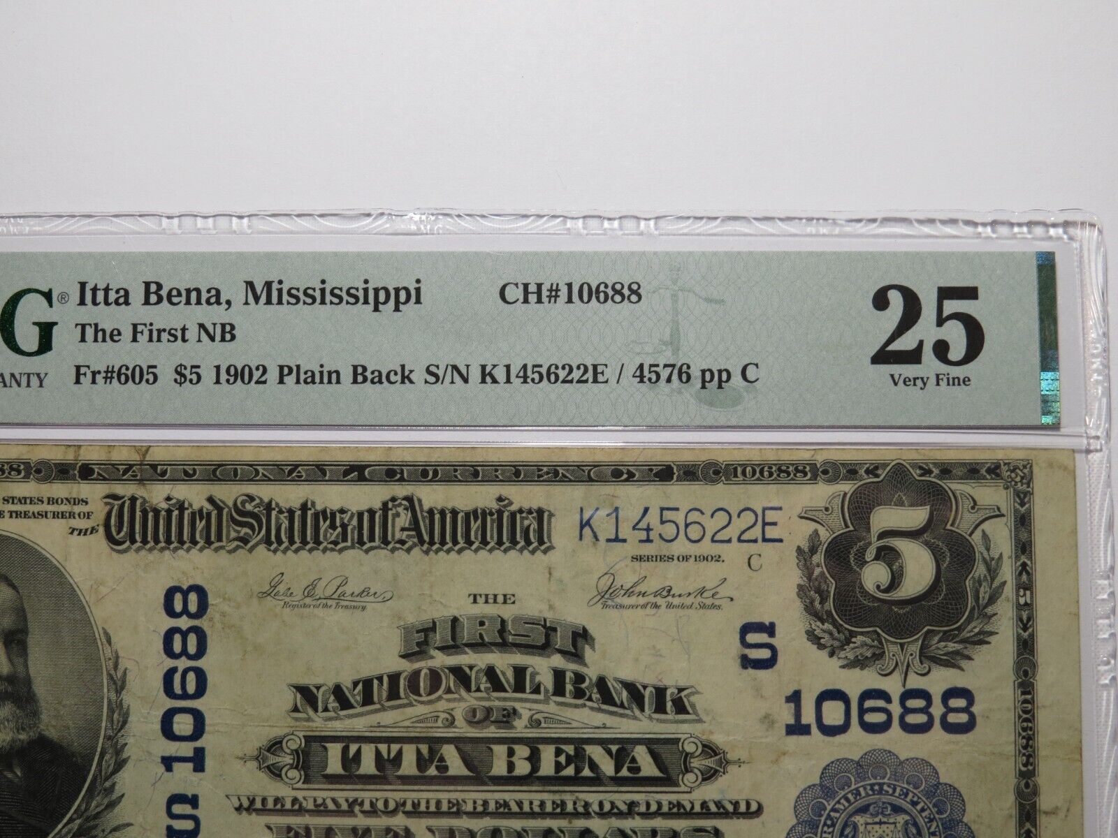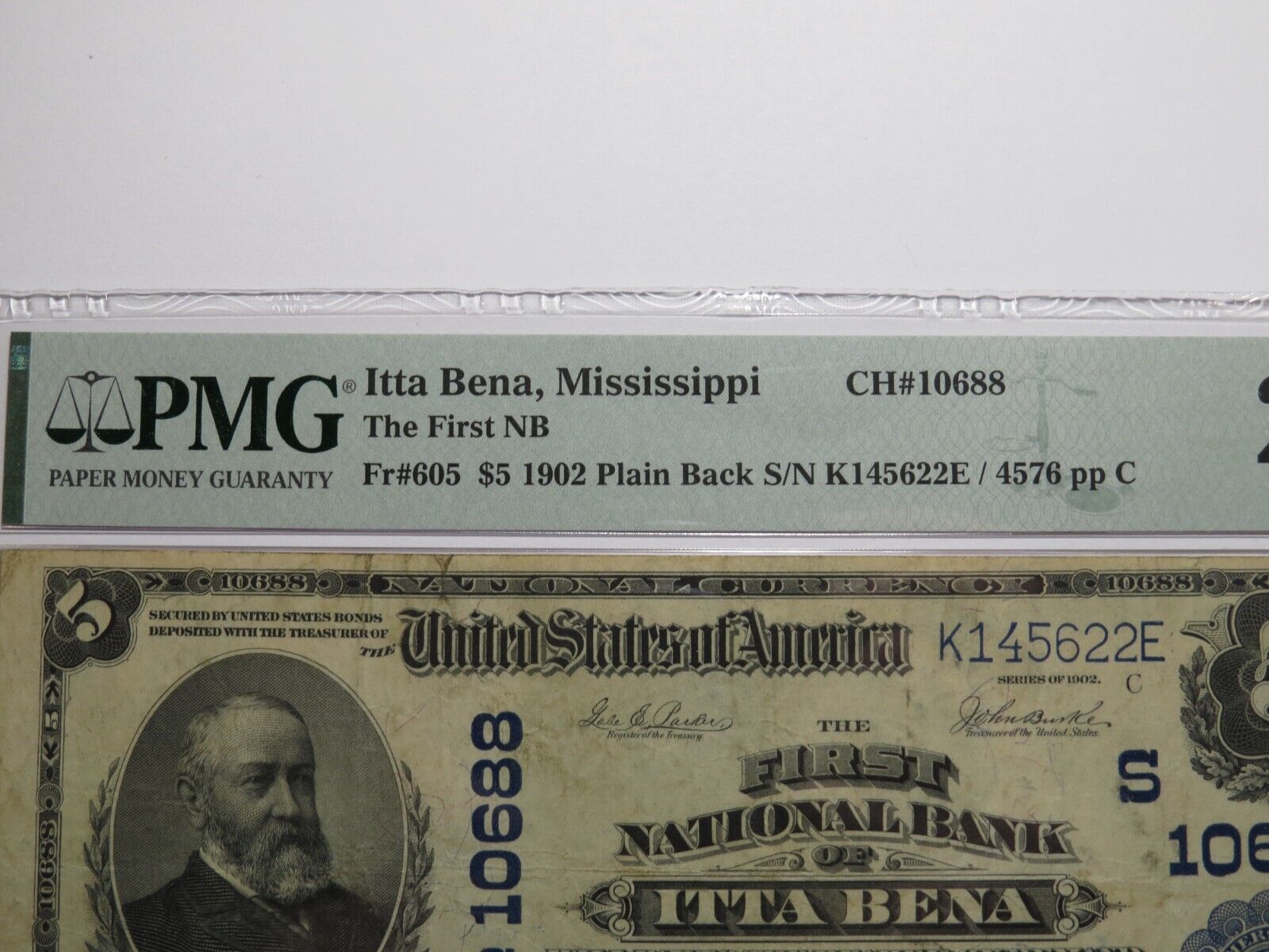 Up for auction is a $5 1902 Itta Bena Mississippi National Currency Note. This note was issued by The First National Bank of Itta Bena. It is Charter #10688. This is a ONE BANK TOWN! This bill has been graded Very Fine 25 by PMG. It is a problem free note. This bill is a must have for any collector of National Currency!