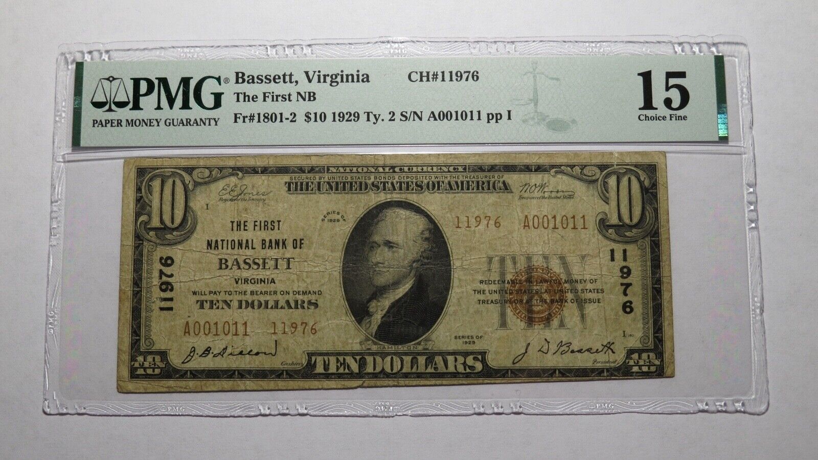 .  It is issued from The First National Bank of Bassett.  It is Charter #11976.  Bassett is a ONE BANK TOWN you will not find anywhere else! This bill has been graded Choice Fine 15 by PMG.  This is a stunningly rare note that is problem free!  This bill is a must have for any collector of National Currency!
