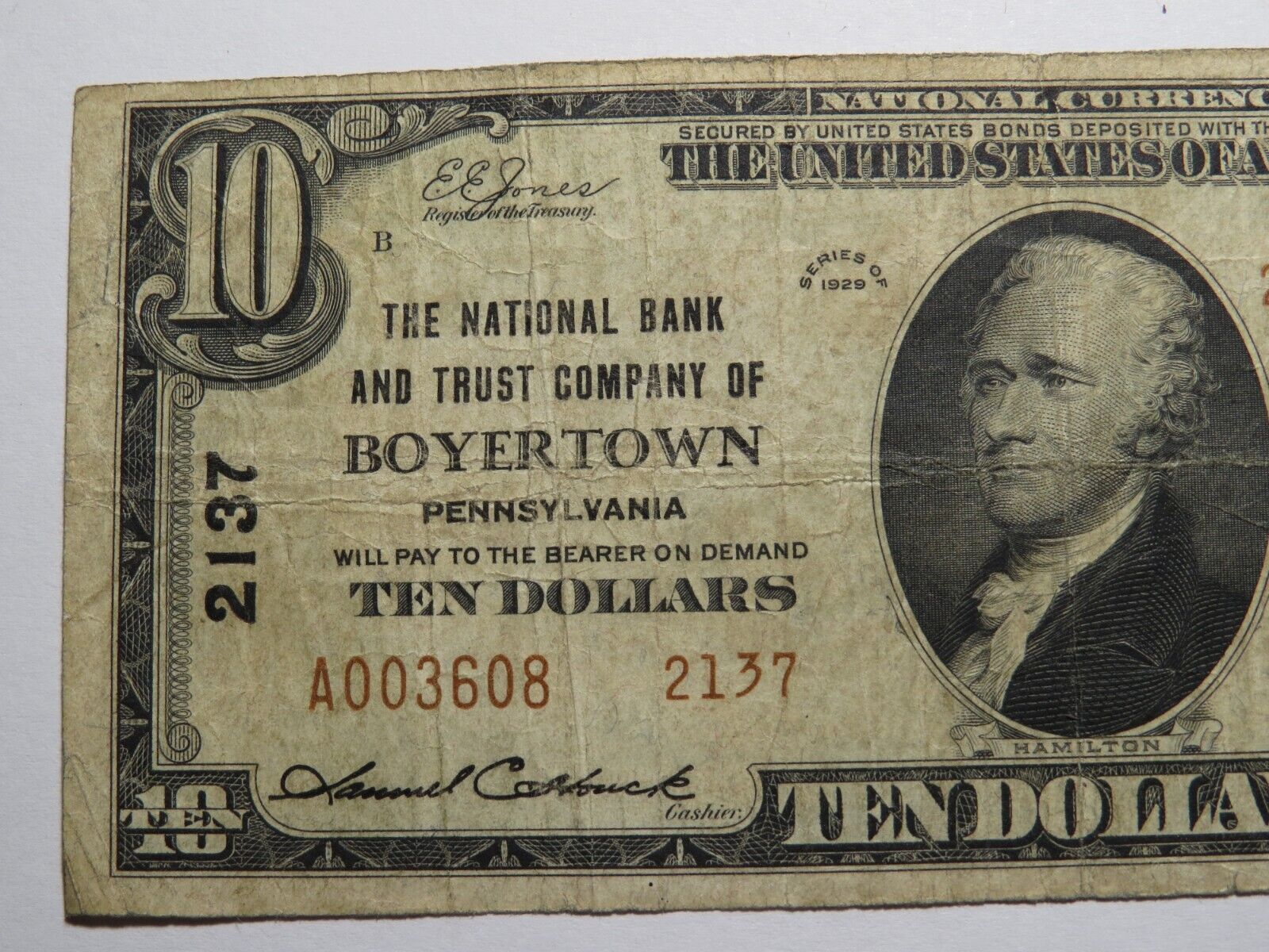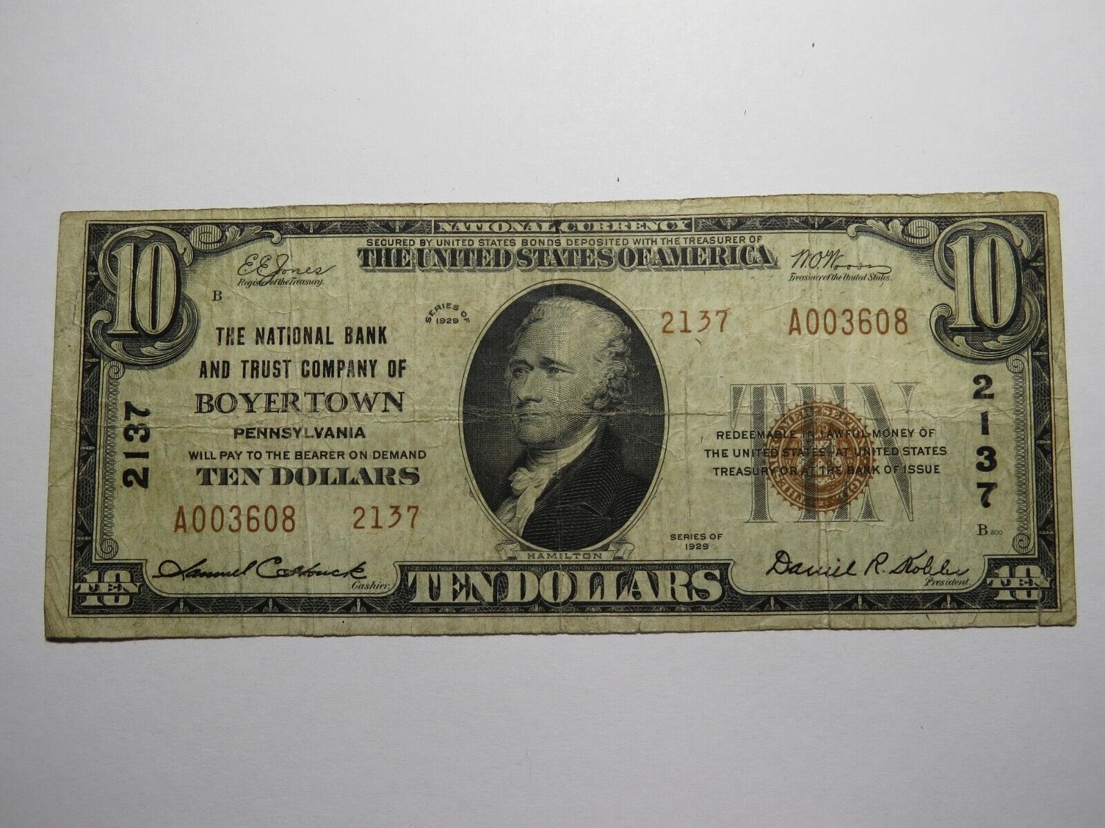Up for auction is a $10 1929 Boyertown Pennsylvania National Currency Note. This note was issued by The National Bank and Trust Company of Boyertown. It is Charter #2137. Boyertown is an always in demand PA town! This note has a good amount of crisp left to it and is in good shape with no issues. This bill is a must have for any collector of National Currency!