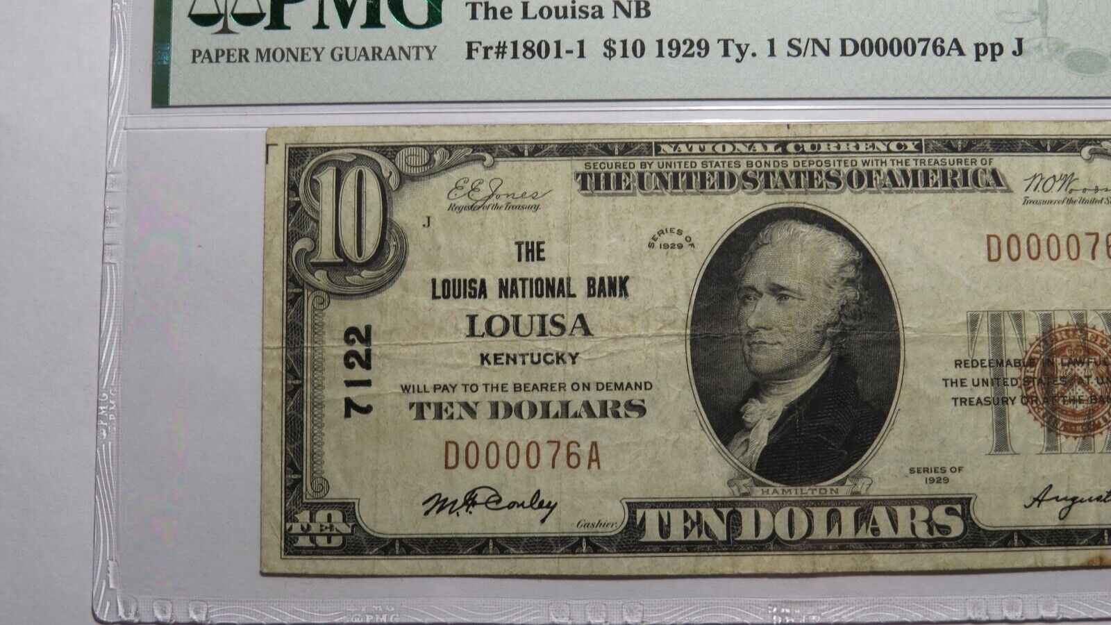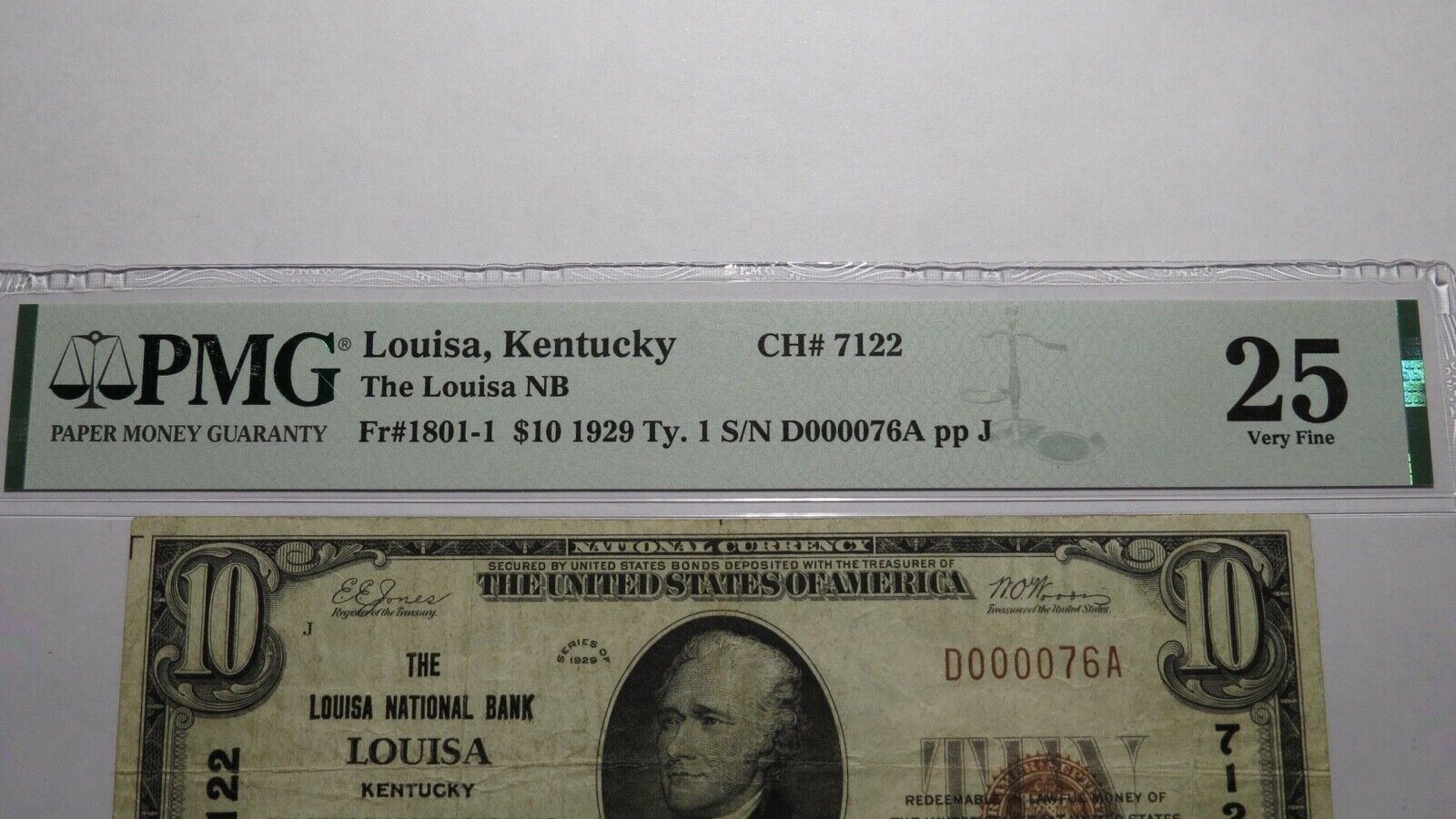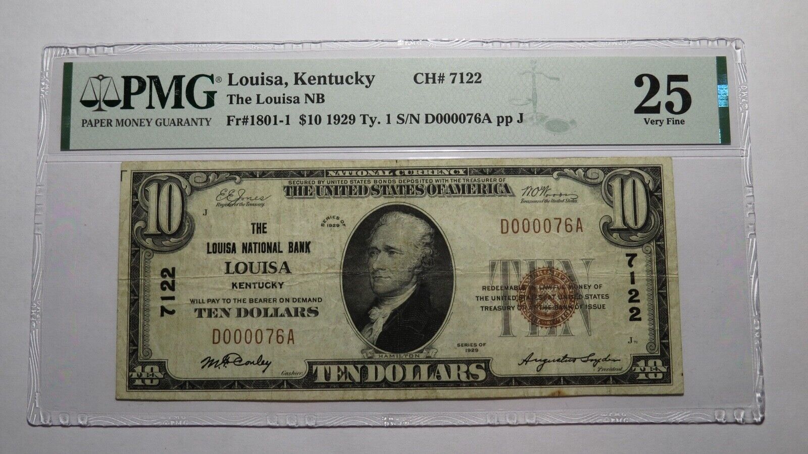 Up for auction is a $10 1929 Louisa Kentucky Type 1 National Currency Note. It is issued from The Louisa National Bank. It is Charter #7122. Louisa is a near IMPOSSIBLE to find Kentucky town! This note is graded Very Fine 25 by PMG. There is absolutely nothing wrong with this note! This bill is a must have for any collector of National Currency!