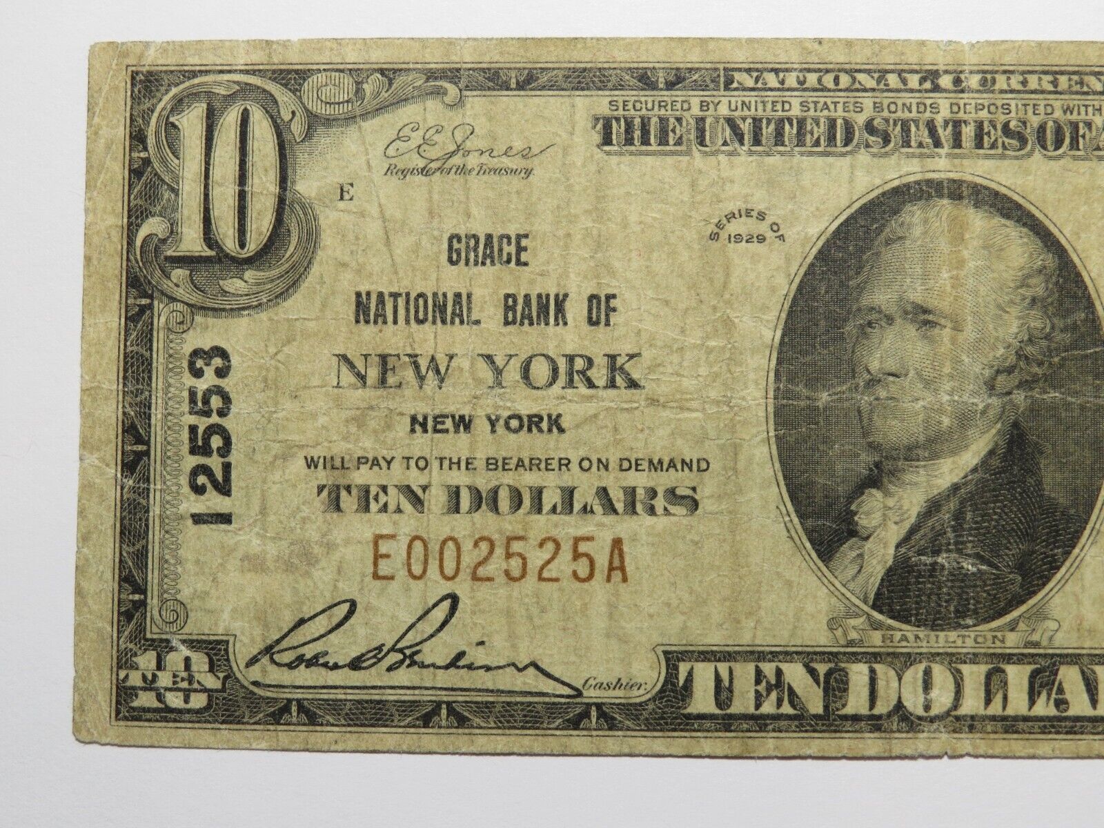 Up for auction is a $10 1929 New York City Type 1 National Currency Note. This note was issued by The Grace National Bank. It is Charter #12553. This is an always in demand NYC Charter! This note shows solid circulation but is free of any major issues. If you have any questions please feel free to ask!