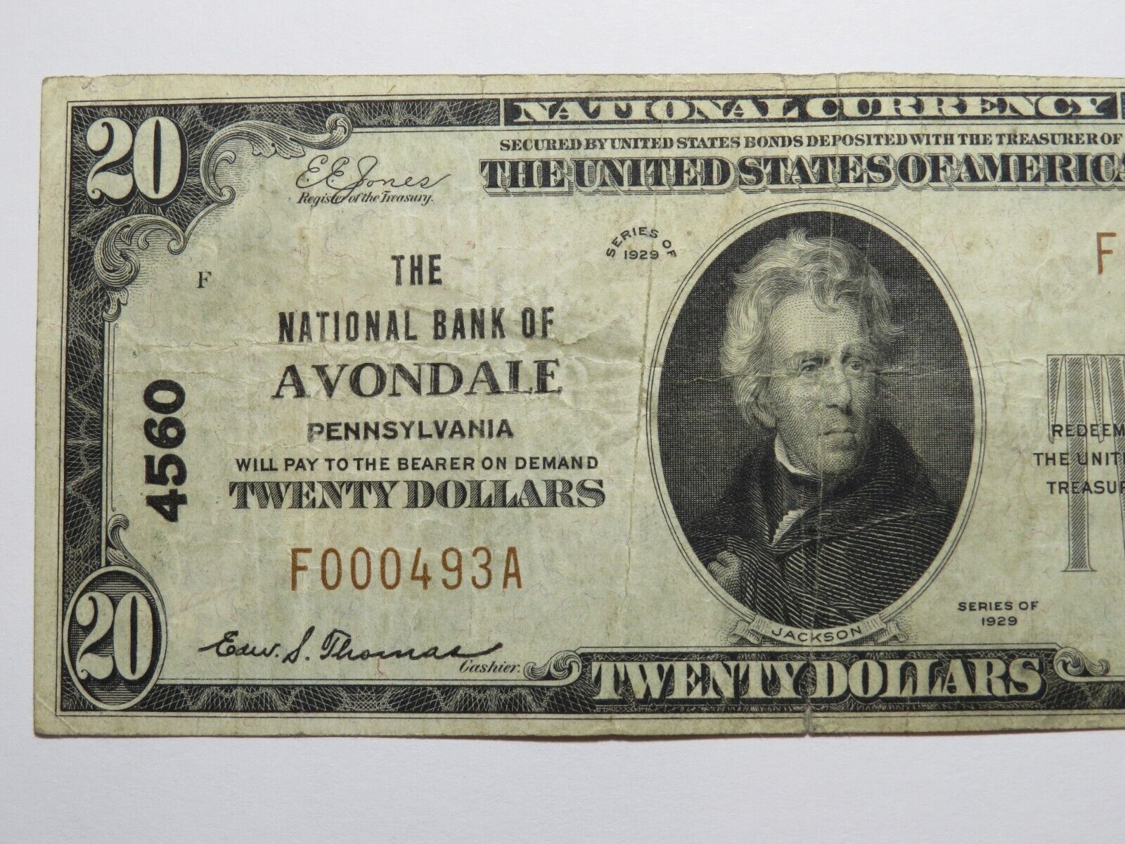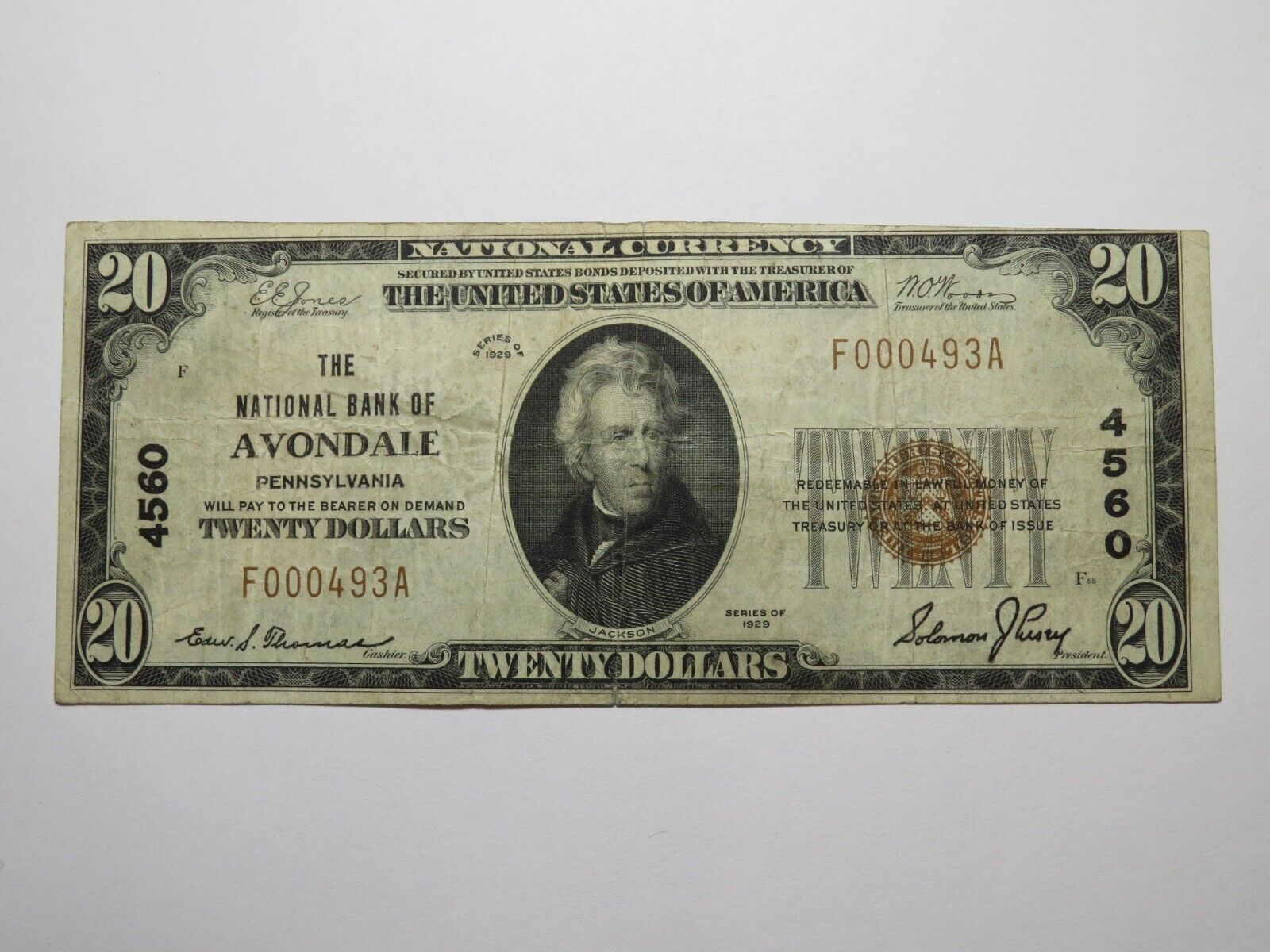 Up for auction is a $20 1929 Avondale Pennsylvania Type 1 National Currency Note. This note was issued by The National Bank of Avondale. It is Charter #4560. This is a ONE BANK TOWN! This note still has a good amount of crisp left to it and is in great shape with no issues. This bill is a must have for any collector of National Currency!