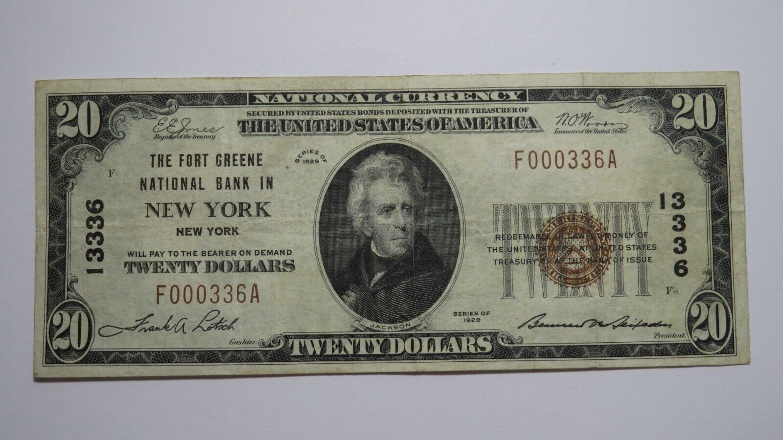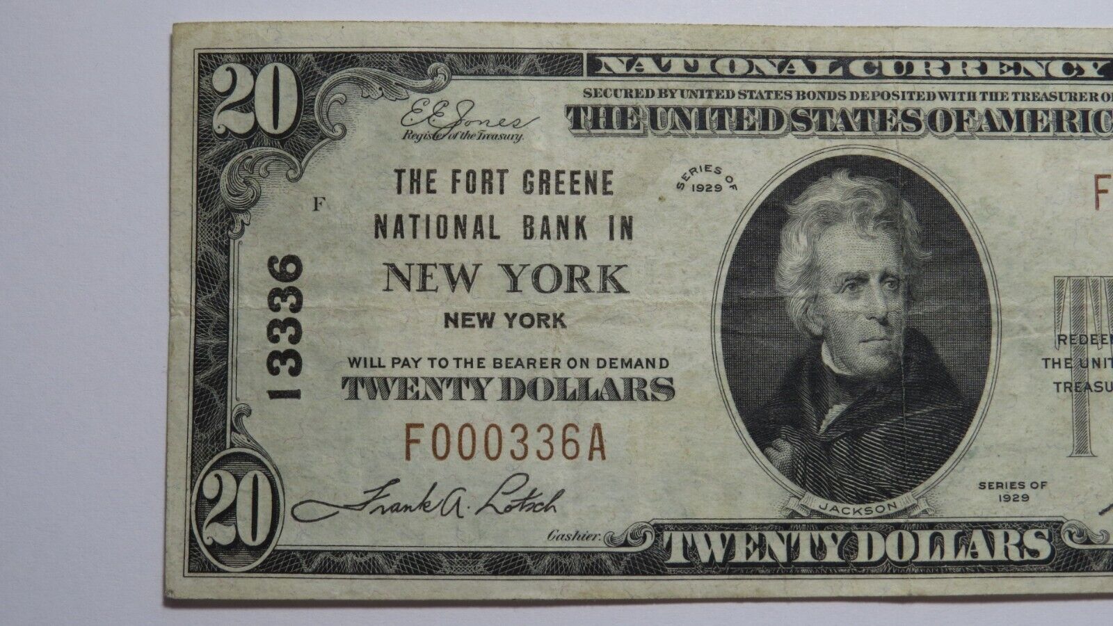 Up for auction is a $20 1929 New York City New York Type 1 National Currency Note. This note was issued by The Fort Greene National Bank in New York. It is Charter #13336. The Fort Greene National Bank is a tough to find New York Charter! This note has a ton of crisp left to it and is in great shape with zero issues. It is a great rare bill! This bill is a must have for any collector of National Currency!