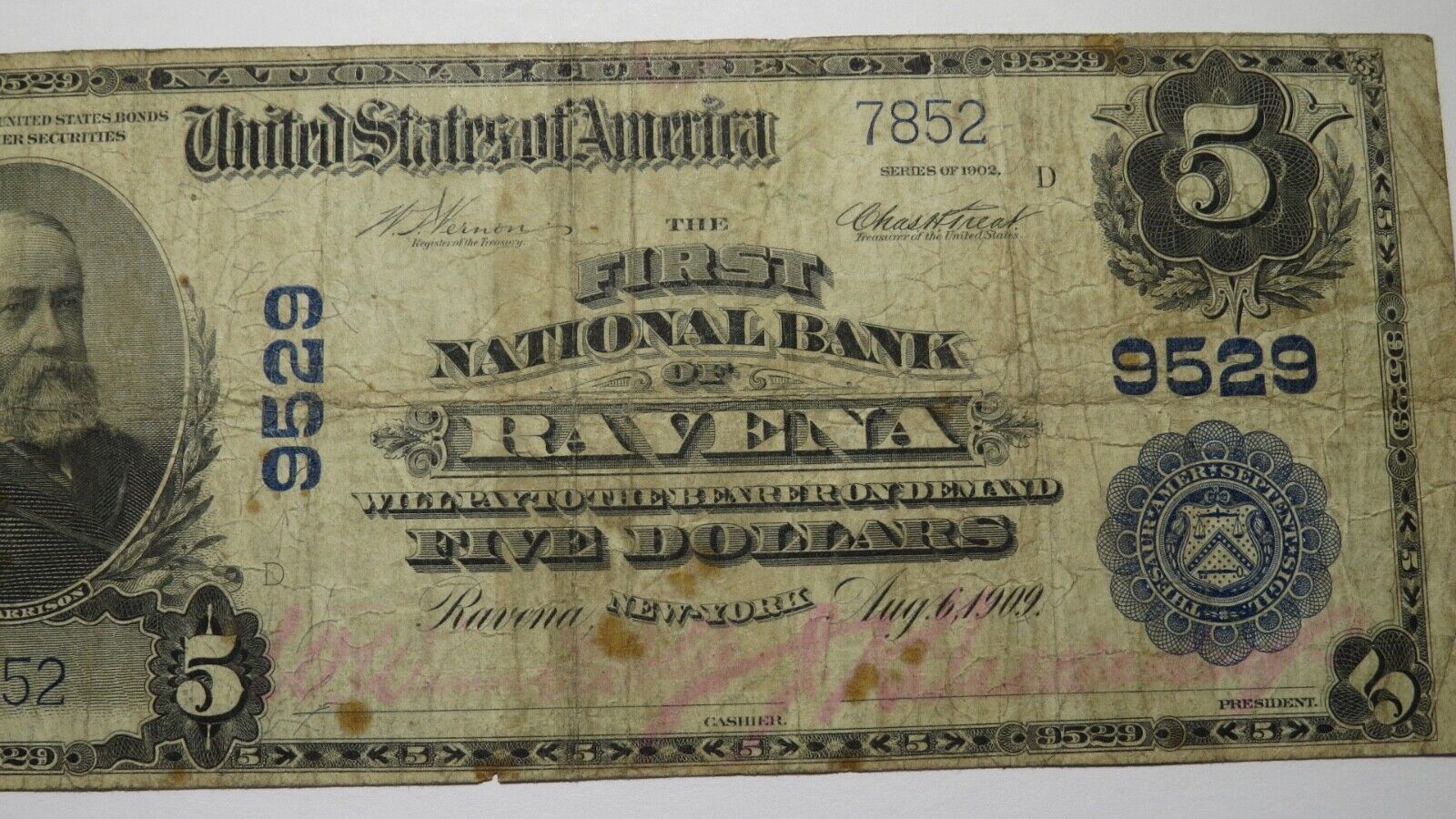 Up for auction is a $5 1902 Ravena New York Plain Back National Currency Note. It is issued from The First National Bank Of Ravena. It is Charter #9529. This is a ONE BANK TOWN you will not find anywhere else! This bill still has some good crisp to it and is in good shape with no major issues. This bill is a must have for any collector of National Currency!