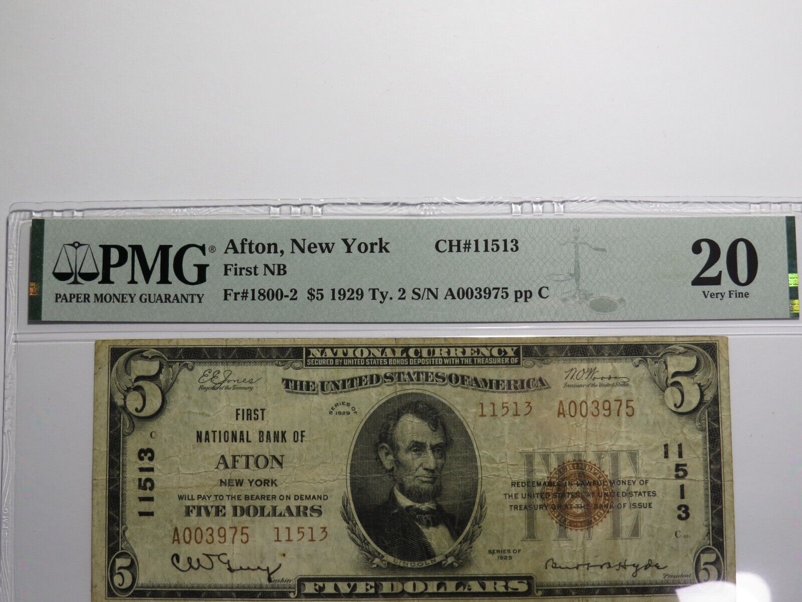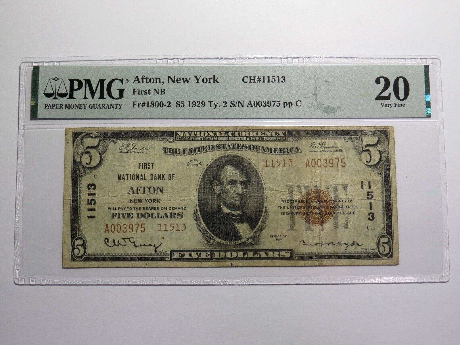 $5 1929 Afton New York NY National Currency Bank Note Bill Ch. #11513 VF20 PMG