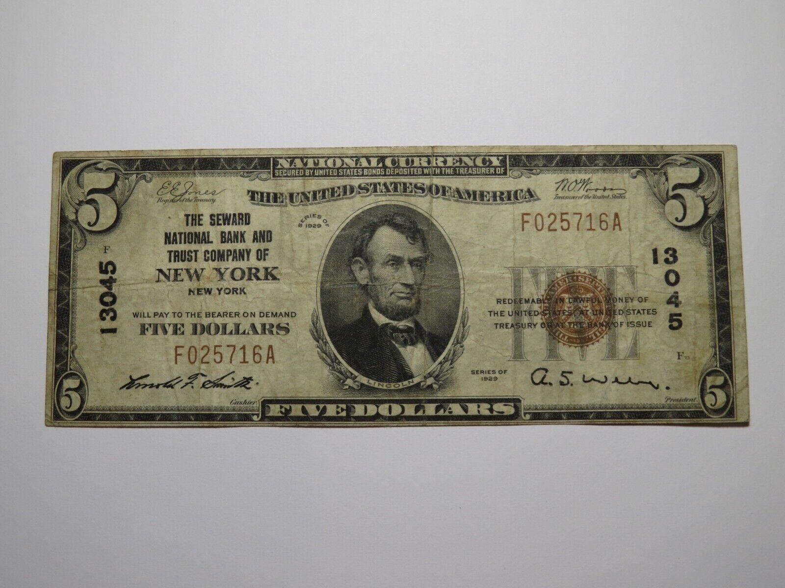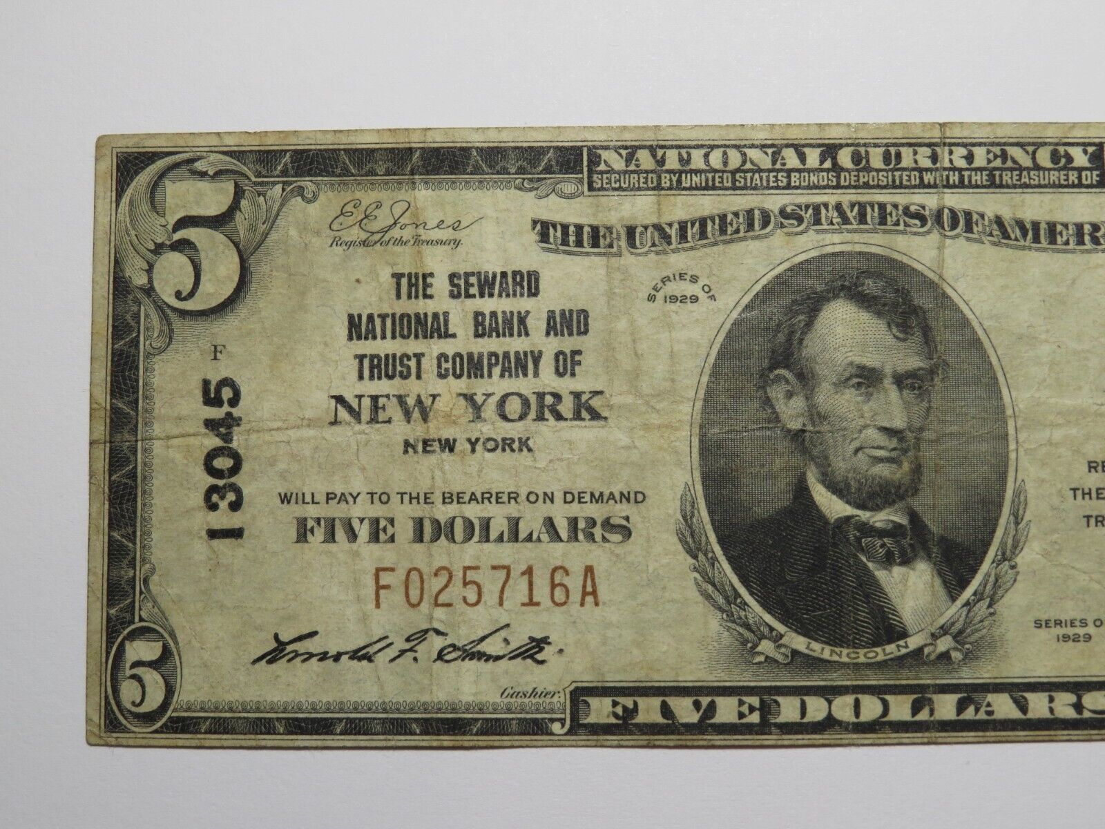 Up for auction is a $5 1929 New York City National Currency Note. This note was issued by The Seward National Bank and Trust Company of New York. It is Charter #13045. This is a tough to find NYC Charter! This note has a good amount of crisp left to it and is in good shape with no issues. This bill is a must have for any collector of National Currency!